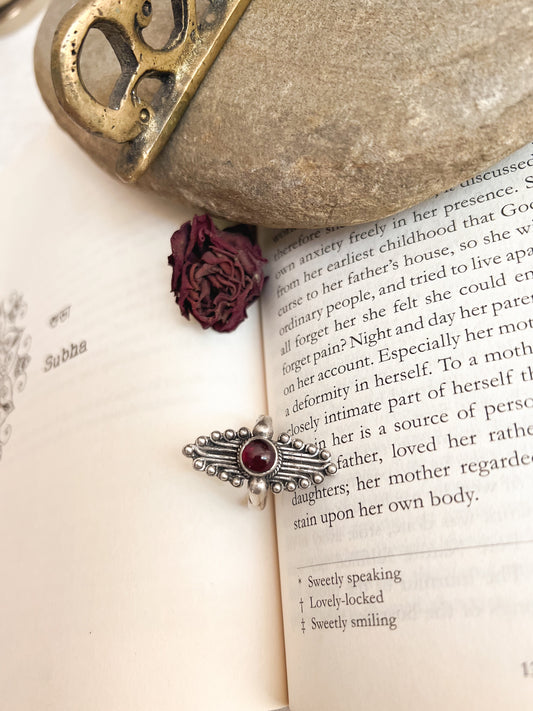 Dhala oxidised silver ring with garnet stone (adjustable)