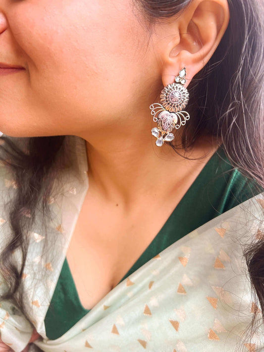 Mokshi oxidised silver danglers with cluster pearls and kundan detail