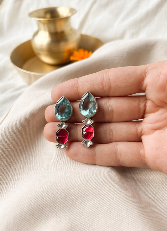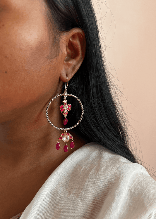 Indrani oxidised silver earrings with green and ruby onyx and cluster pearls