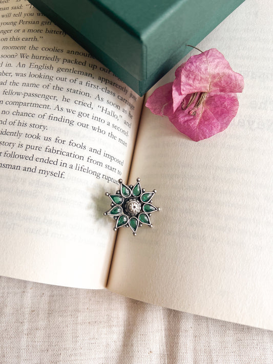 Zoya flower ring in oxidised silver with green stone (adjustable)