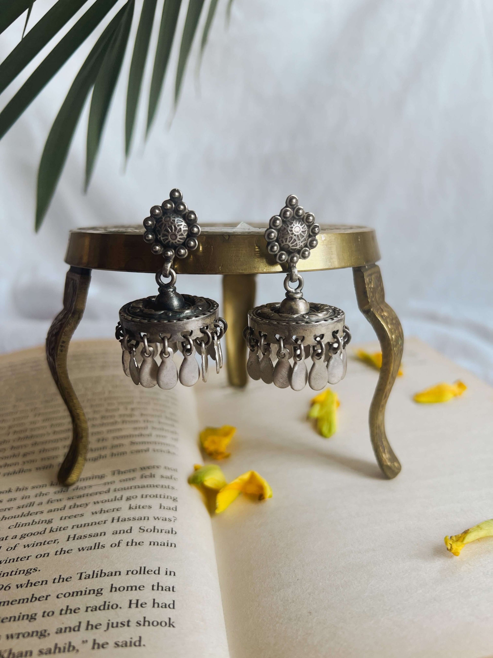 Bring back vintage in our silver oxidized earrings with leaf hangings, and flower motif top with pushbacks. These humkas will add charm to your haldi outfits or your casual white kurtas for holi.