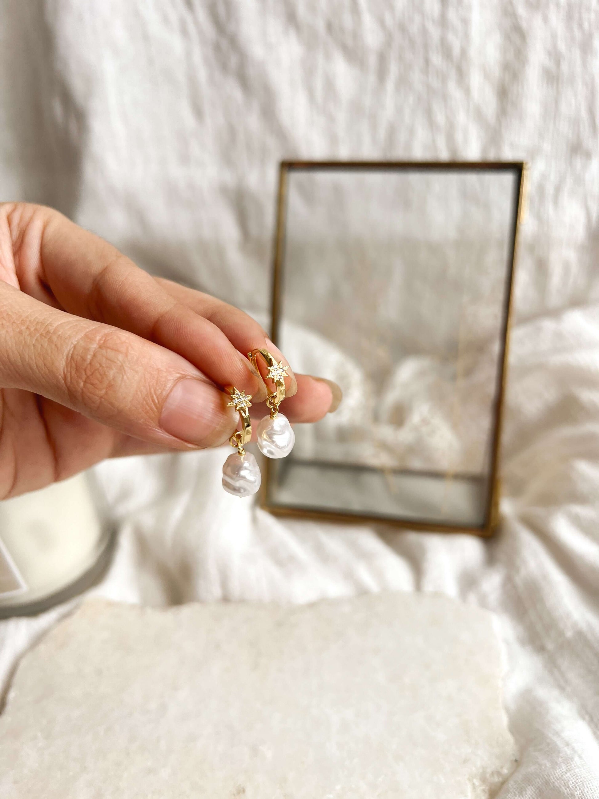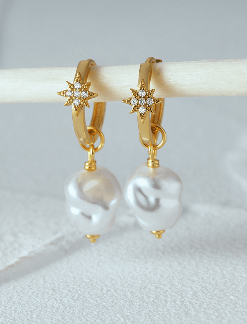 Featuring a chic starburst motif on the hoop. These elegant earrings are adorned with a dangling baroque pearl, adding a touch of sophistication. Perfect for daily wear, they combine classic beauty with modern design.