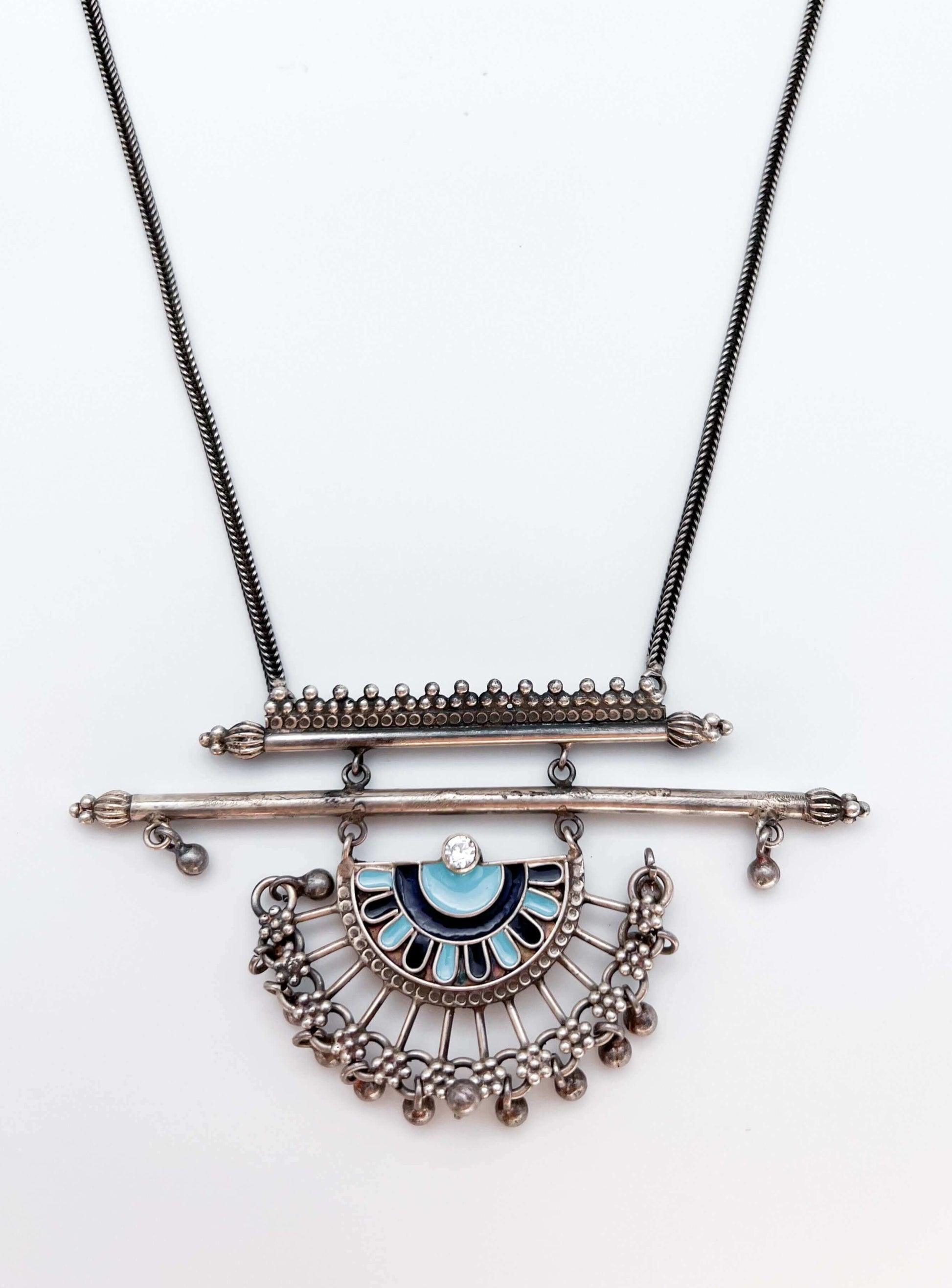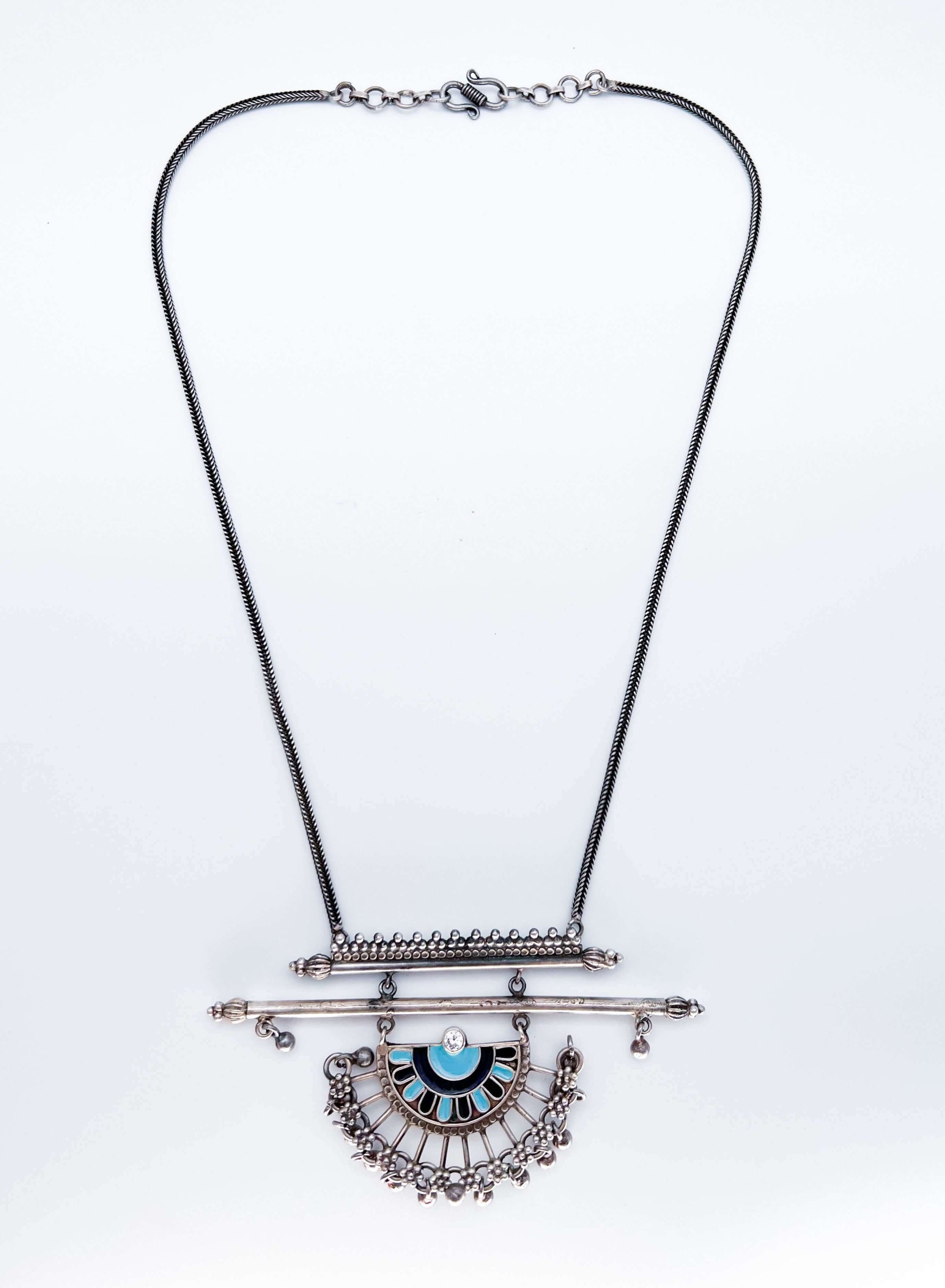 The intricate chain gracefully embraces the neck, while a magnificent pendant steals the spotlight. The pendant features a captivating rising sun motif in vibrant enamel with silver ghunghroo adorning the ends, symbolizing hope, new beginnings. The motif is suspended from a detailed bar.