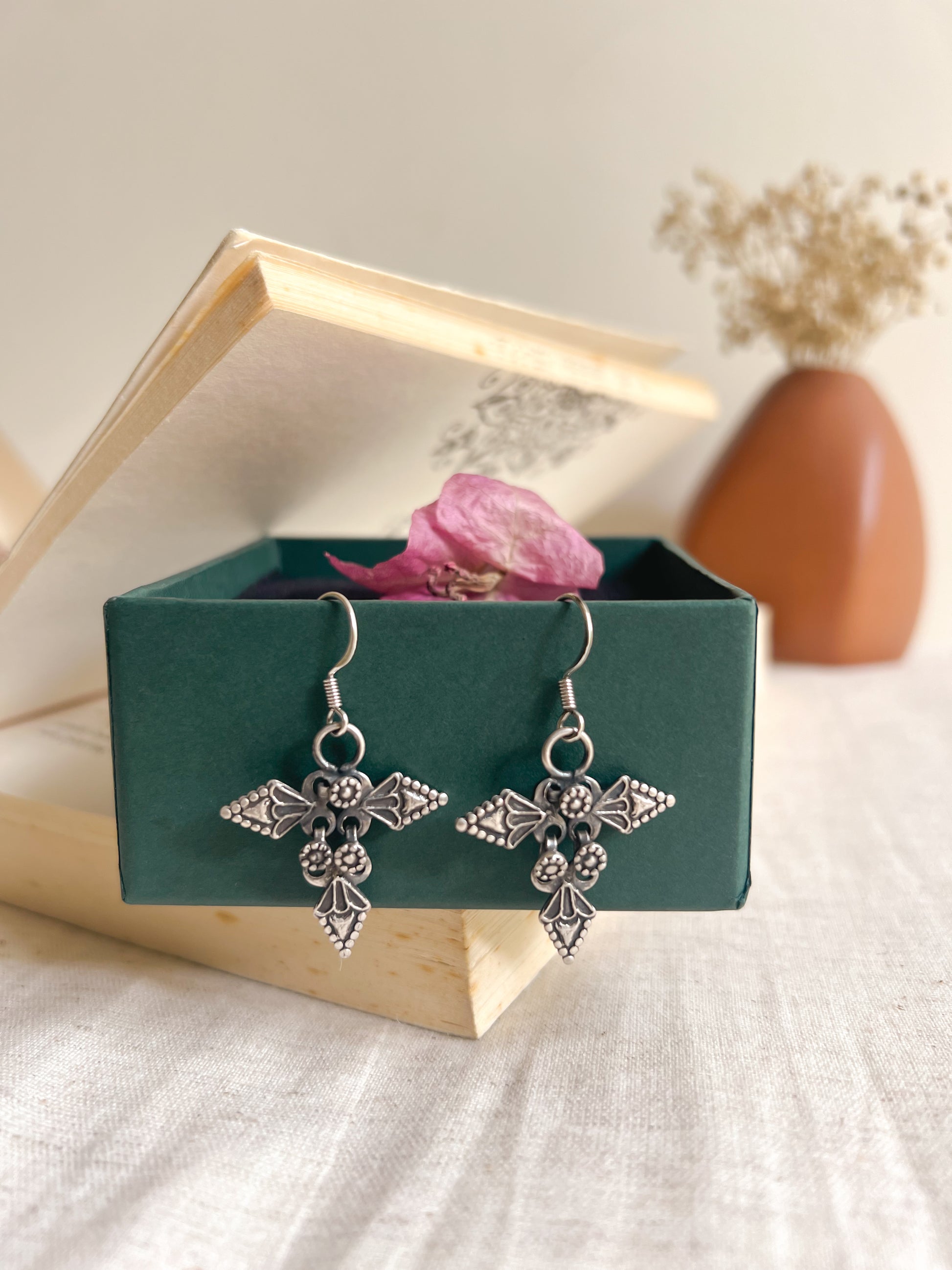 These fishhook earrings are handcrafted in silver oxidised finish studded with dainty details and flower buds charm hanging , a timeless accessory with an Indian touch ; perfect to add a hint of elegance and festive glamour to your look!