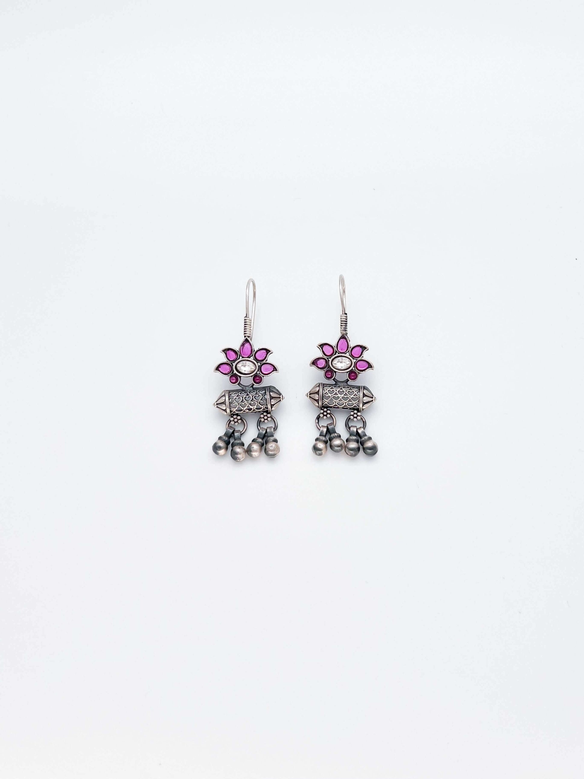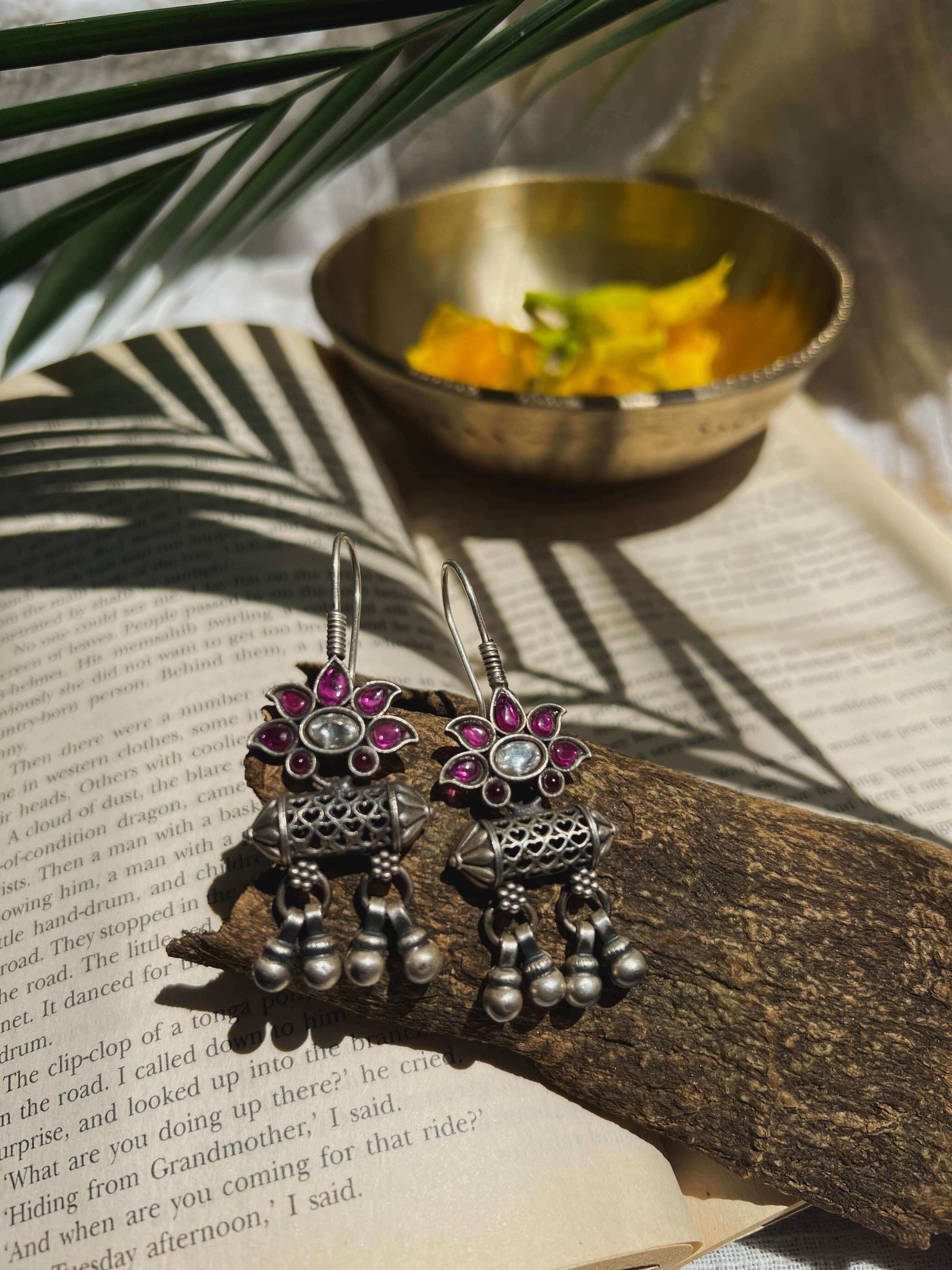 These fishhook earrings are handcrafted in silver oxidised finish studded with pink glass stone flower with white centre stone, continues to taweez motif and silver ghunghroo hangings.