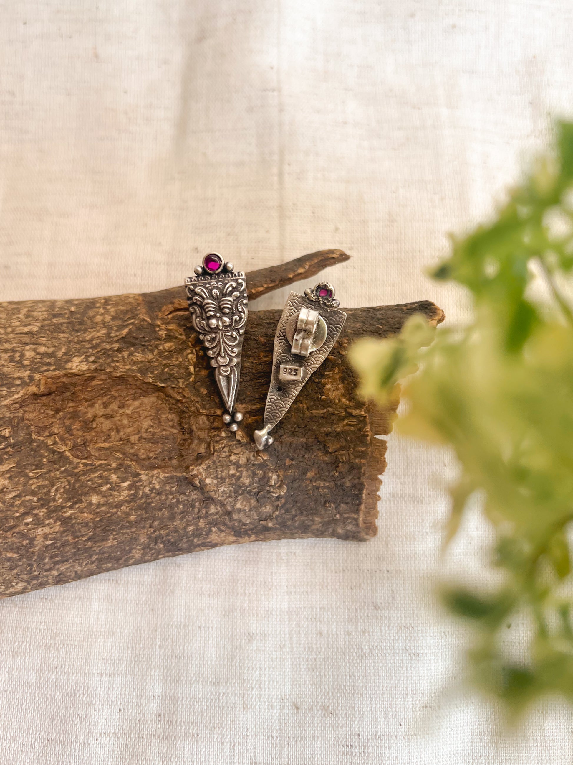 With this gorgeous earring add that extra zing to your outfit.These silver earrings have a pink stone on top and an inverted triangular motif with intricate temple inspired details embossed. Its very lightweight and easy to pair.