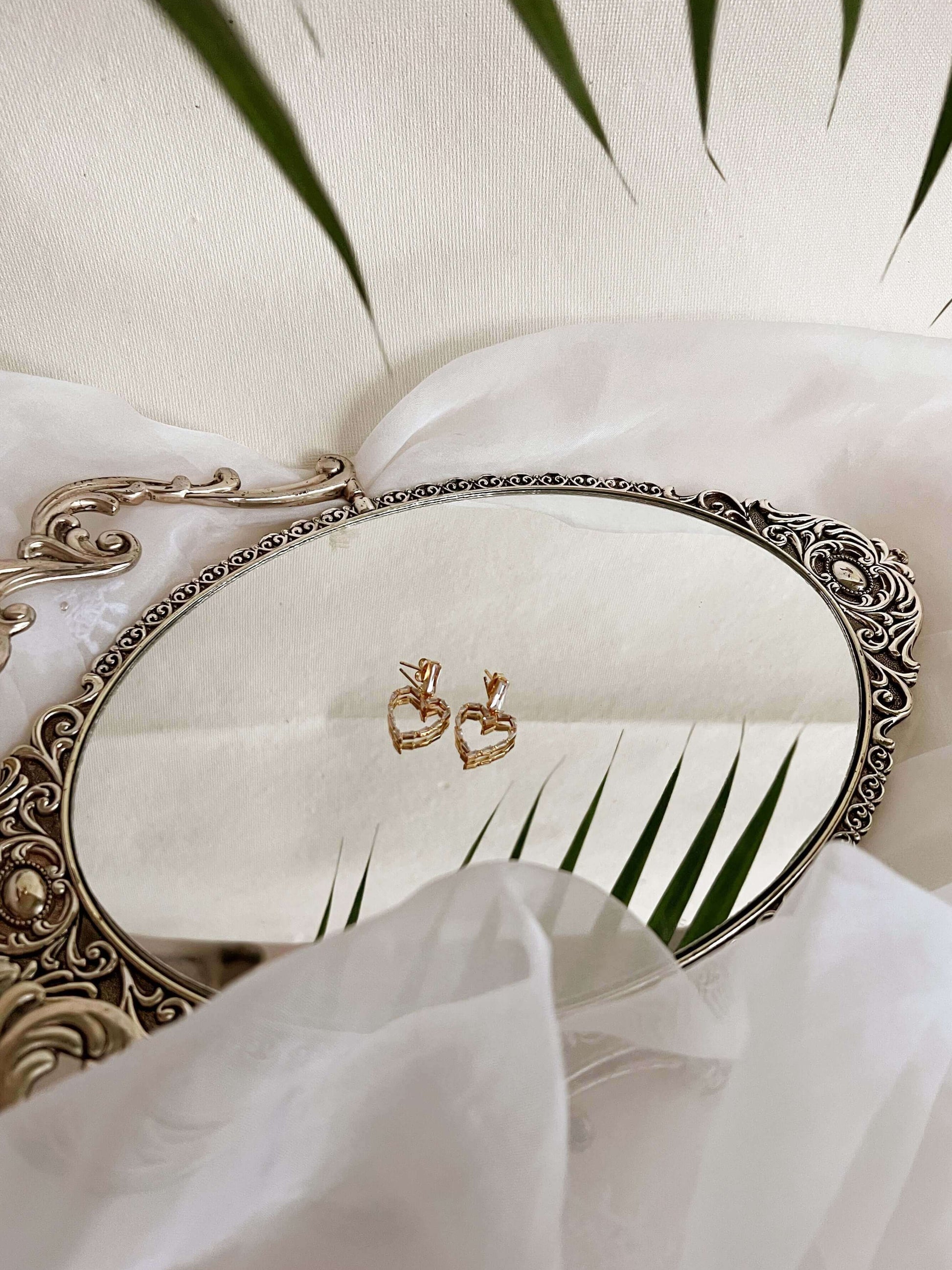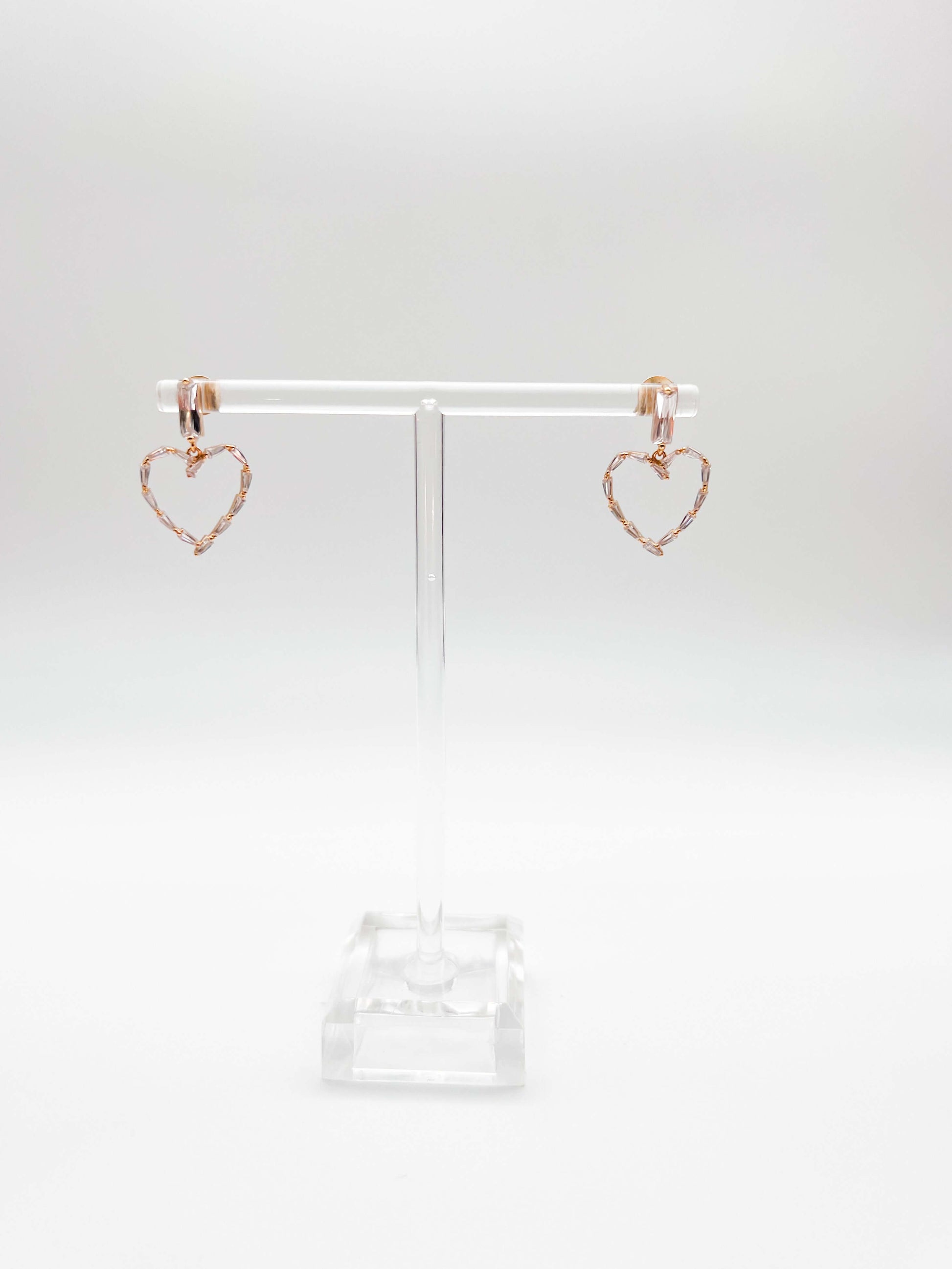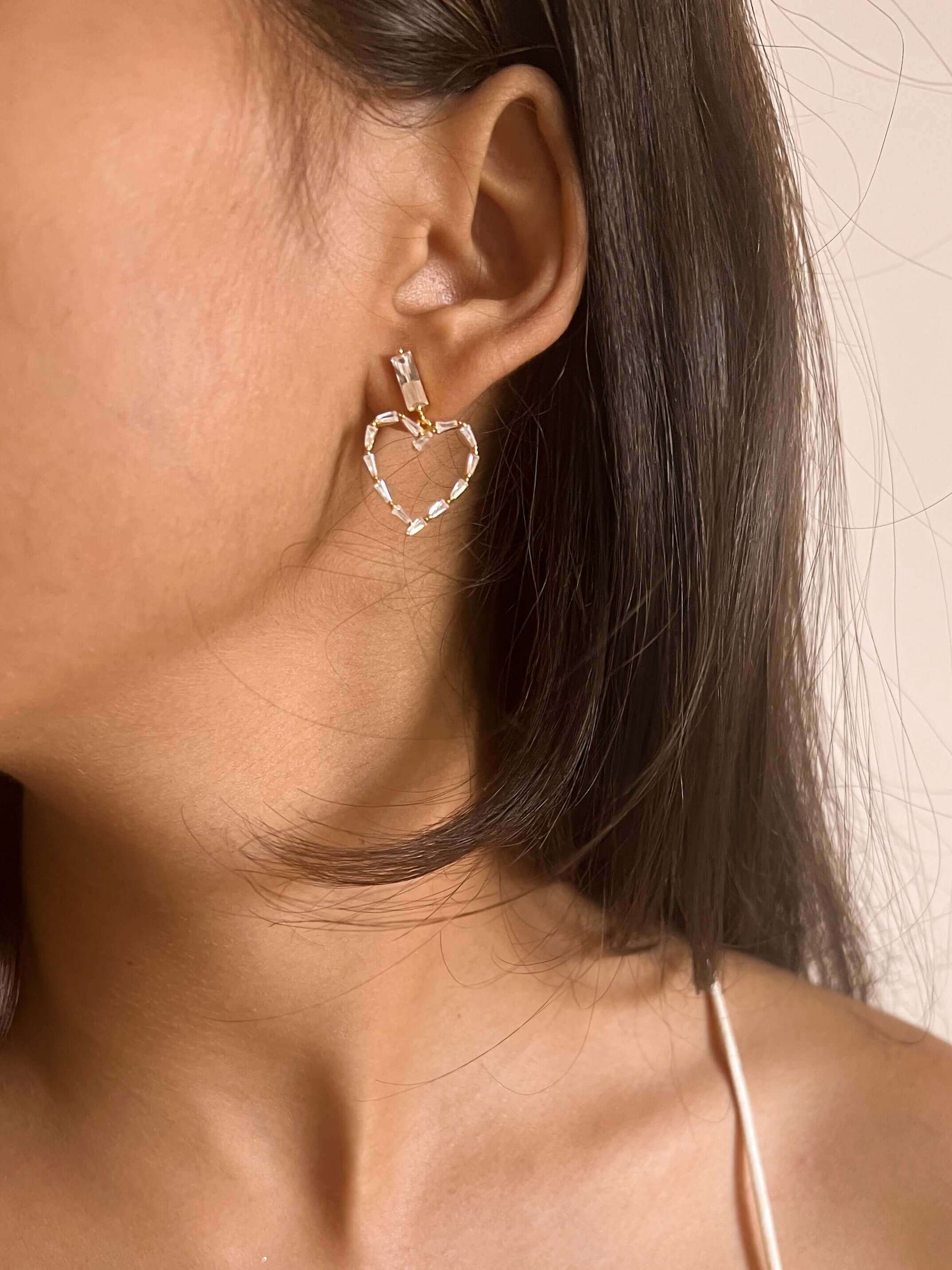 These earrings are a true statement piece , it has a big heart outline charm hanging from a small bar topper , with crystals studded around. The gold-plated earrings are a dazzling piece , adding glamour to any outfit you pair it up with.
