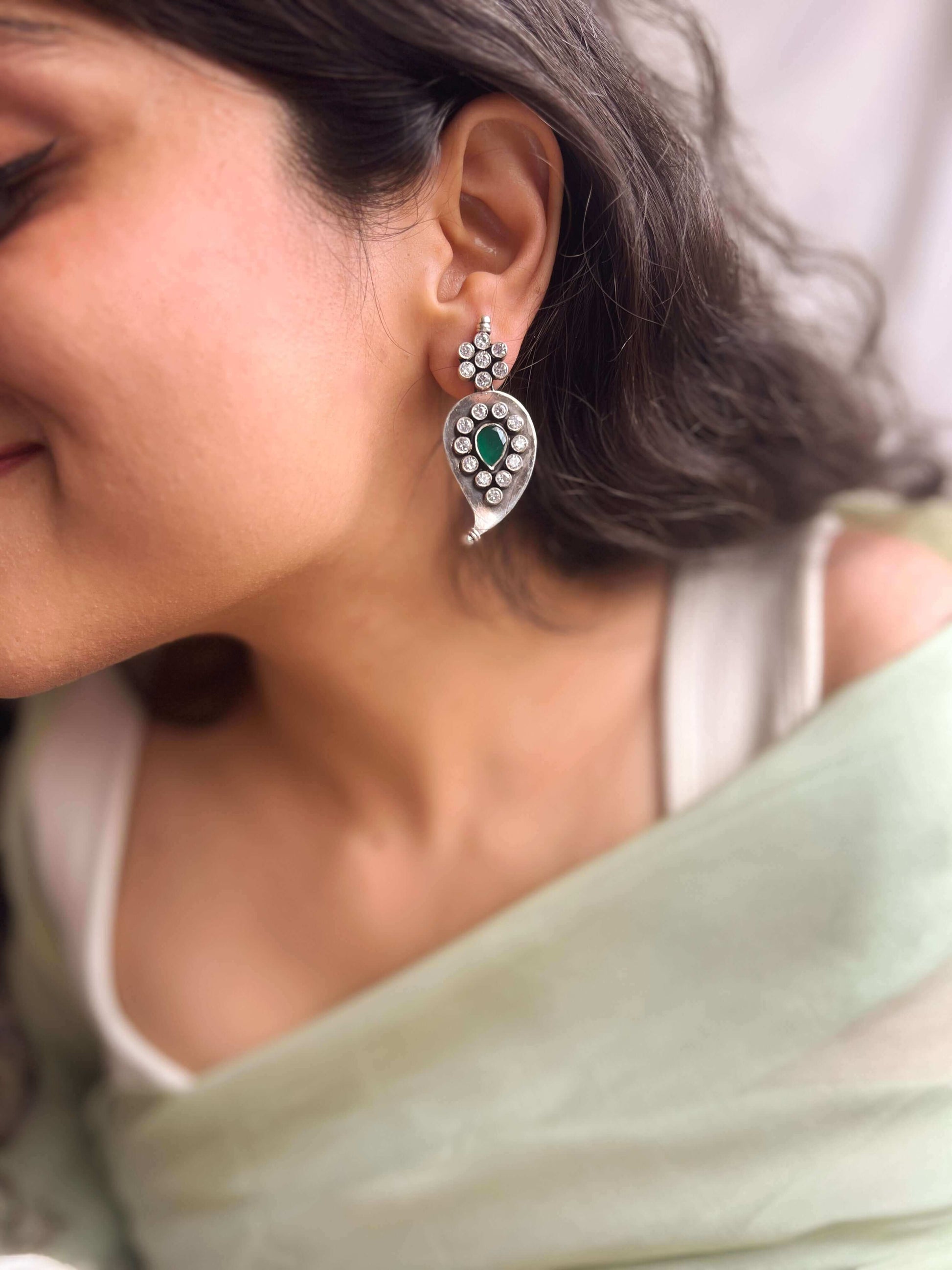 The paisley shaped silver design is accented with a tear drop emerald glass stone and zircons. The earrings are lightweight and comfortable to wear, making them perfect for all-day wear. They come with a push back closure to ensure they stay in place.