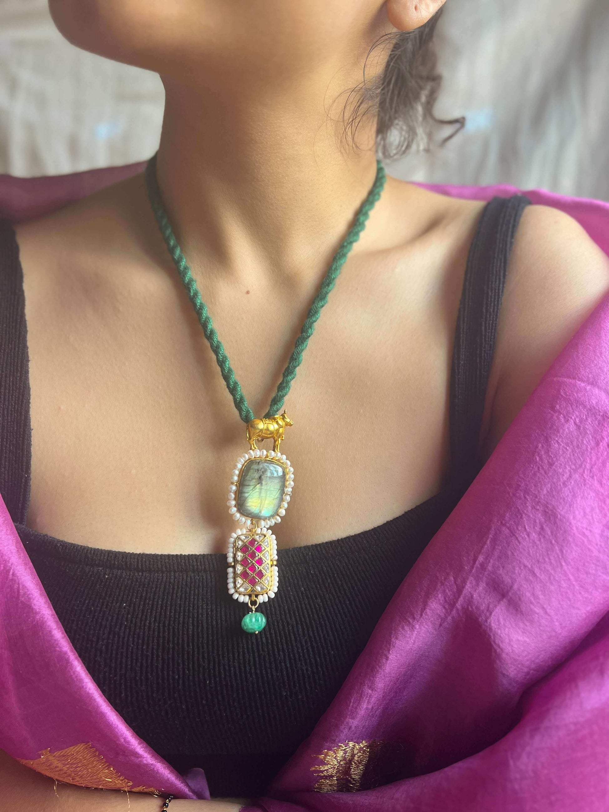 This beautiful pendant has labradorite stone which itself has mystic charm, and a checkered kundan tukdi. It comes with a matching rope which has loop fastening.