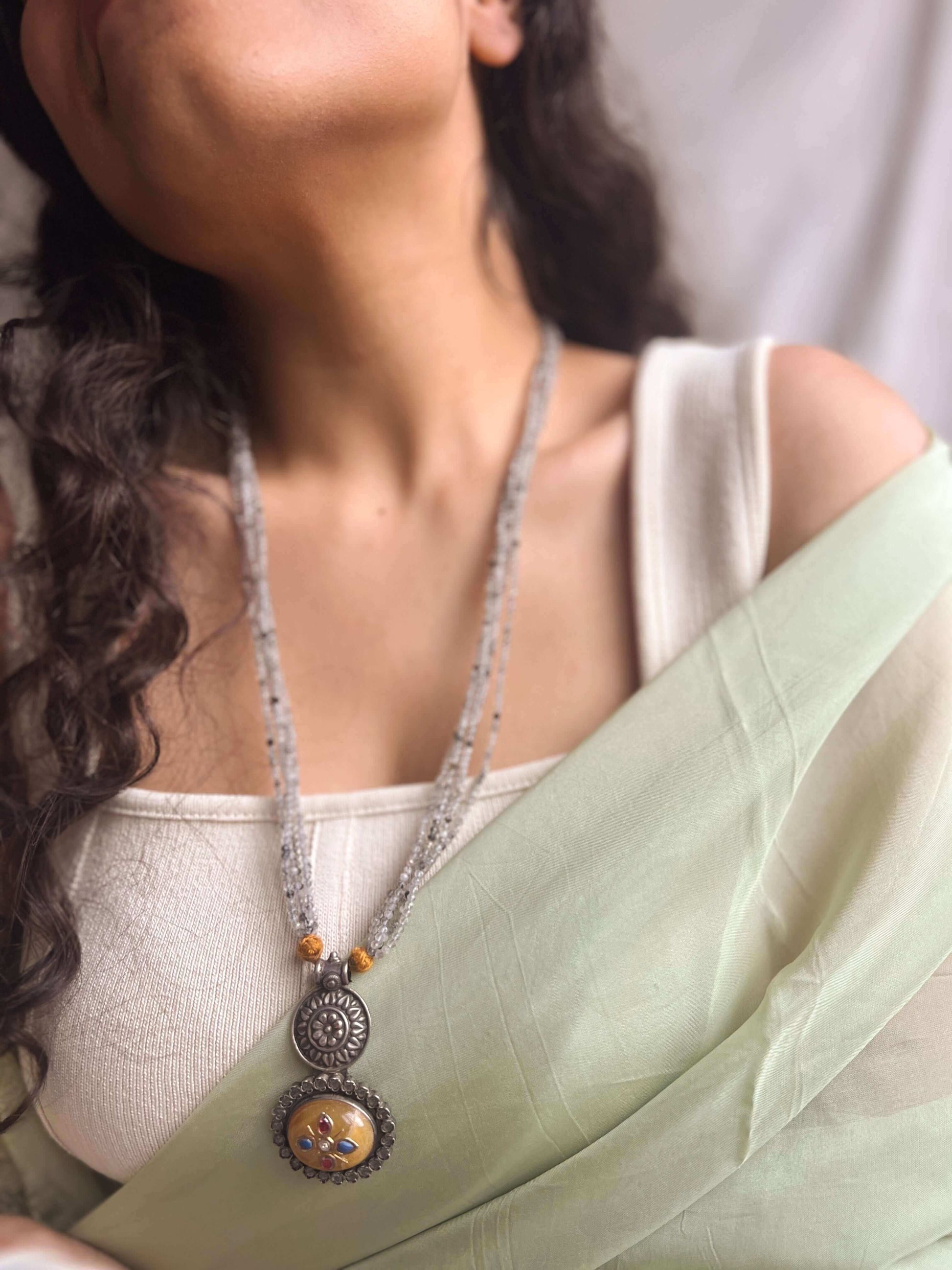 Elevate your style with this stunning long necklace featuring multi-strand grey jade beads. The oxidized silver pendant adorned with a vibrant yellow jasper stone and intricate kundan work adds a touch of vintage charm to this exquisite piece. Perfect for both casual and formal occasions, this necklace is sure to make a statement and become a cherished addition to your jewelry collection.