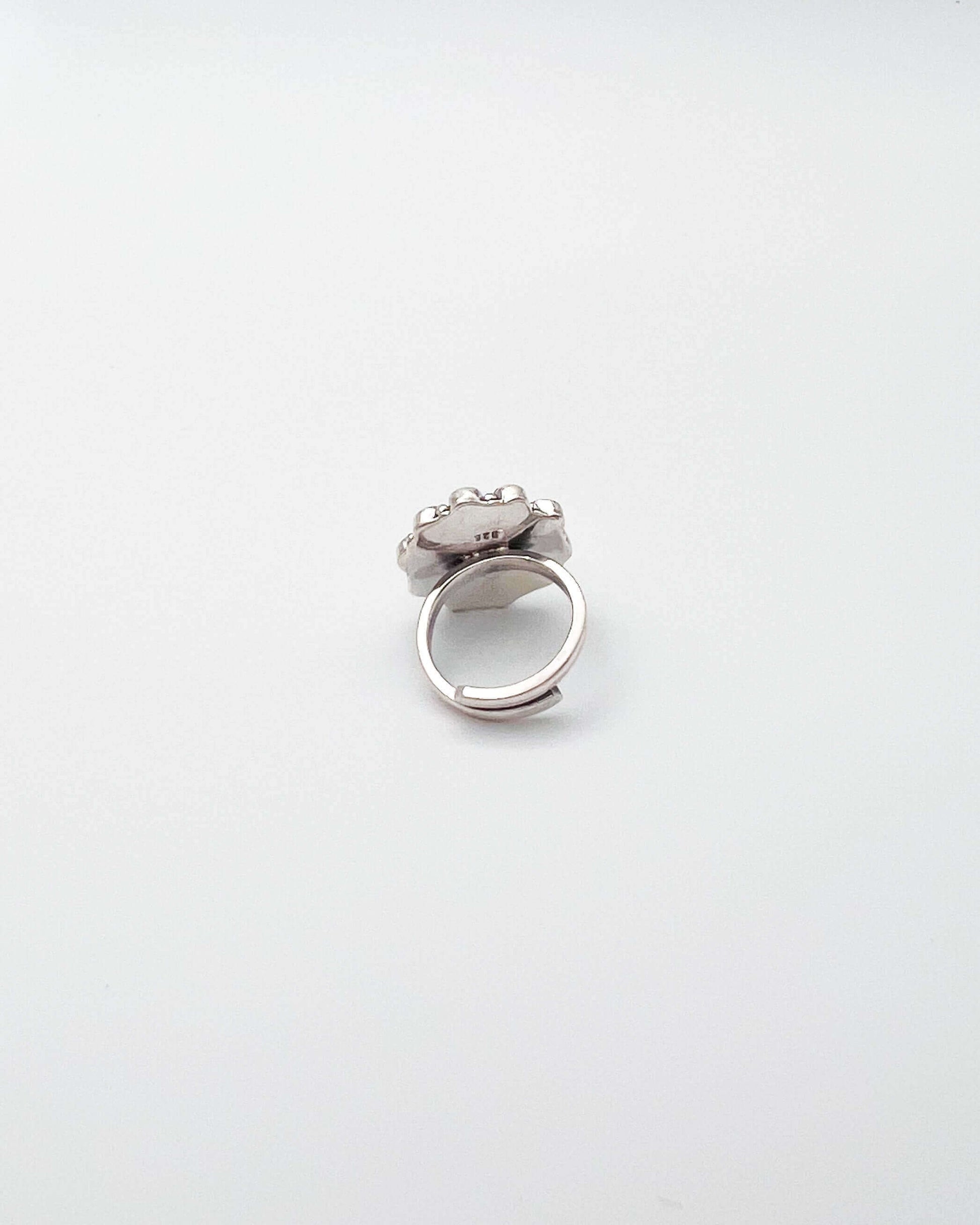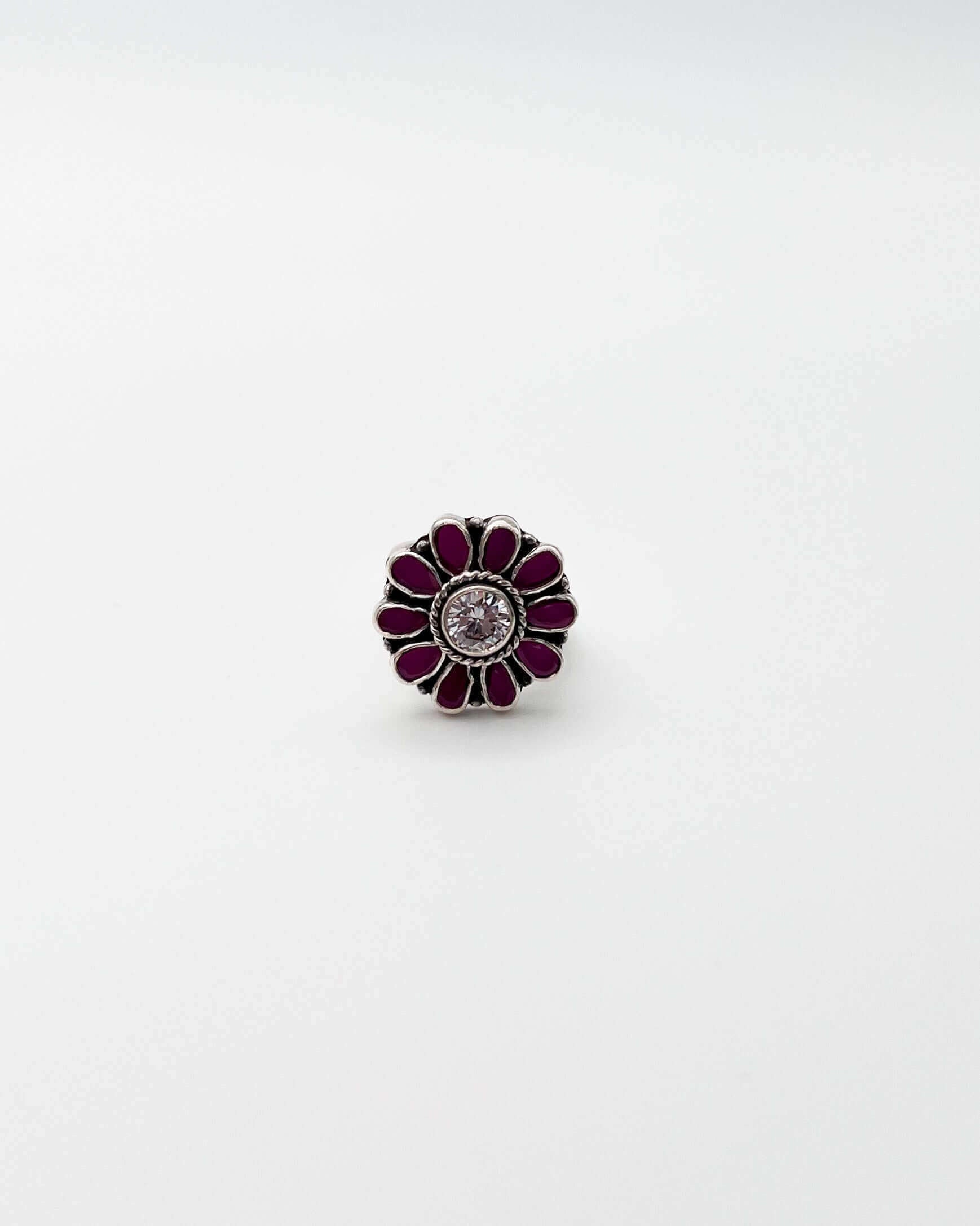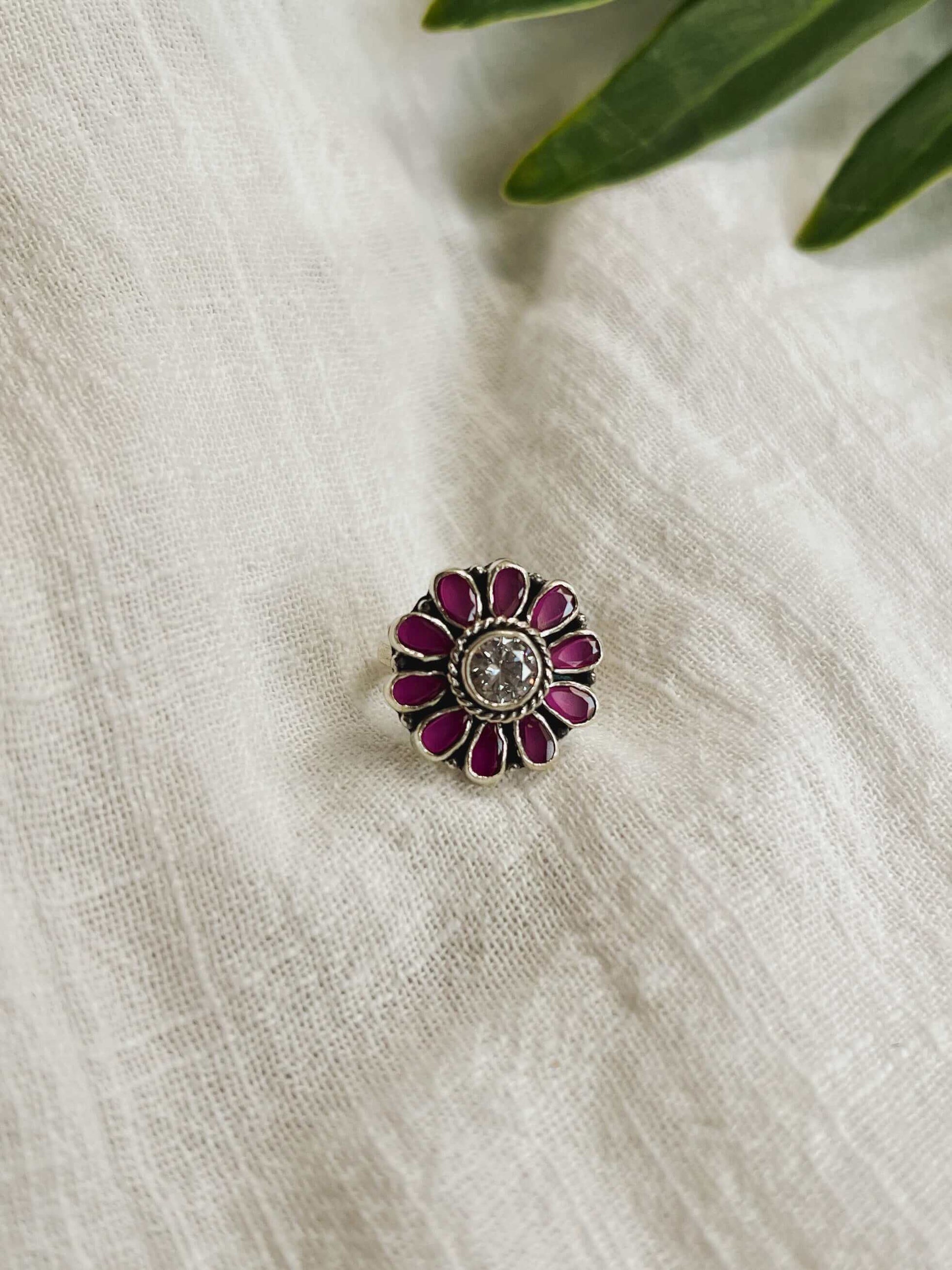 Beautiful flower inspired adjustable ring, with pink ruby glass stones surrounding the centre polki, creating a simple but elegant outlook.