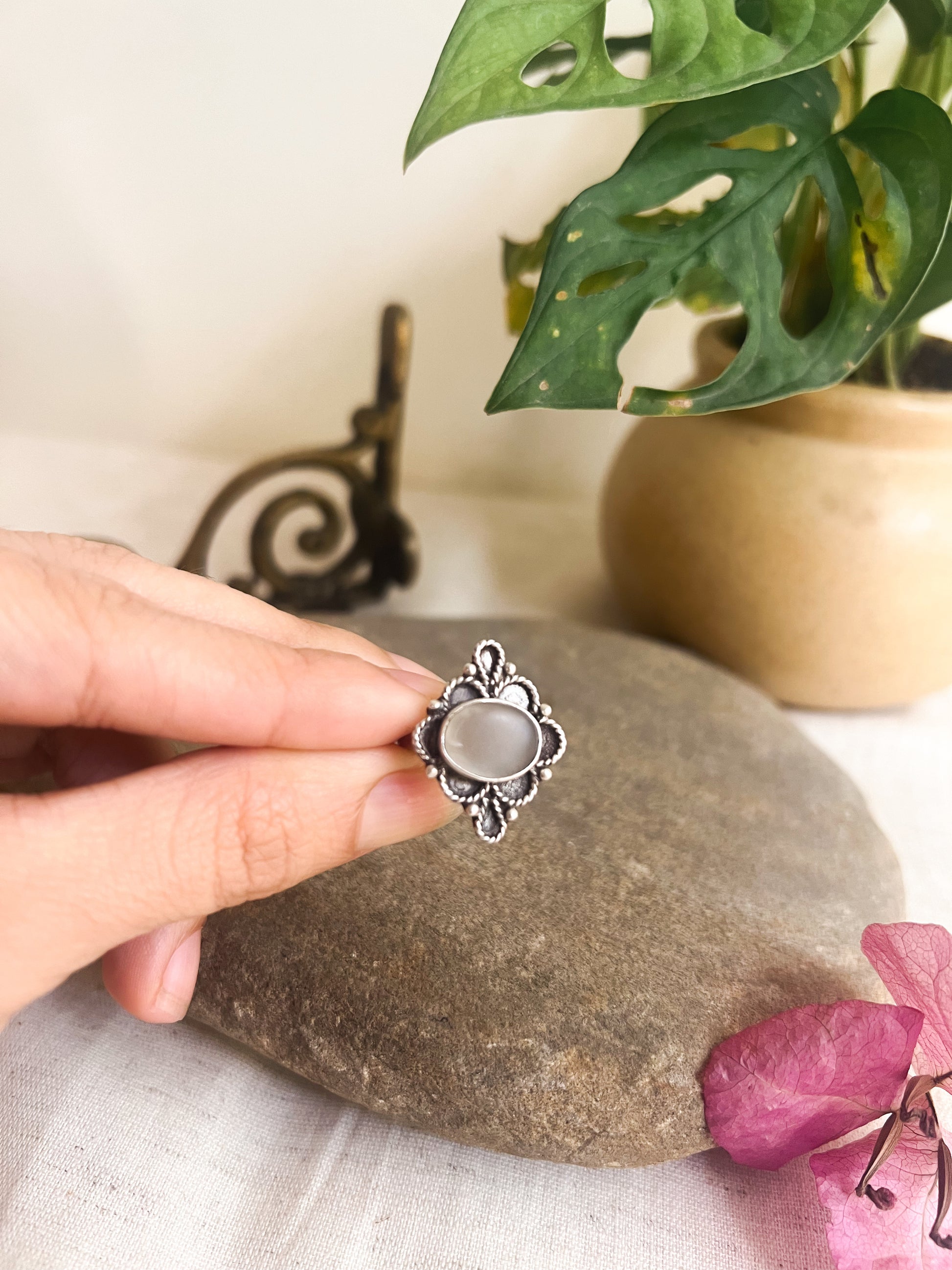 Beautiful vintage oxidized silver ring with moonstone surrounded by elaborate mantapa detail and completed by adjustable band. A timeless accessory with an Indian touch ; perfect to add a hint of elegance and festive glamour to your look!
