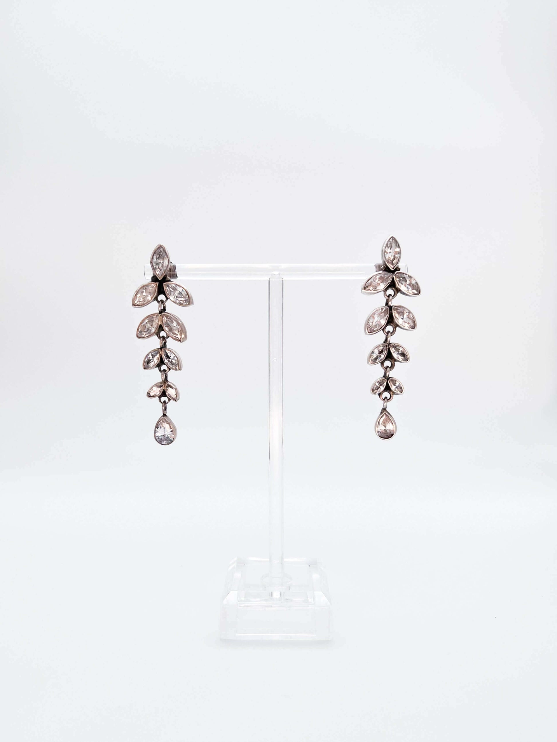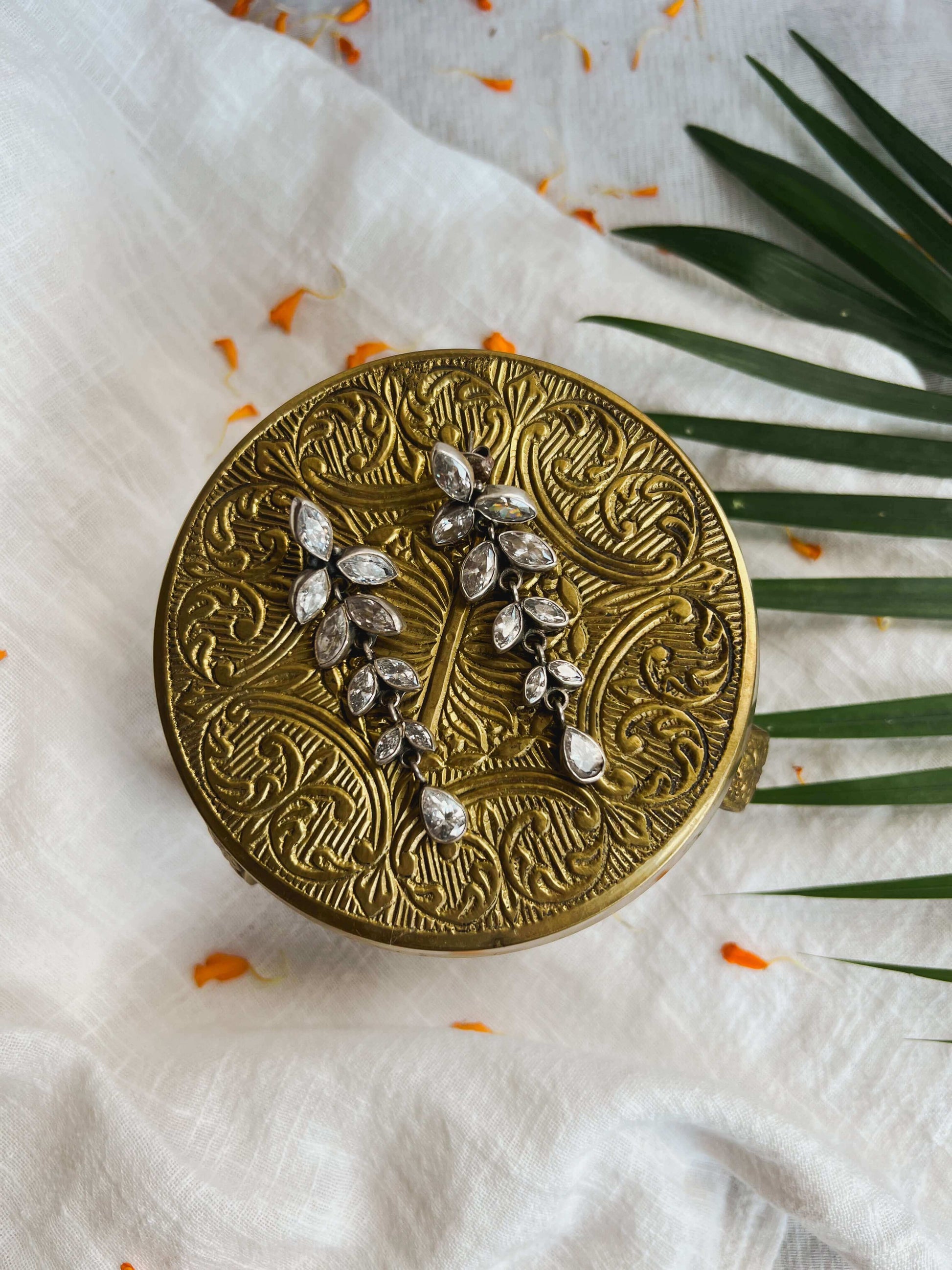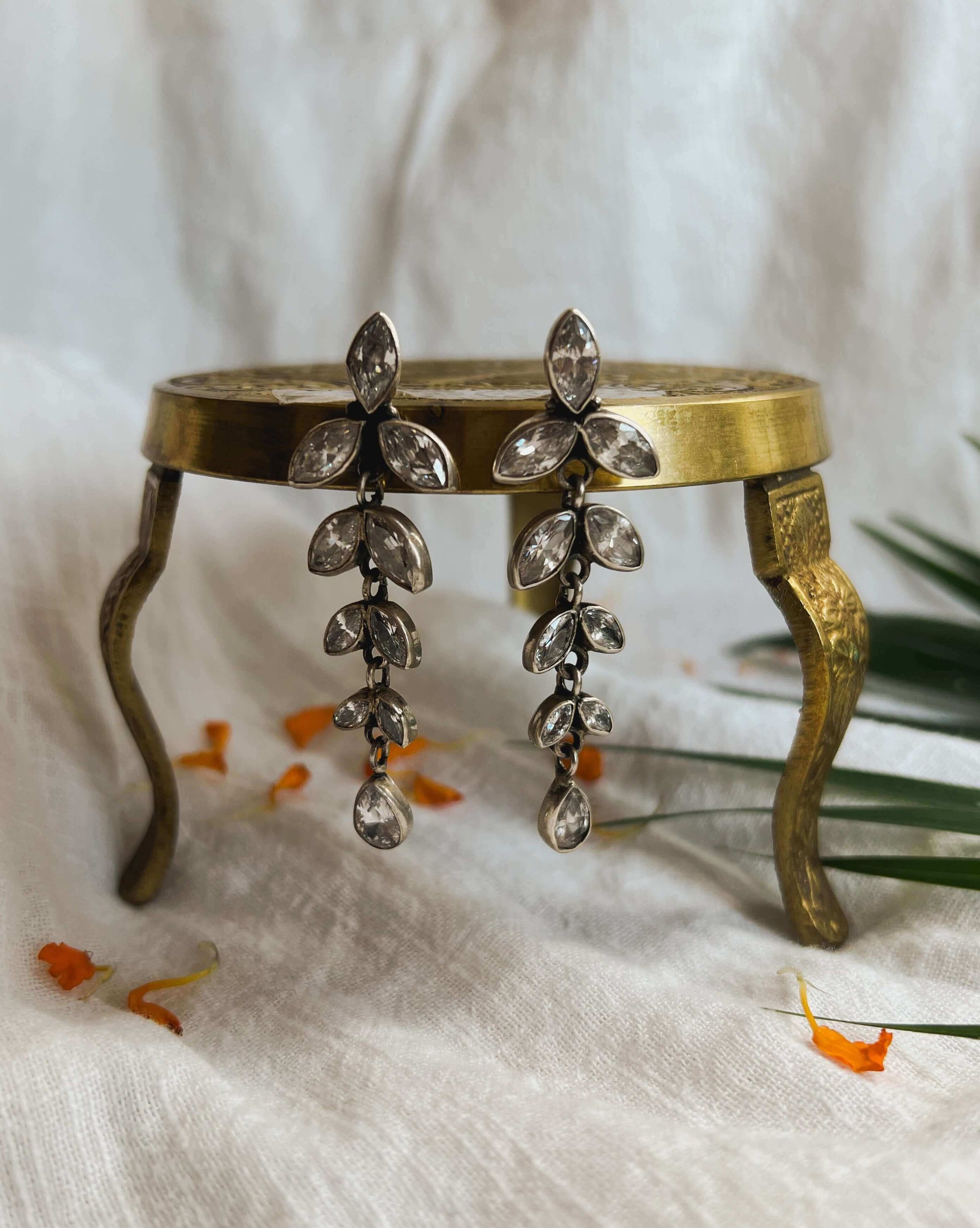 Statement long silver earrings with glass polki. A very versatile piece , can be your go to earrings for dazzling up a casual outfit or for your dressed up soirees.