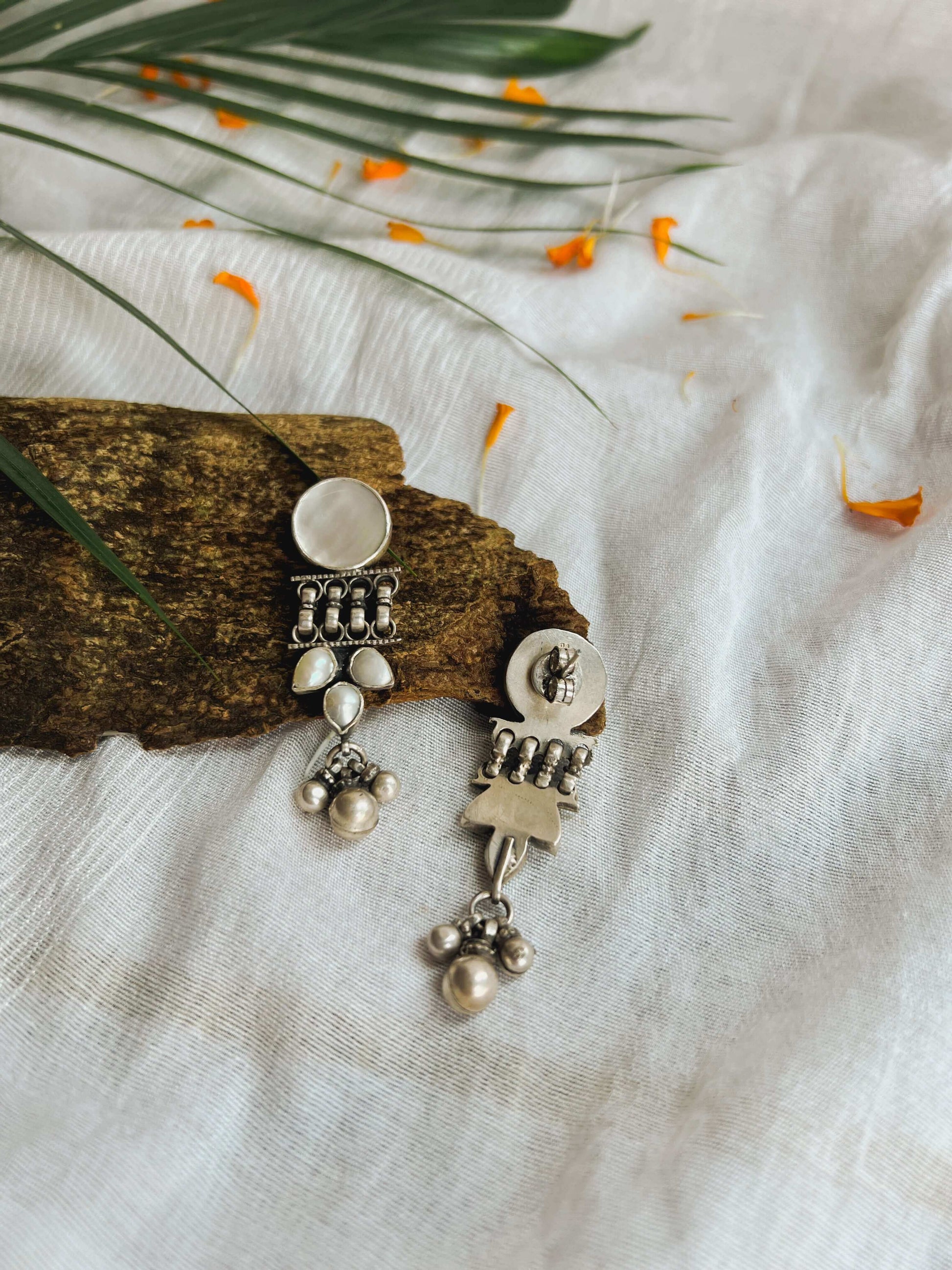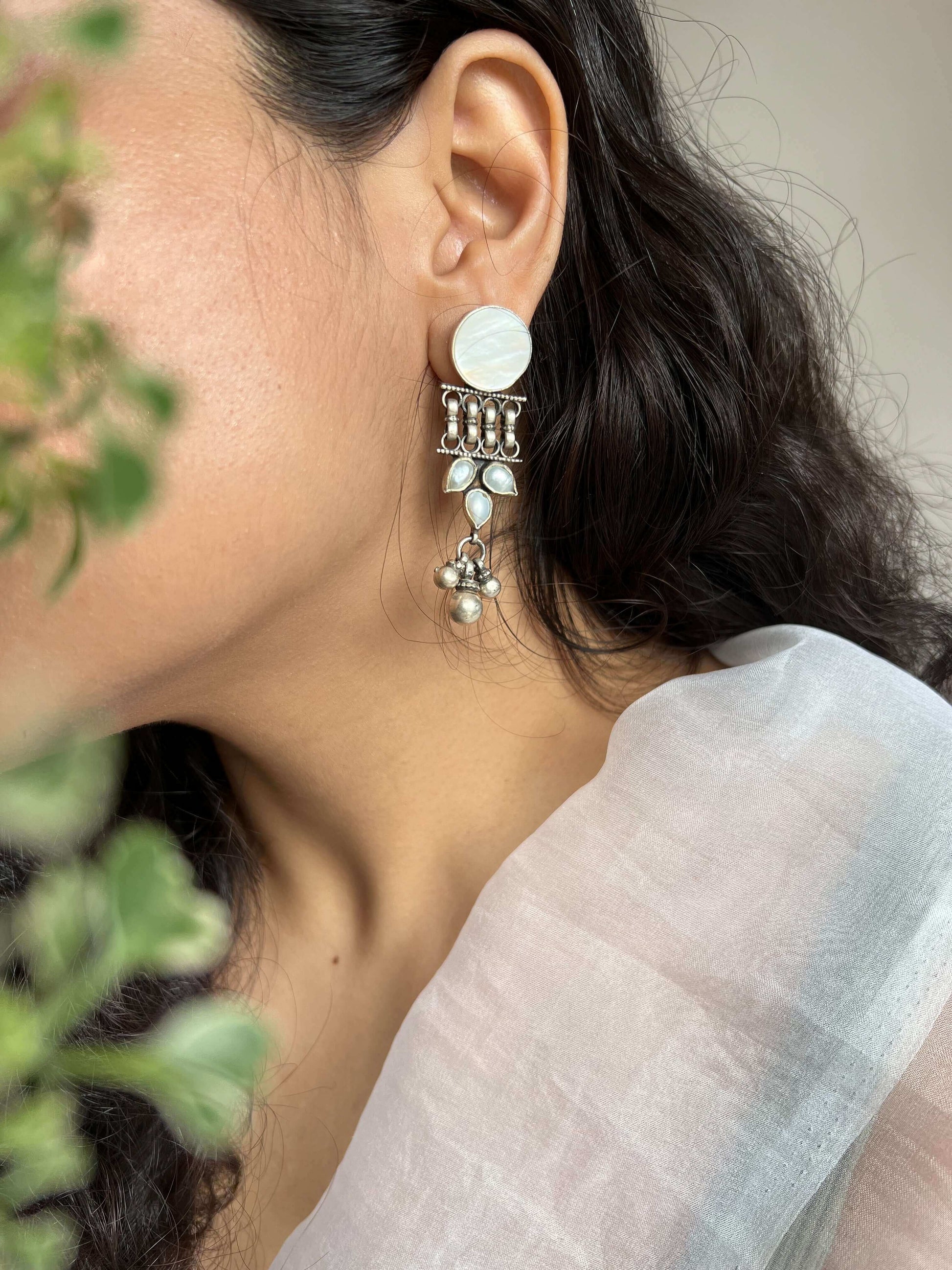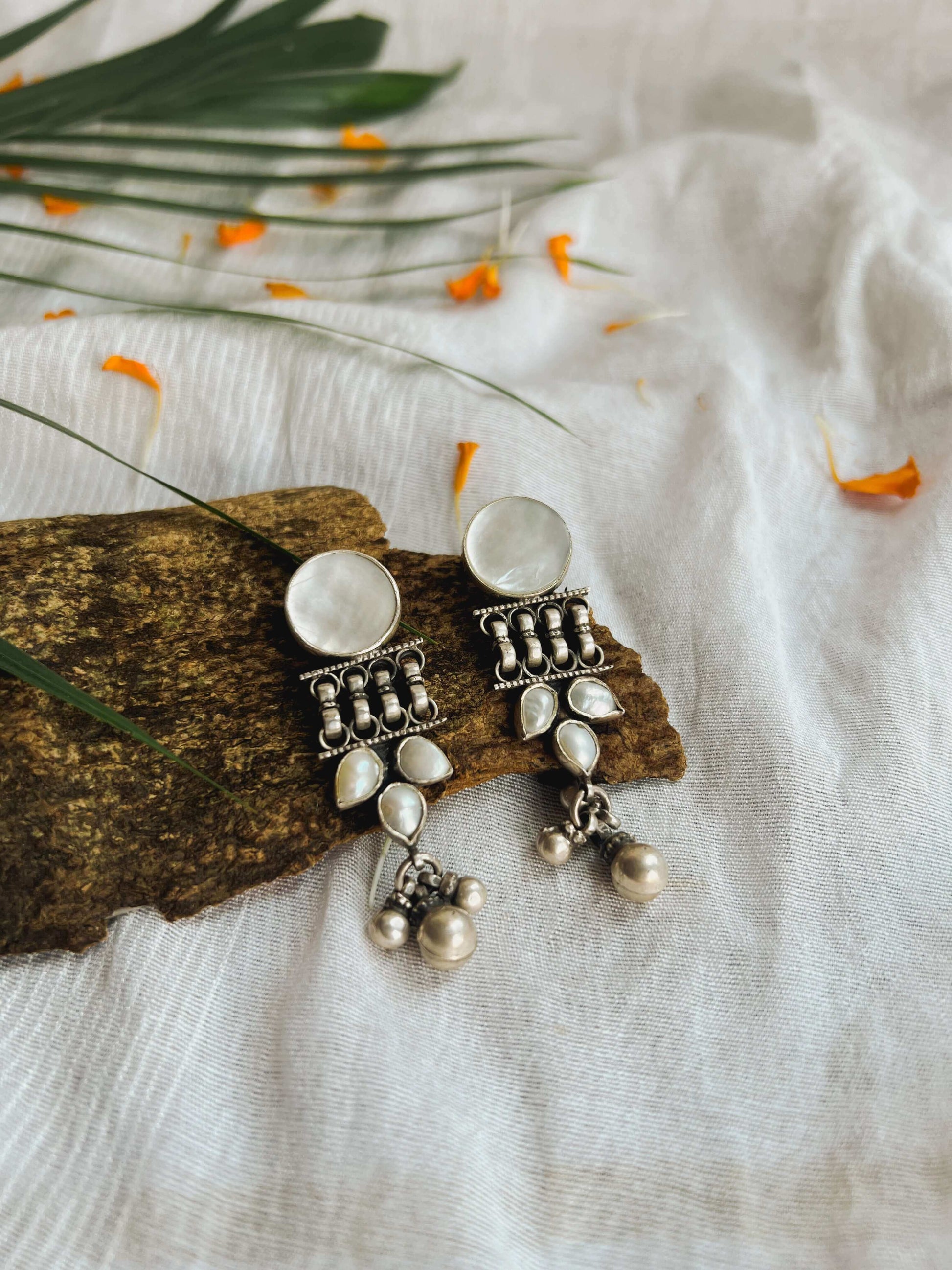 Long danglers with circular topper in shell continuing to a cluster of pearl drops and silver ghunghroo detail. Like the magic of a full moon night, these enchanting earrings makes you fall in love with them .