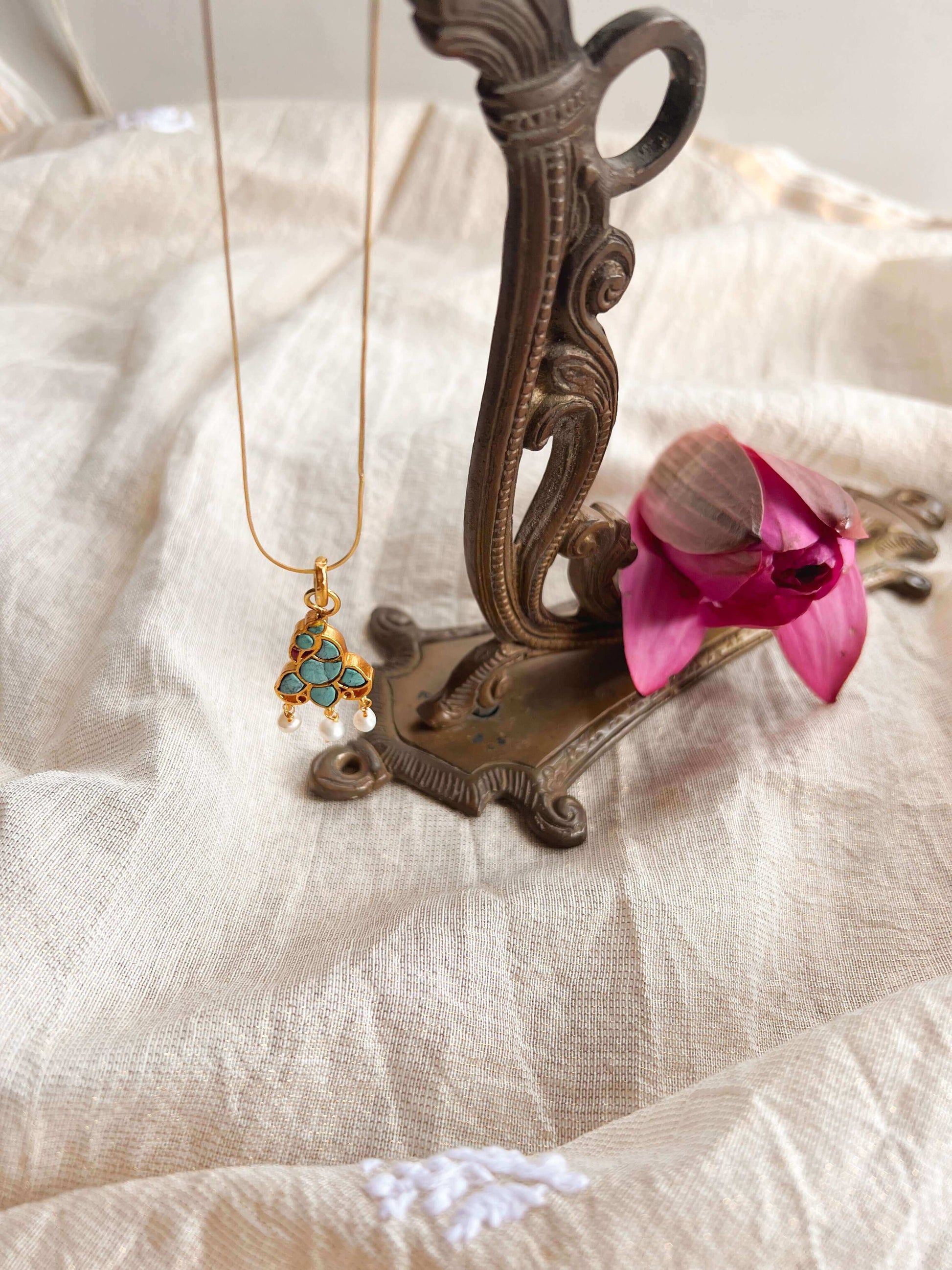 Very sweet and delicate gold plated 18 inch chain, suspended with peacock pendant studded with turquoise stone and hanging pearls. Gorgeous neck-chain for your everyday wear as well as light festive occasions, you can layer it up or wear individually depending on your mood ;)
