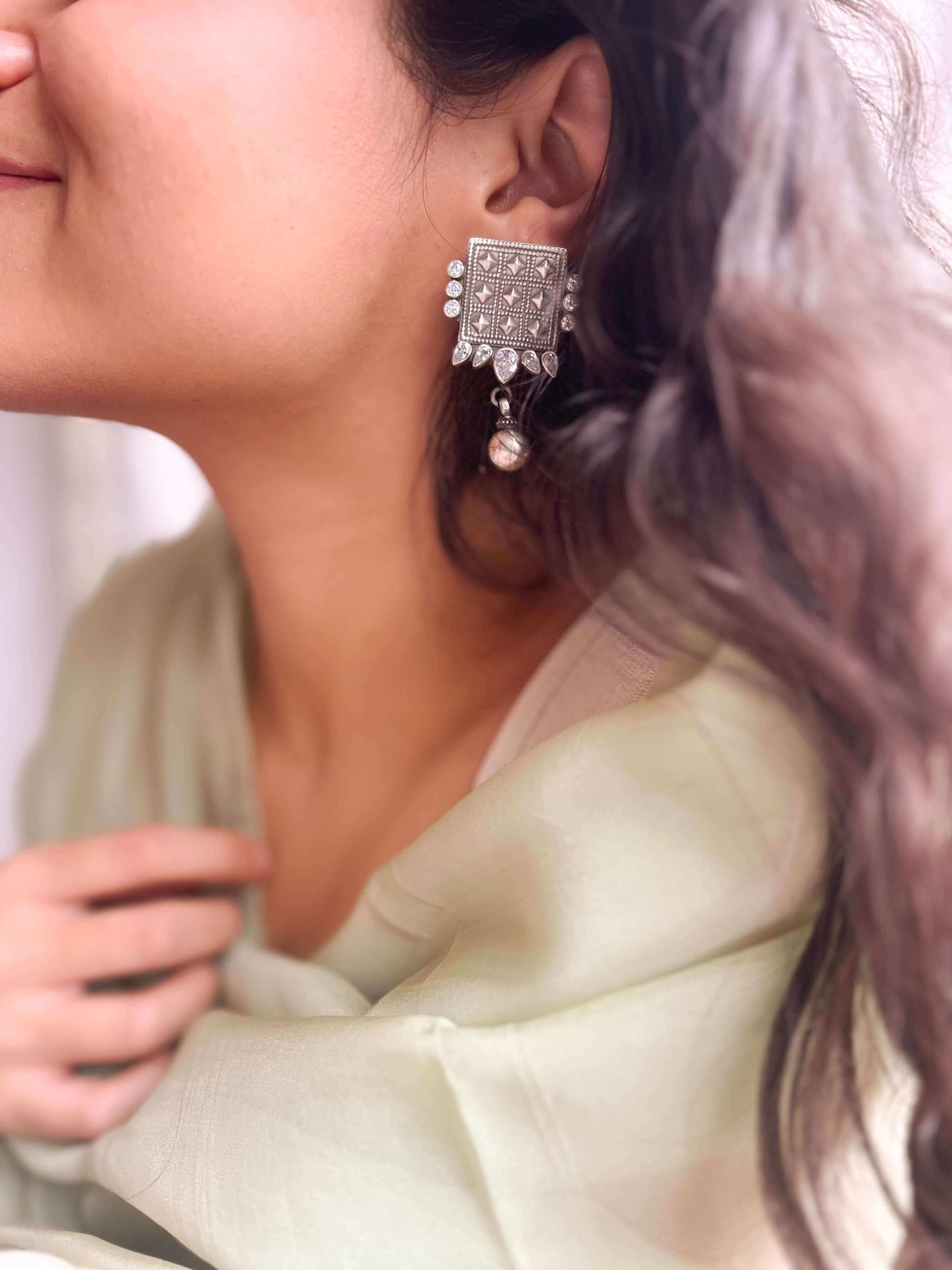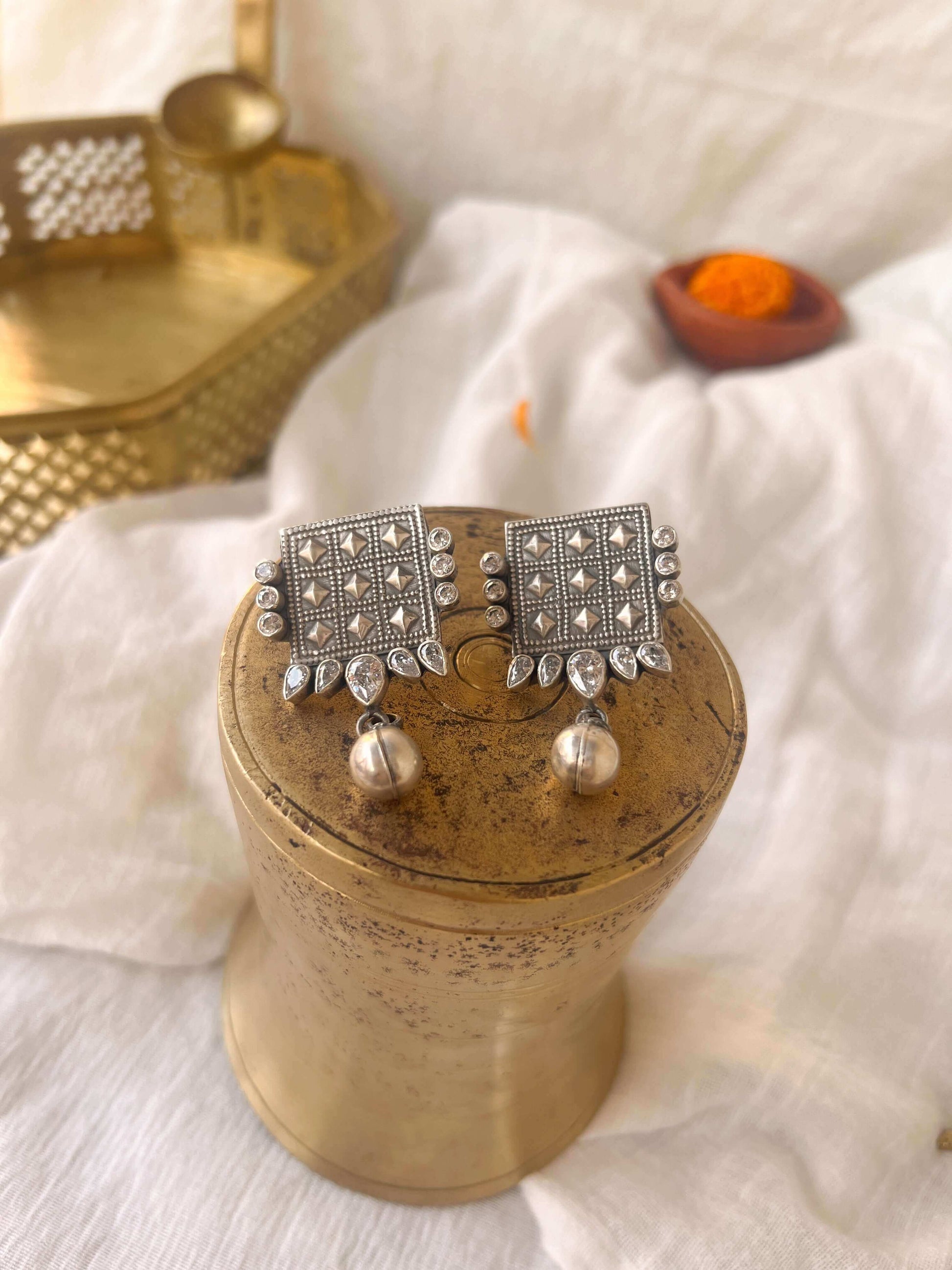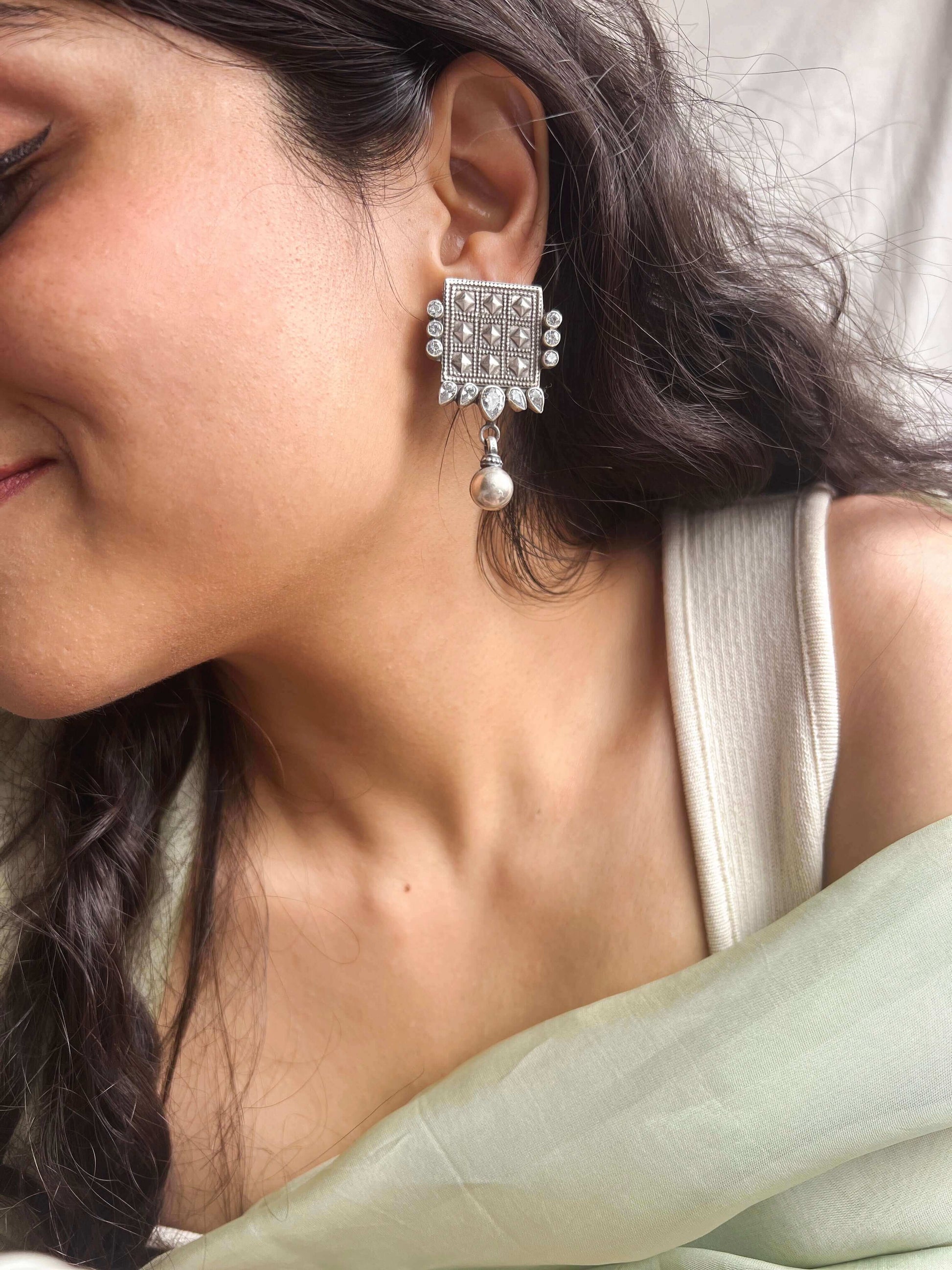These elegant earrings feature a textured square motif design, adorned with zircon detailing around the edges. The silver bead hanging from the earrings add a touch of sophistication and movement. Perfect for any pooja or haldi, these unique earrings will elevate your style game.