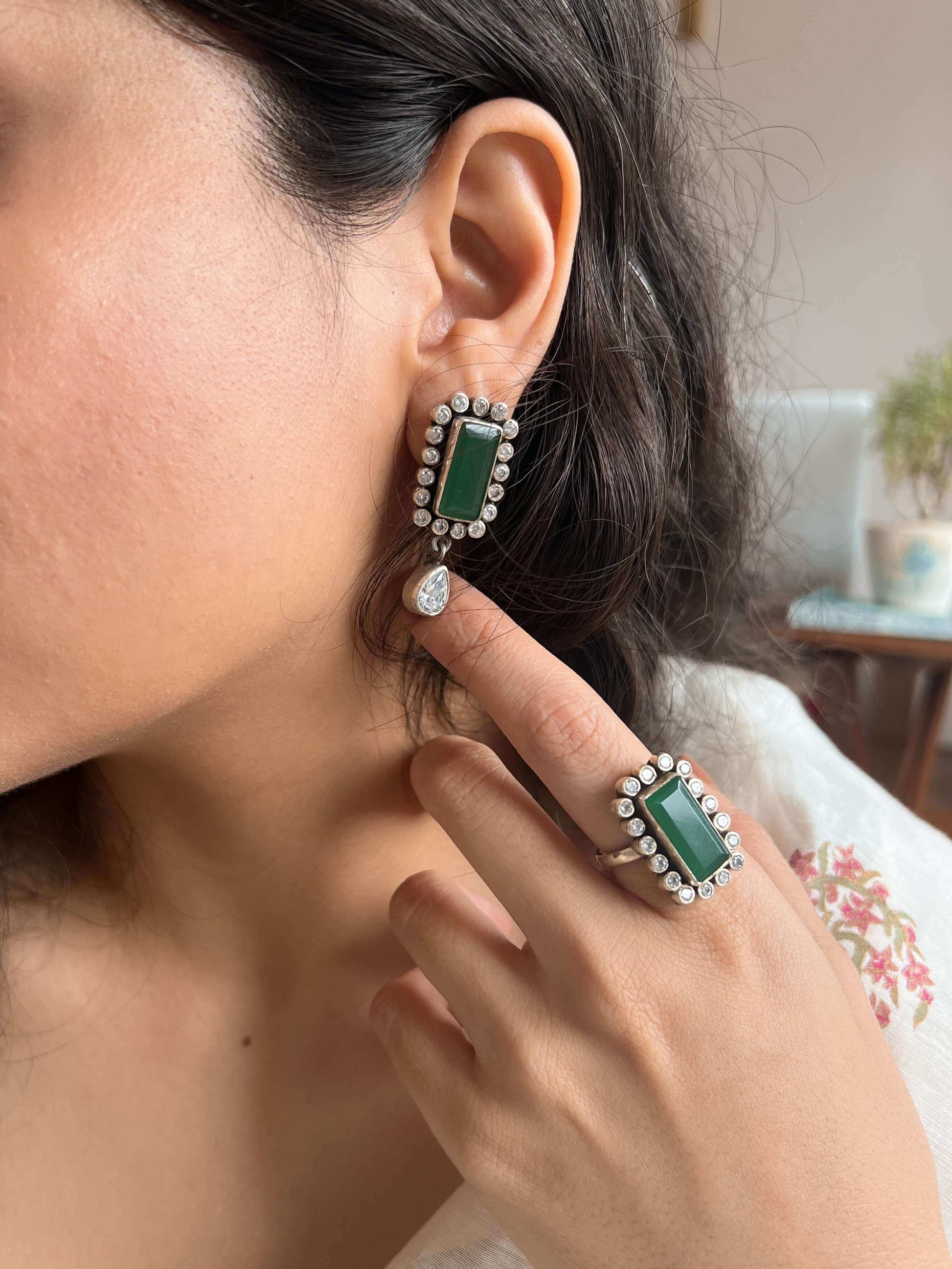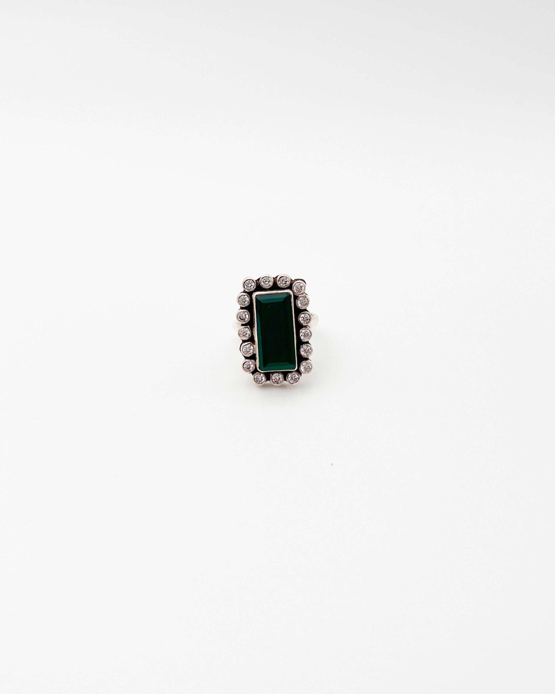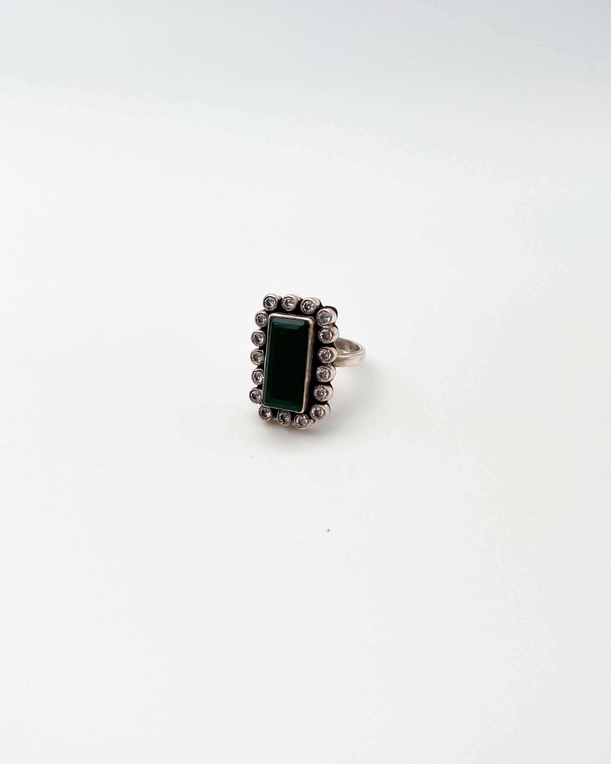 This classy ring has synthetic green onyx surrounded by premium zirconia. Its a modern ring with a touch of old world charm, perfect to represent power with elegance.