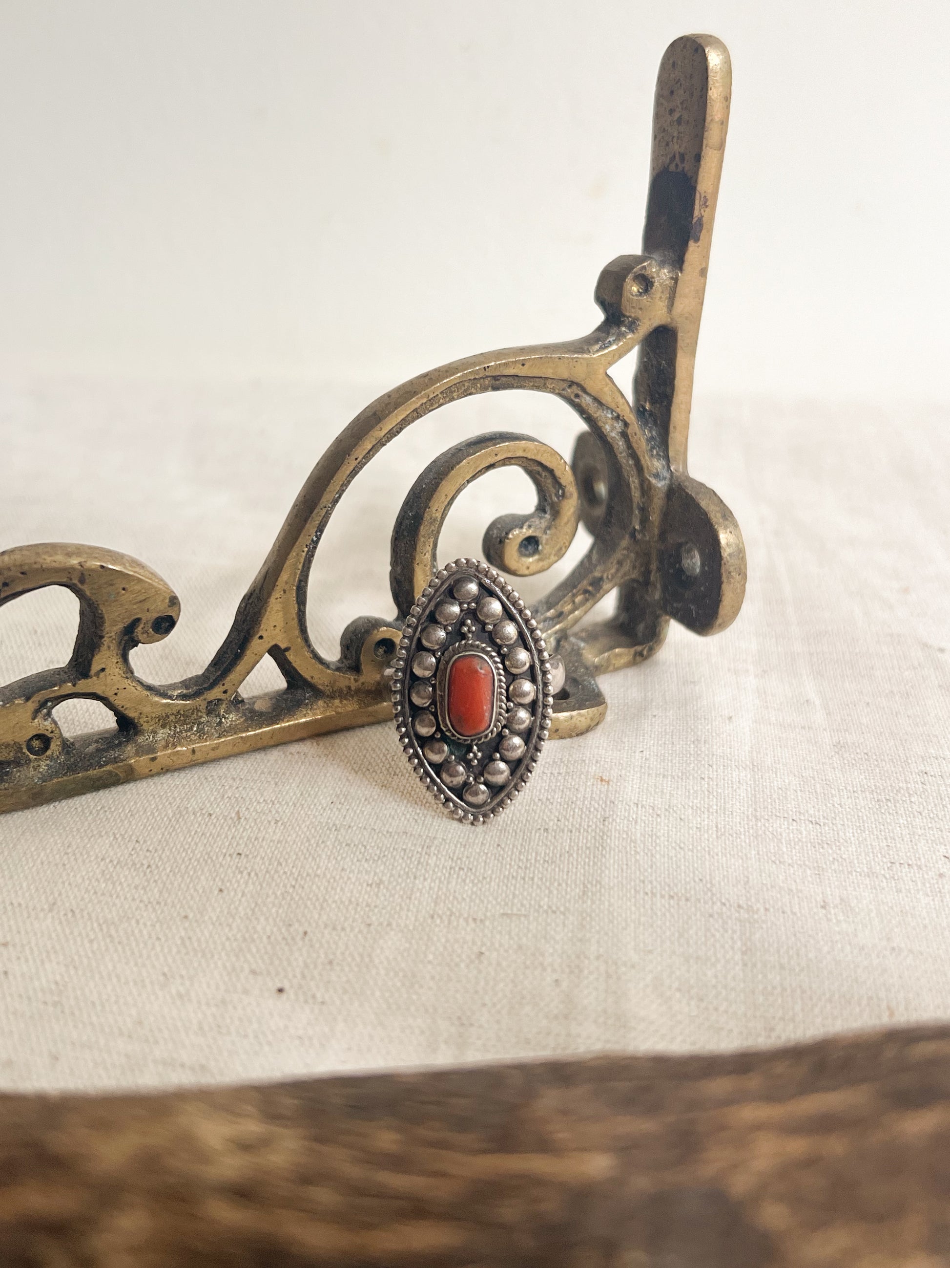 Beautiful vintage oxidized silver ring with jasper stone surrounded by silver bead detail and completed by adjustable band. A timeless accessory with an Indian touch ; perfect to add a hint of elegance and festive glamour to your look!