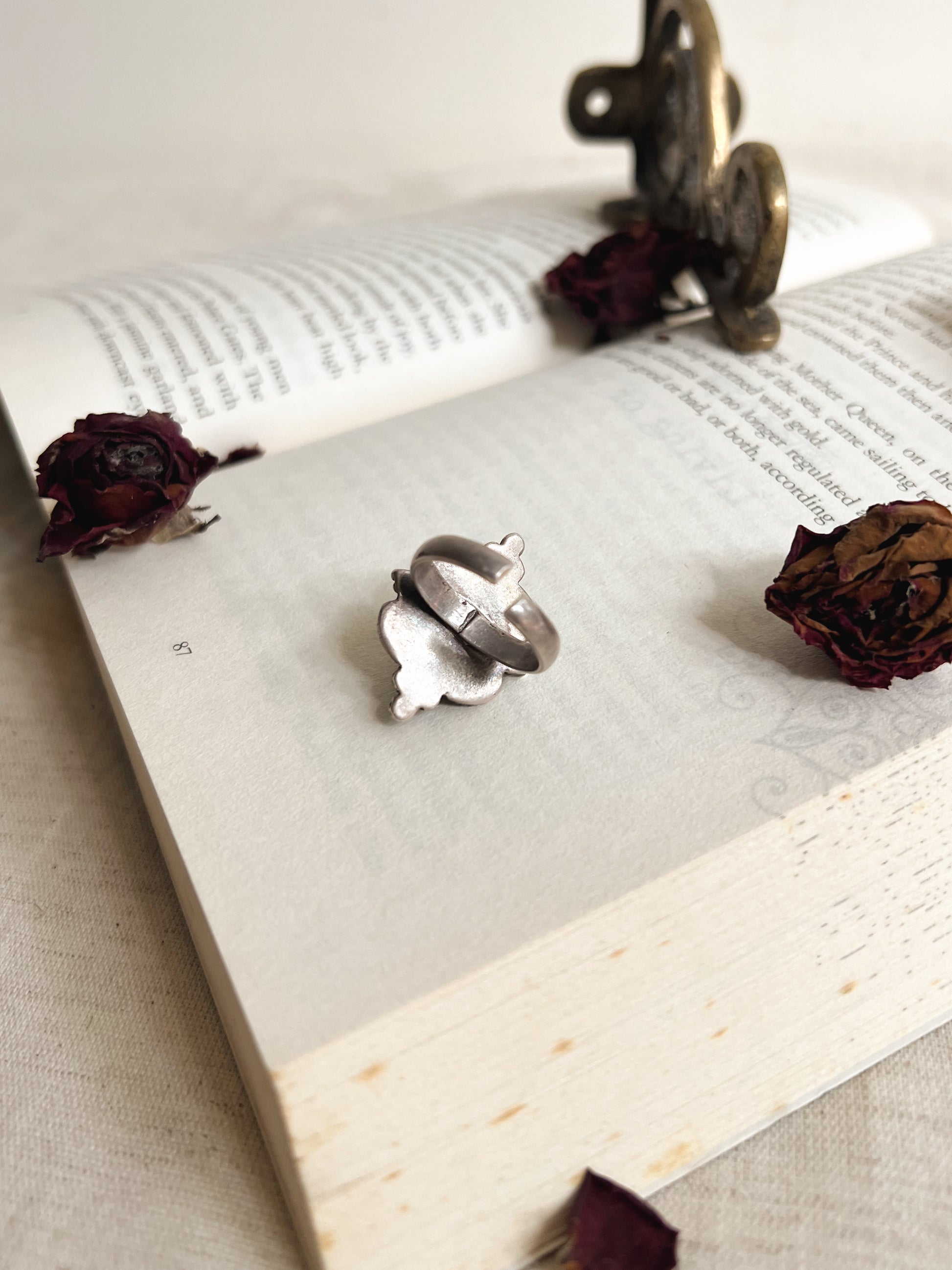 Beautiful vintage oxidized silver ring with green onyx stone surrounded by elaborate mantapa detail and completed by adjustable band. A timeless accessory with an Indian touch ; perfect to add a hint of elegance and festive glamour to your look!
