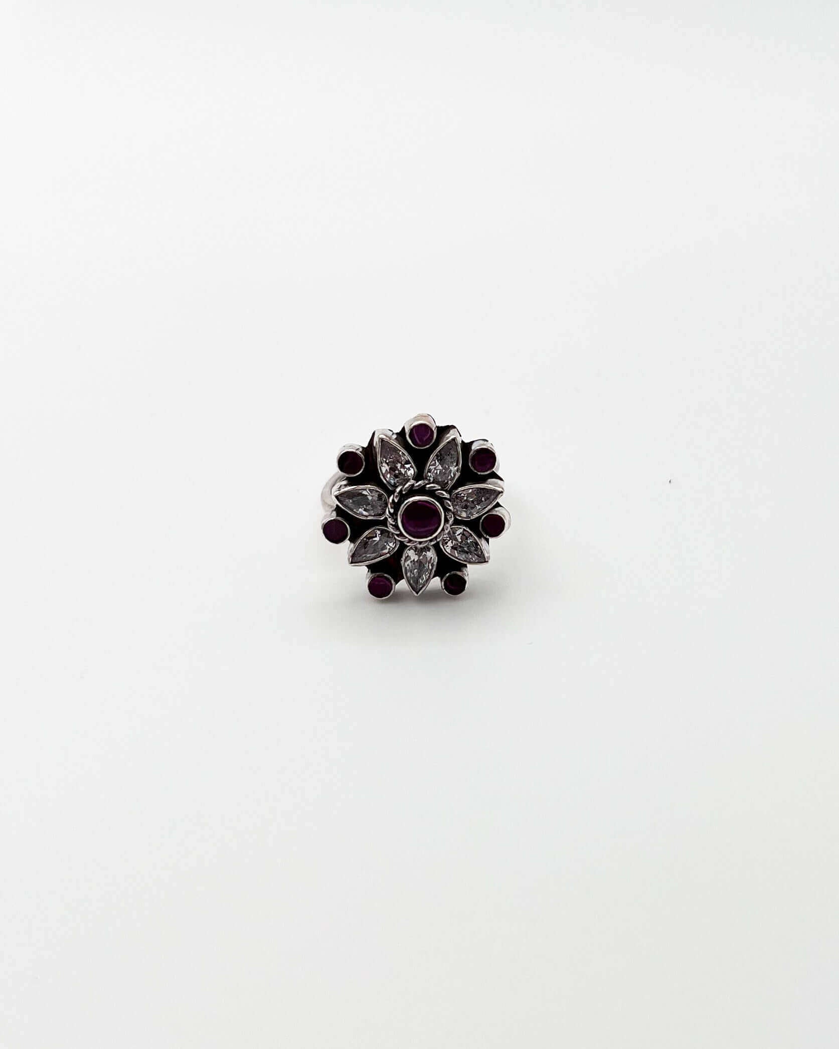 This brilliantly sparkling ring gets its sheen from the zircons that surrounds centre ruby glass stone. It's an easy to wear adjustable ring. Can be easily be paired up with other rings of our collection to add a little glam to otherwise boring day.