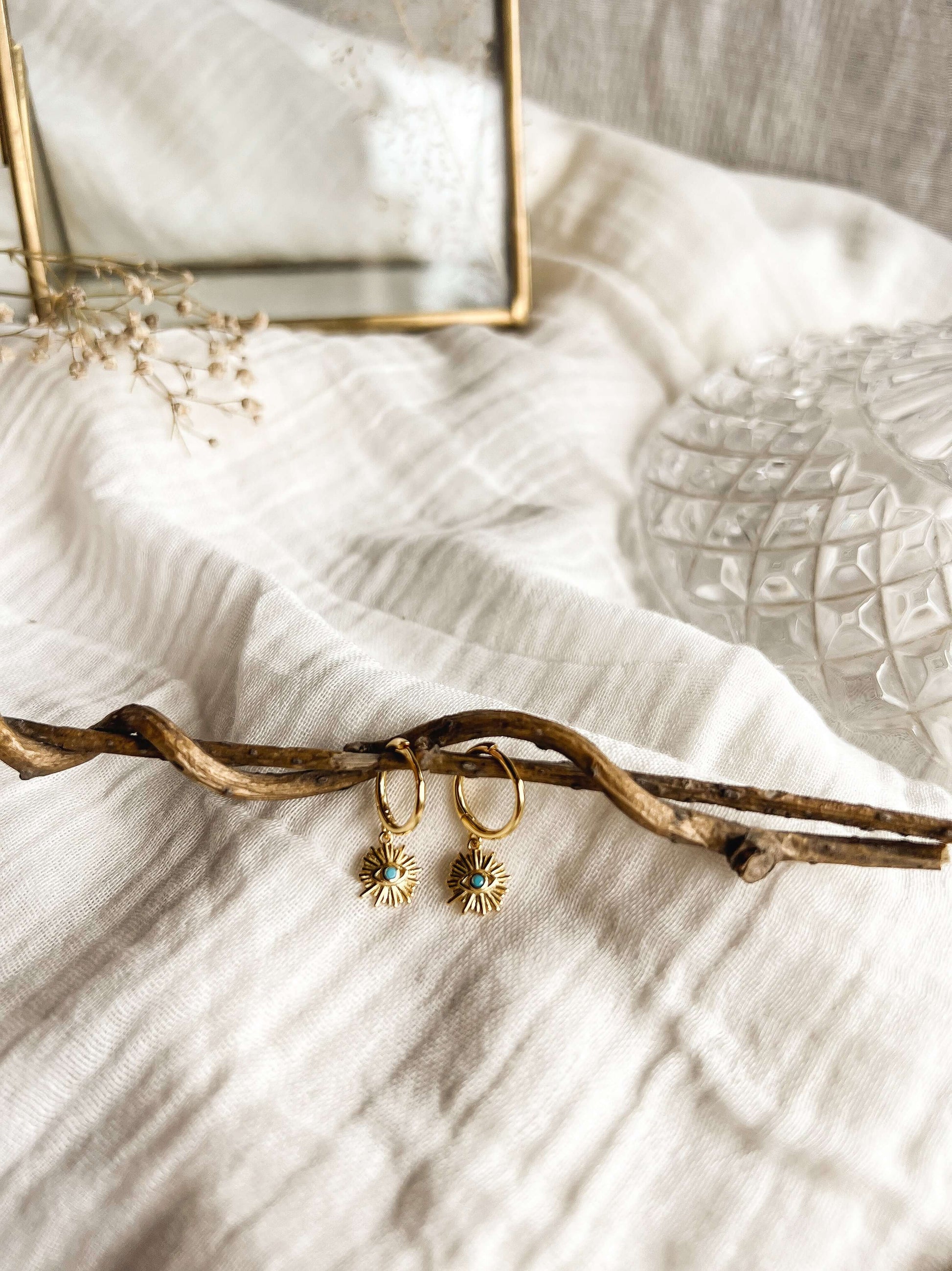 Mini Hoop Earring in Gold-Plated Silver featuring a captivating combination of a starburst and an evil eye charm. Elevate your earring game with this unique and enchanting piece that effortlessly blends style, symbolism, and a touch of mystique. Experience the magic they bring with to your every day wear.