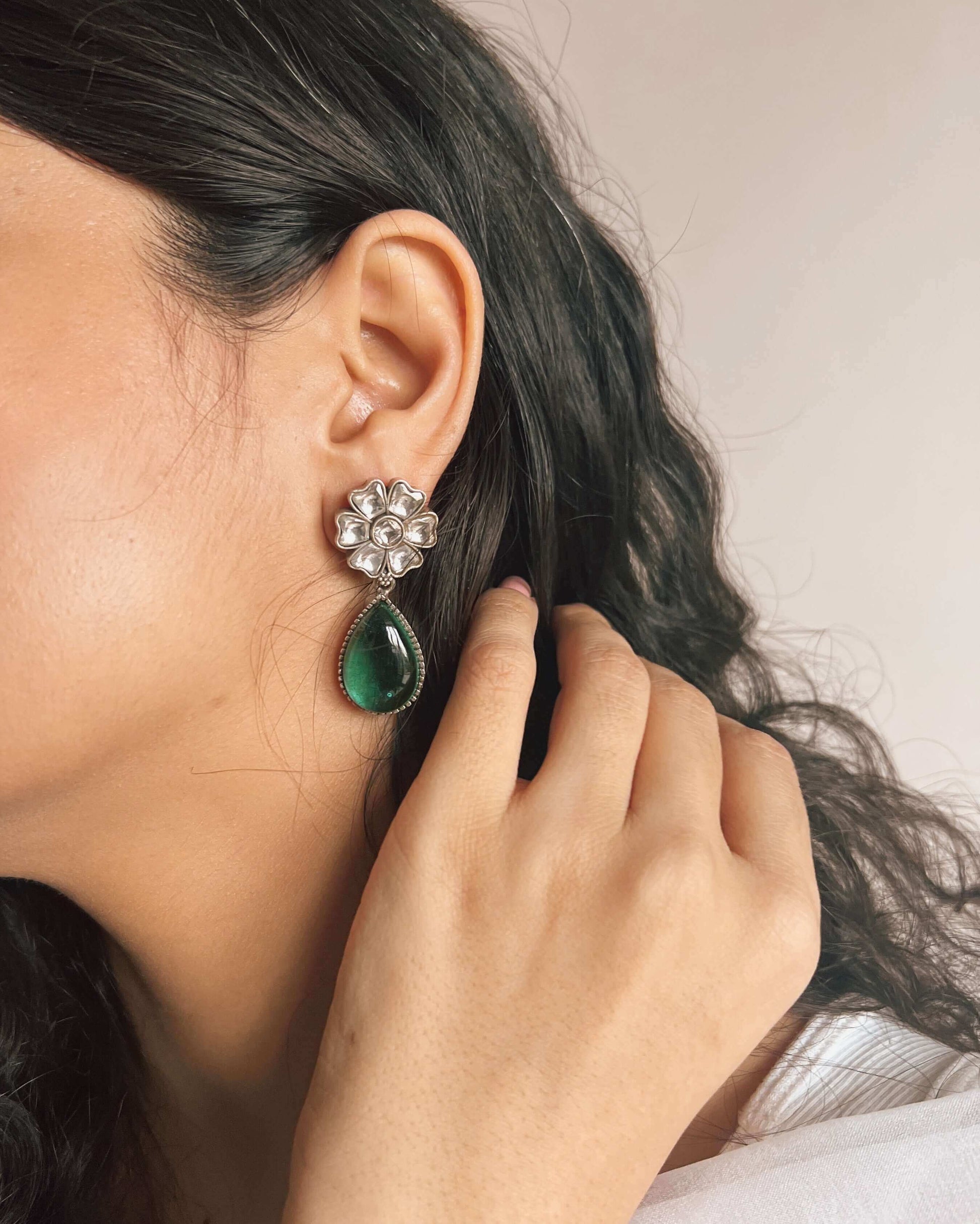 The stunning pair has white kundan flower motif on top with an emerald drop hanging, this piece has the power to make you the talk of the town. Style it for a cocktail night soiree or for day weddings, and get ready to rock.