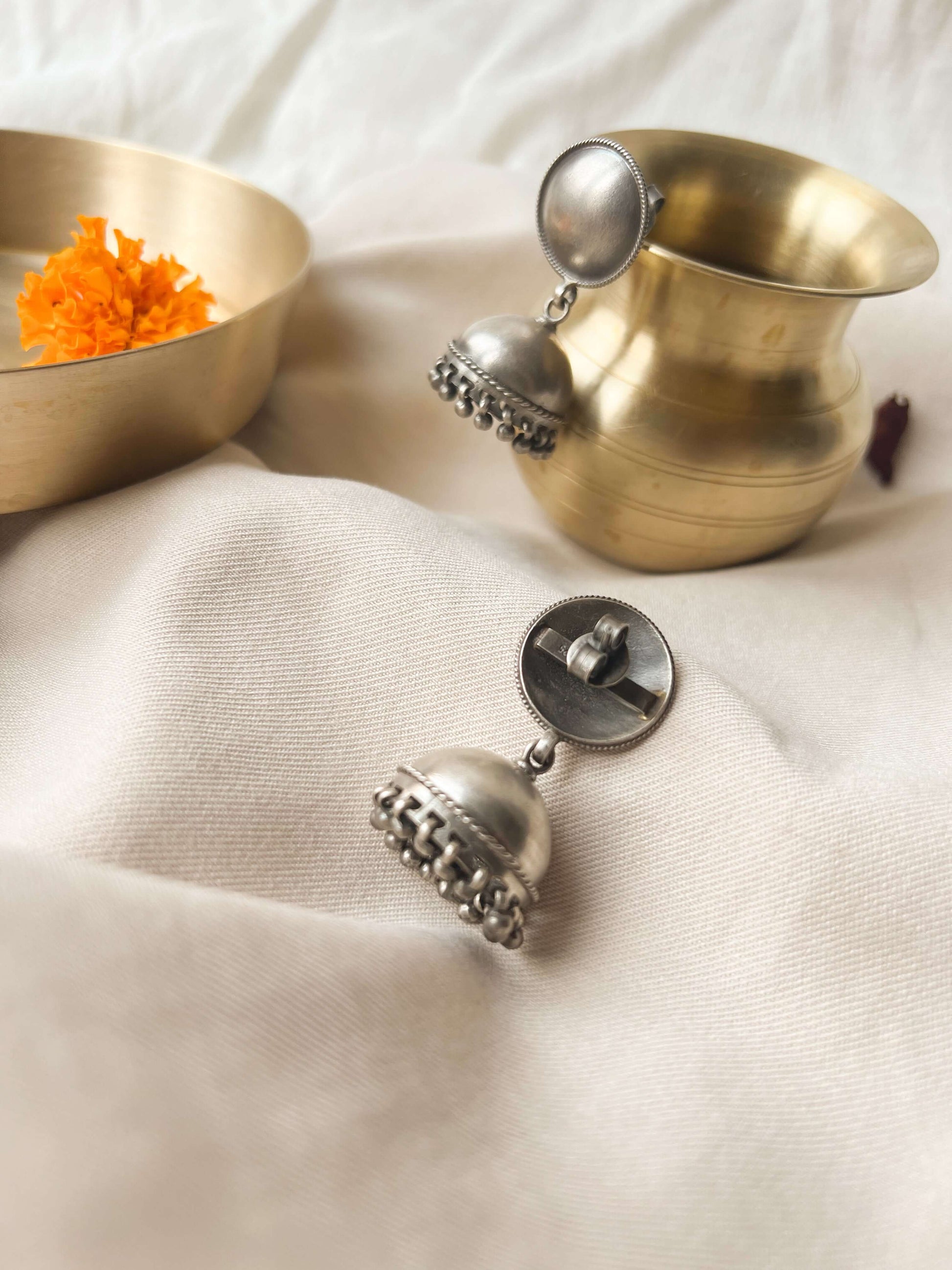 A perfect blend of timeless elegance and contemporary charm. Crafted from high-quality silver, these earrings feature a simple yet striking design with a smooth, dome-shaped top that transitions into a beautifully detailed jhumka, adorned with delicate silver beads.