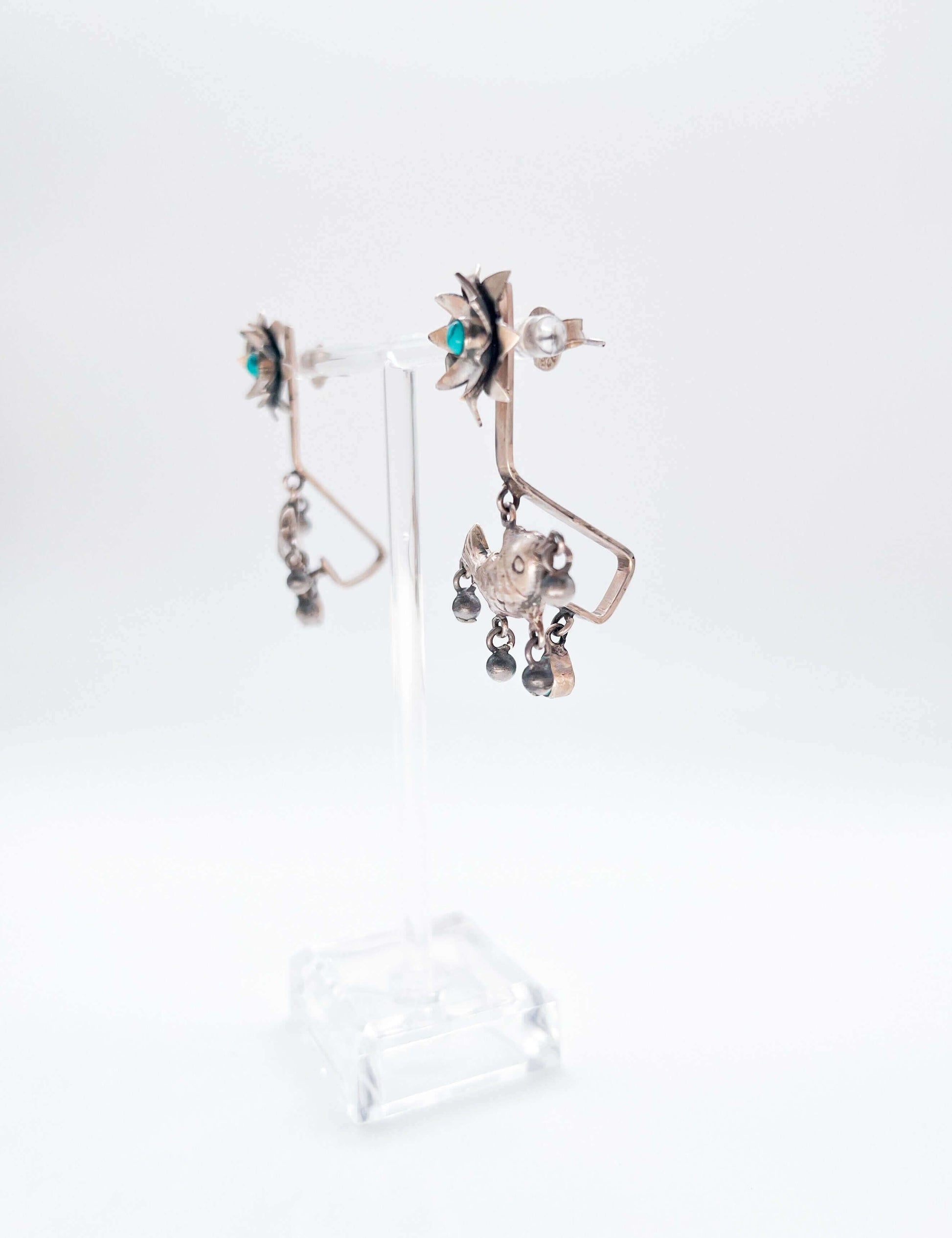 Dive into style with these fish-shaped danglers featuring intricate flower top with turquoise stone at heart. These unique earrings can be worn in two ways, you can enjoy the elegance of the flower studs on their own or attach the fish-shaped danglers for a fun and playful twist.