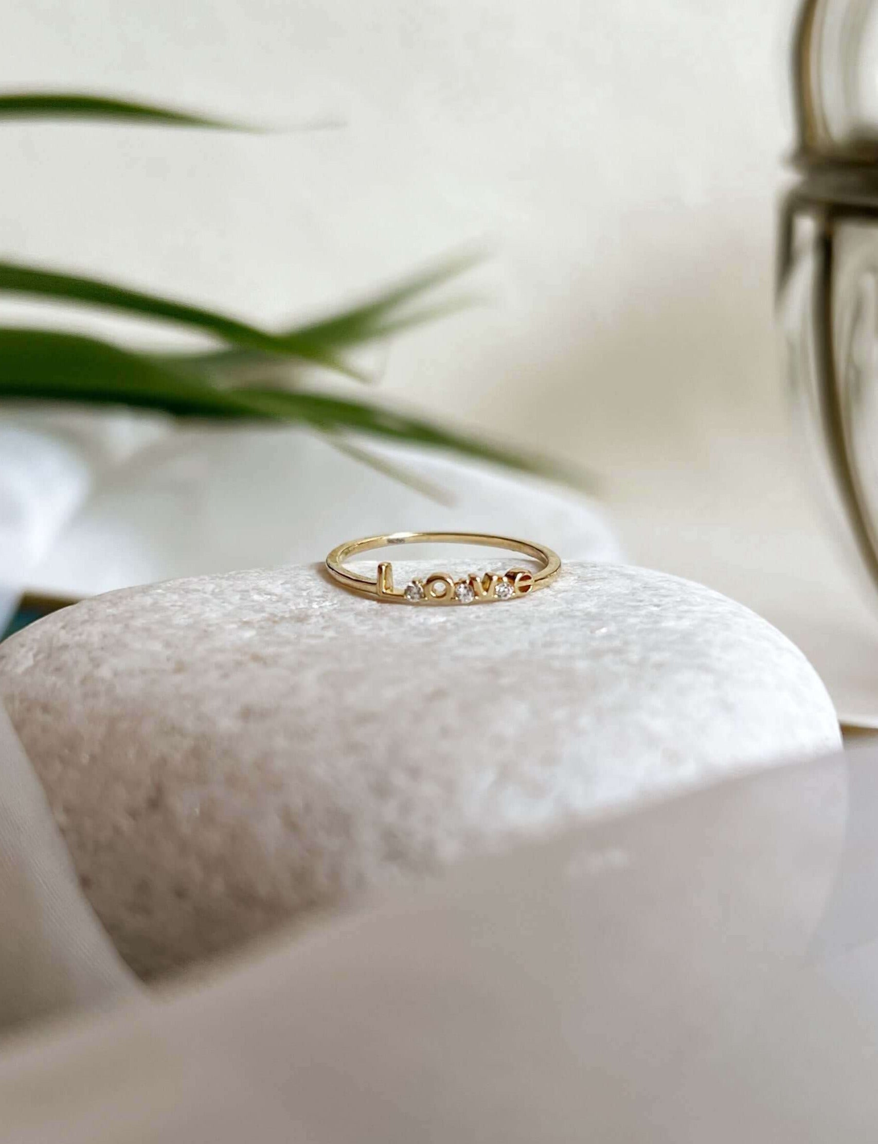 The focal point of the ring is the word "love," which is beautifully crafted in gold plating. The letters are small and exquisitely detailed with little zirconia. Super lightweight , very minimal and dainty , its perfect for your everyday wear.