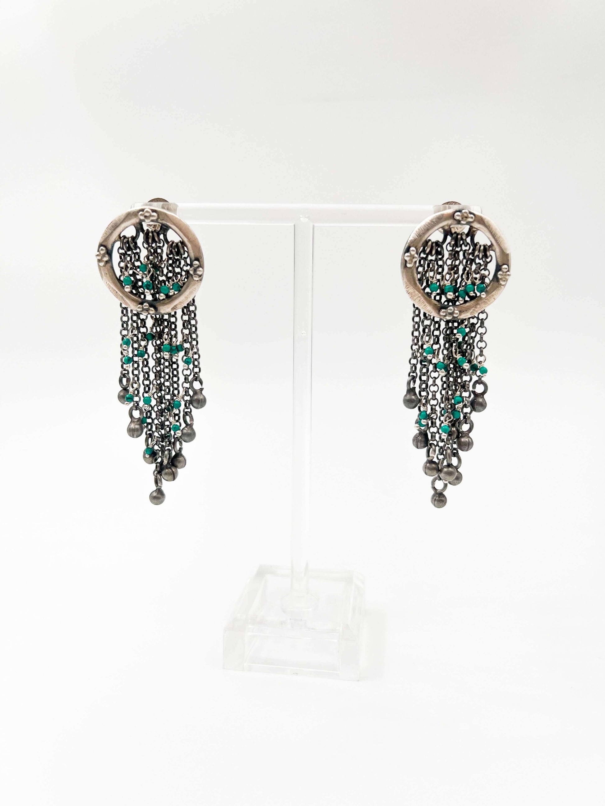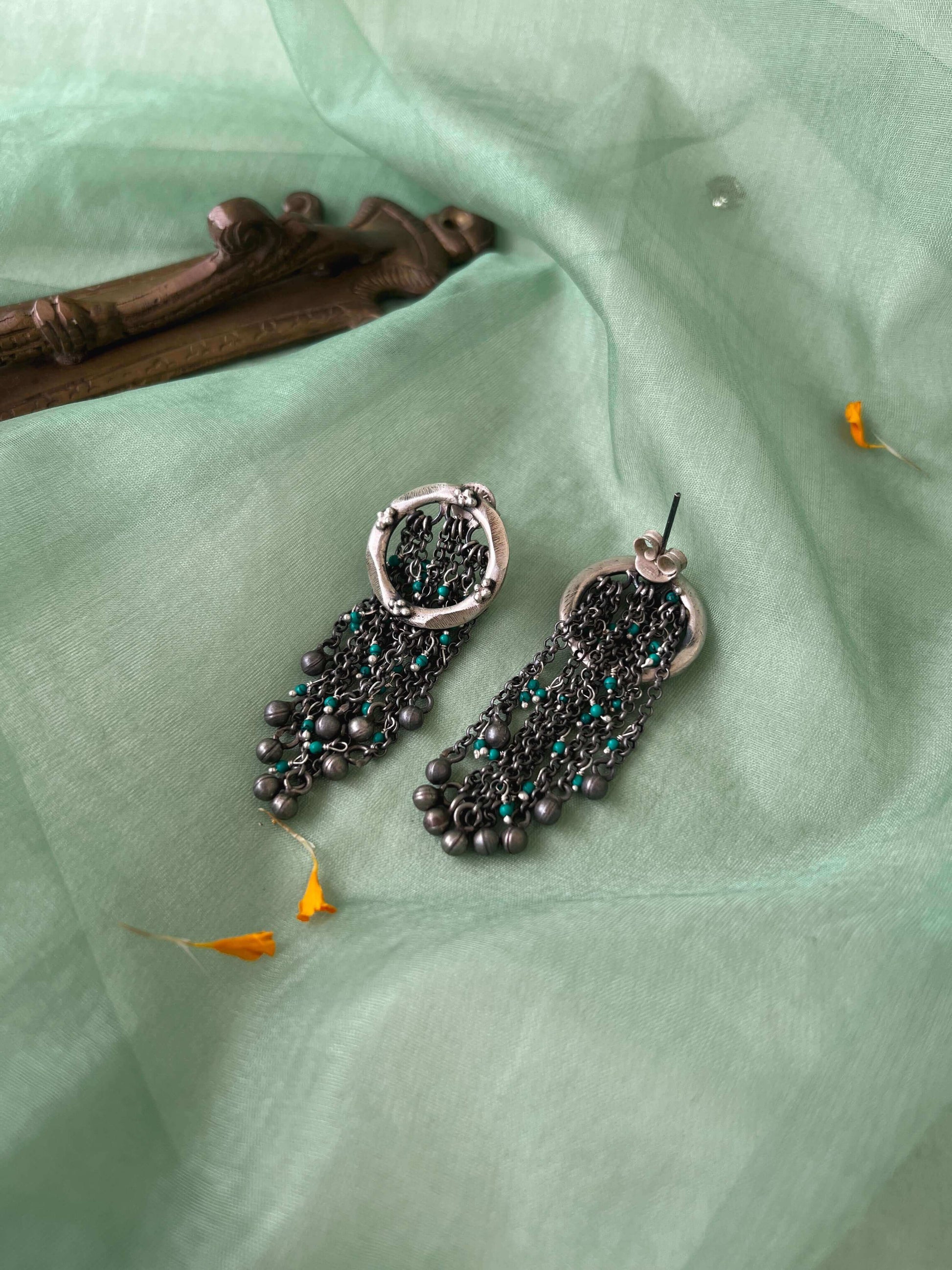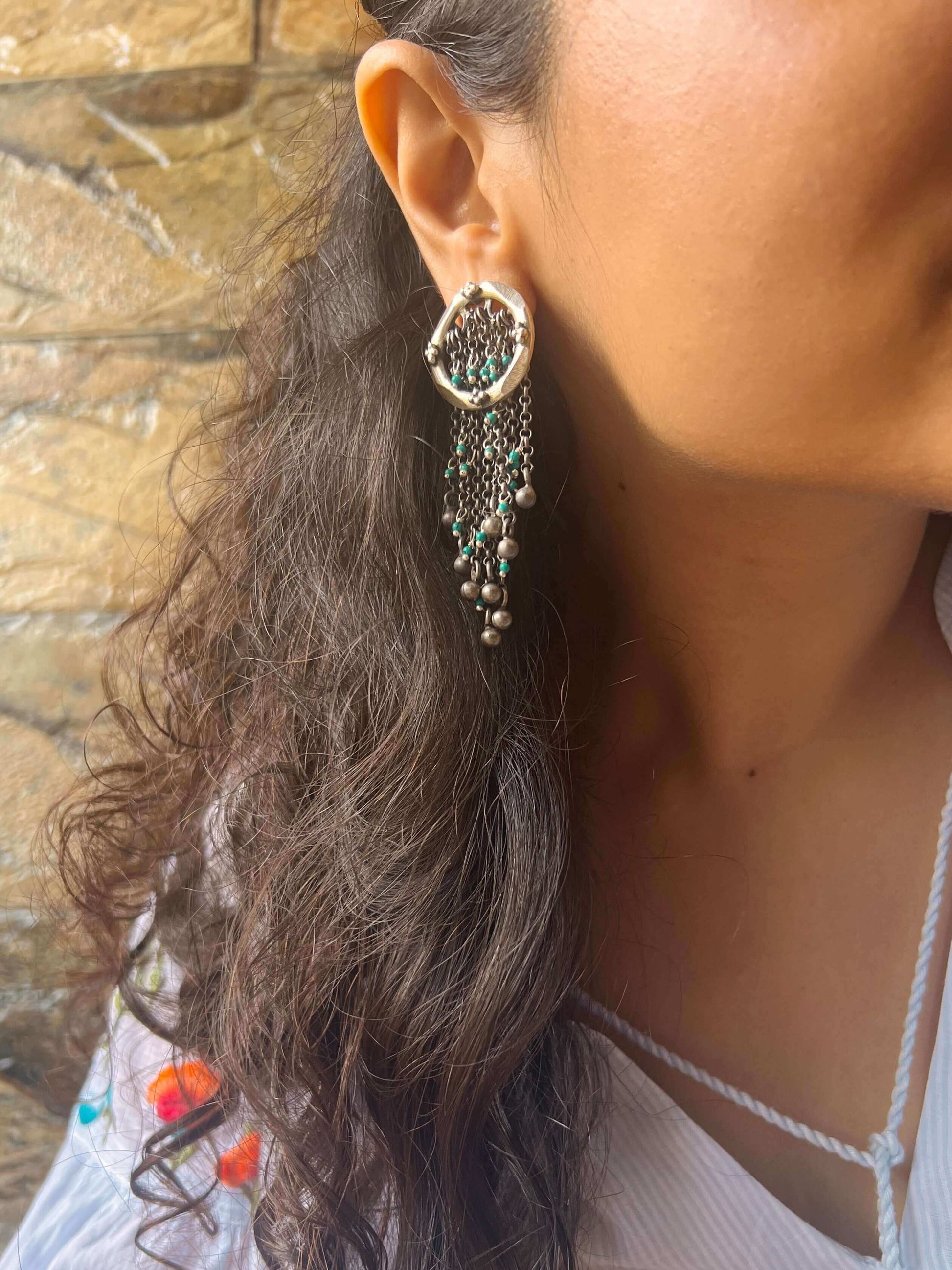 This earring features a circular disc with a rod, which has lot of chain mails suspended to it, creating a water flow kind of visual , with turquoise beads. Very edgy piece yet has a feminine touch to it.