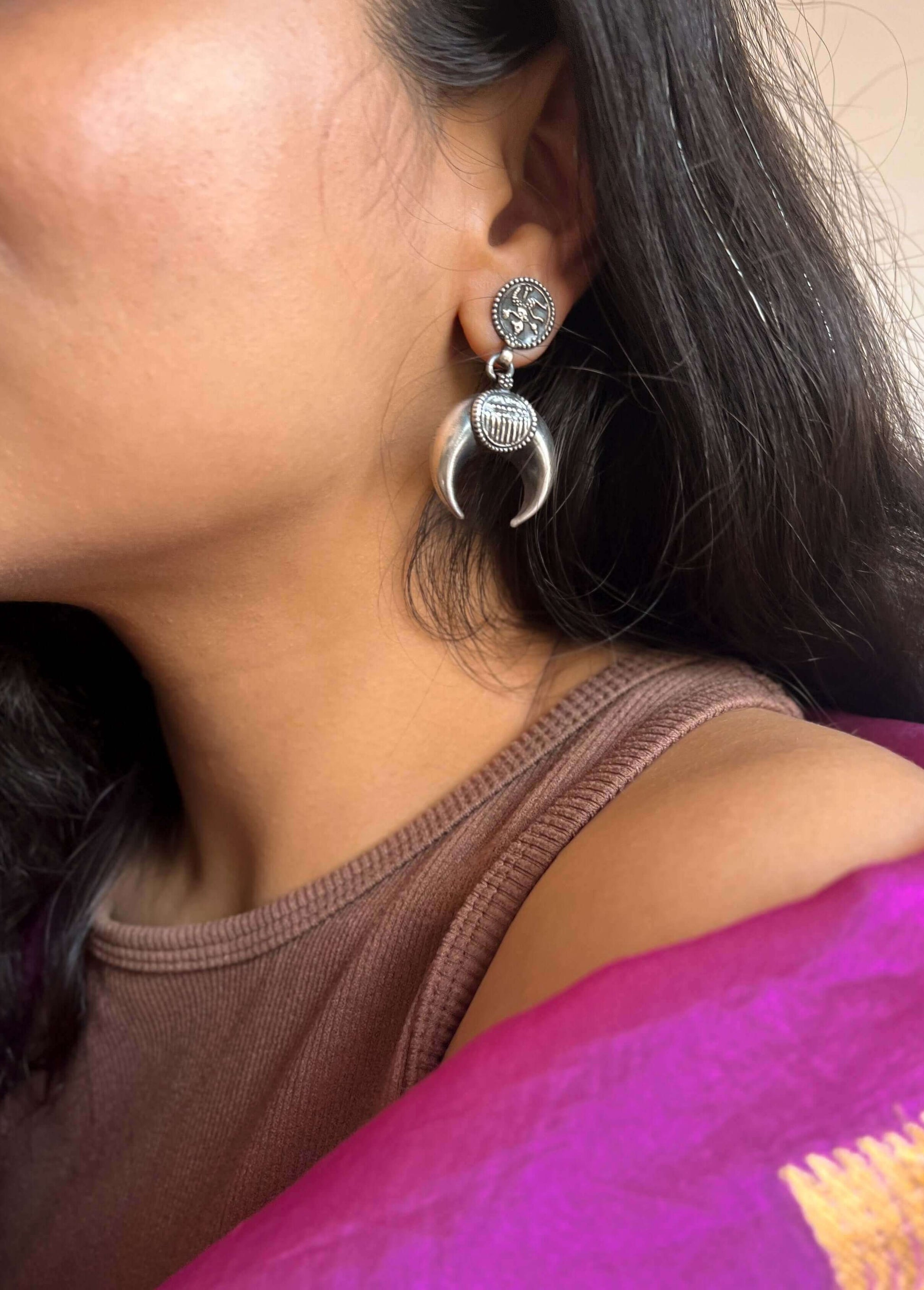 Inspired by ancient cultures, these earrings beautifully blend tribal motifs with the mystique of the moon. It has carved tribal figurine on the topper with push closure and inverted crescent moon hanging. Can be styled easily with your casuals as well as indo-westren outfits.