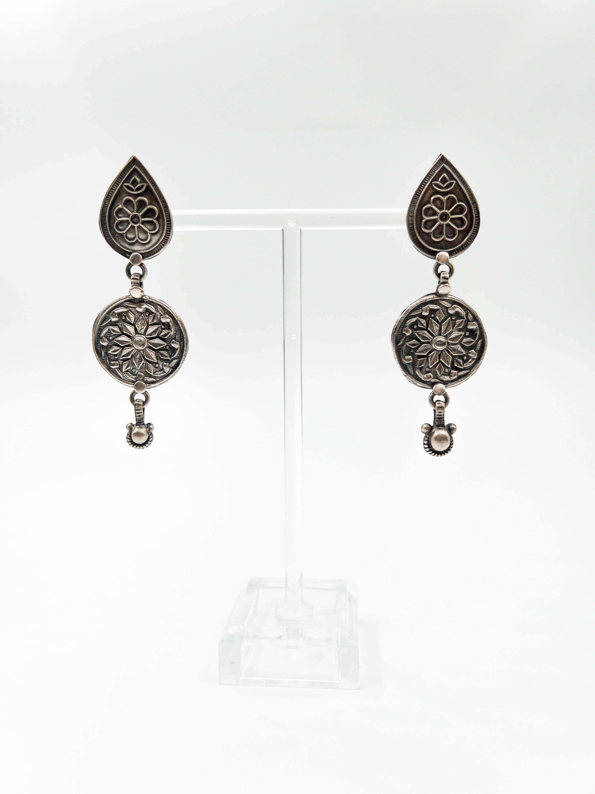 Tear drop shaped topper with flower embossing , and a circular mandala hanging with silver ghunghroo. These earrings ad required charm to any outfit, but sit very light on the ears.