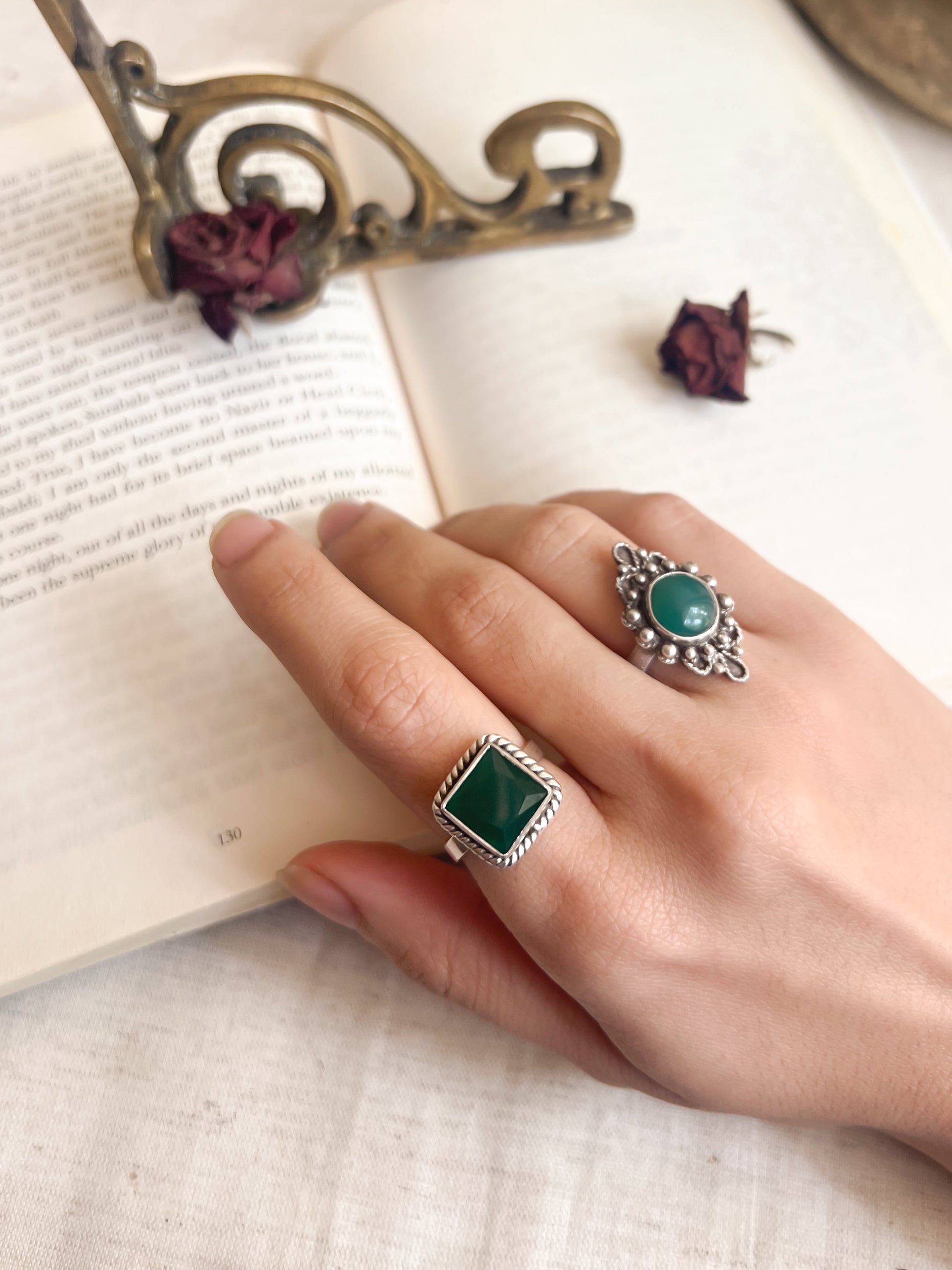 Beautiful vintage oxidized silver ring with green onyx stone in square and completed by adjustable band. A timeless accessory with an Indian touch ; perfect to add a hint of elegance and festive glamour to your look!