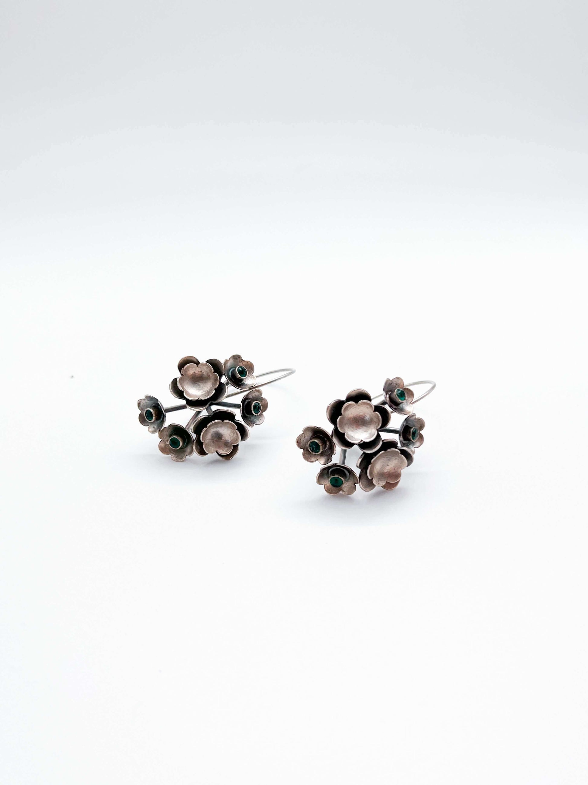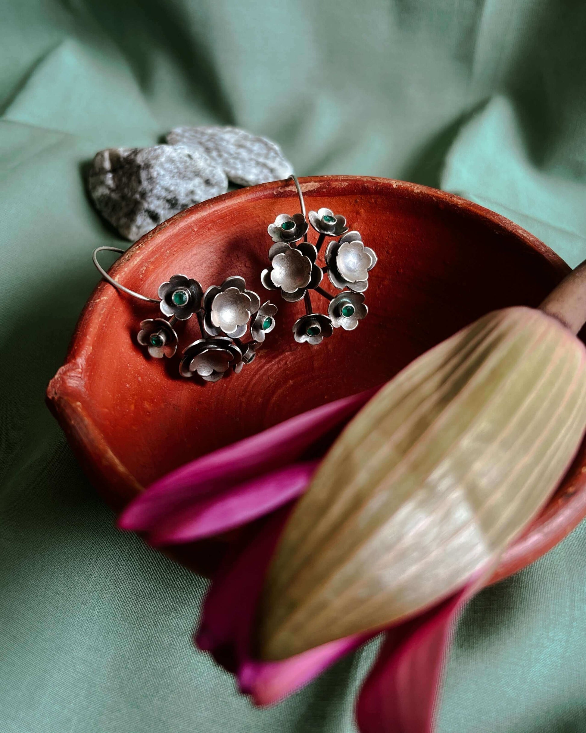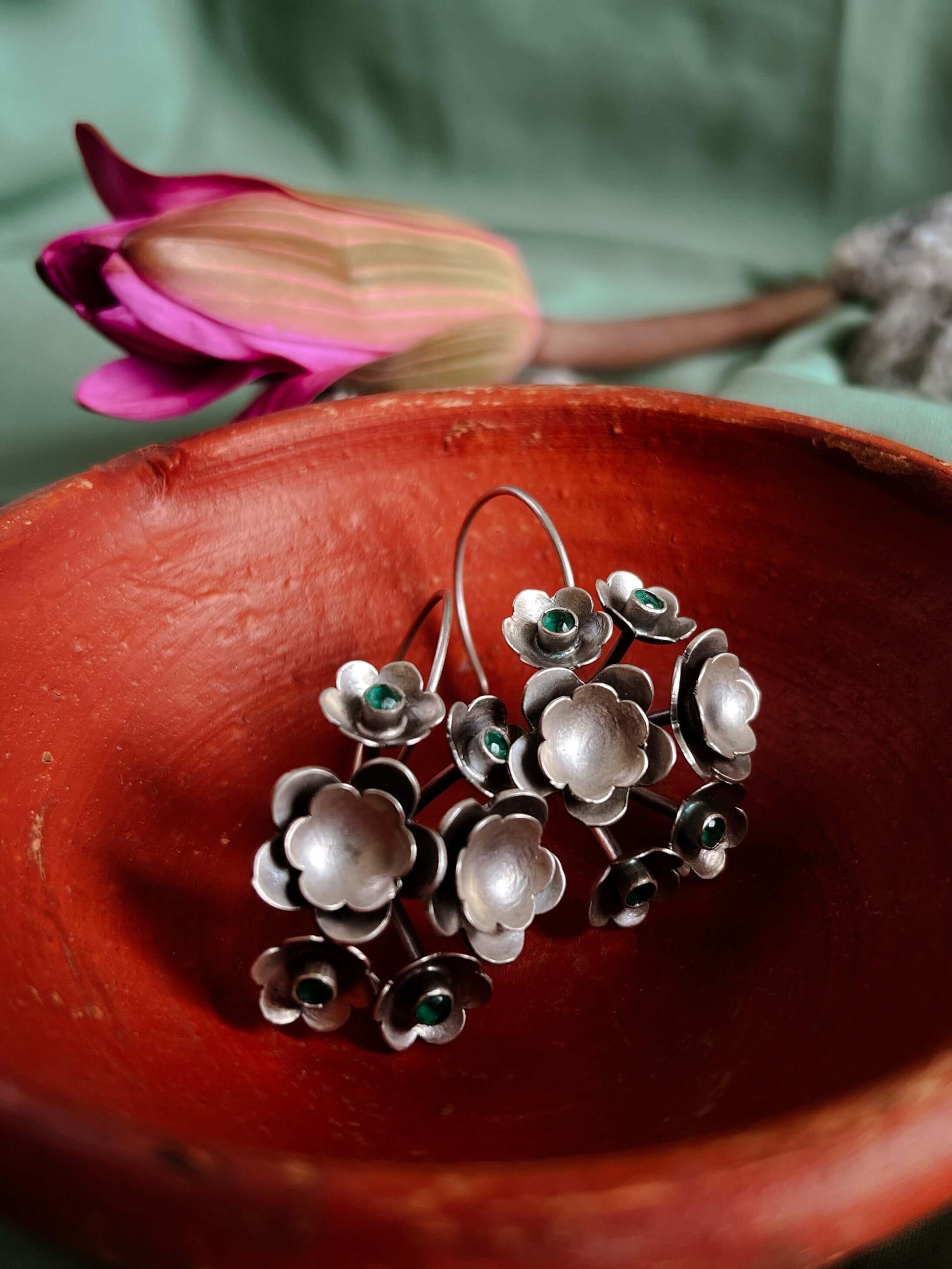 Floral-themed earring with fish hooks, has emerald stone detail at the centre. The unique design features flower motifs bunched together . These gorgeous earrings are a part of our nature inspired capsule Aranya-gatha which translates to 'the tales of the forest'.