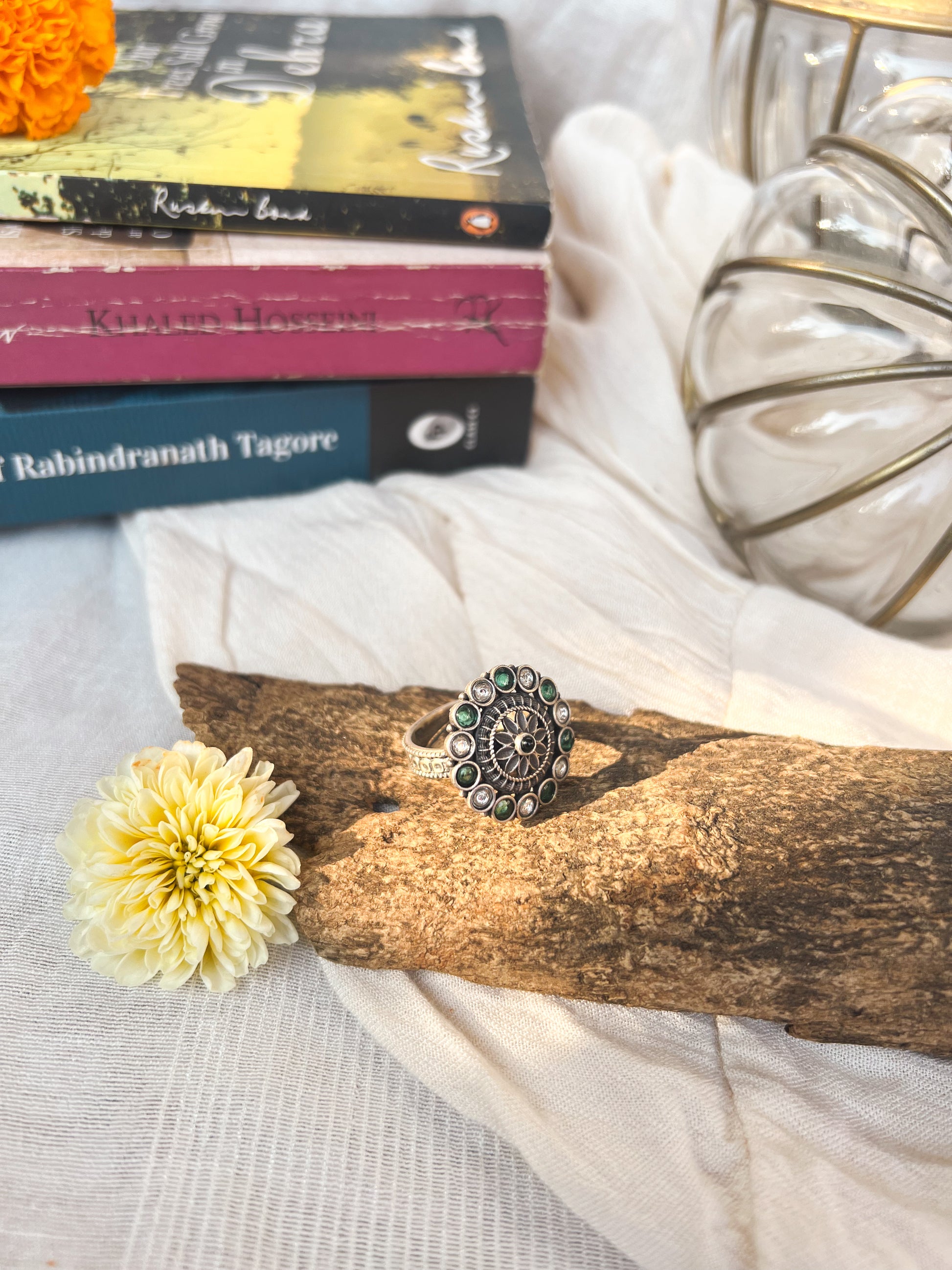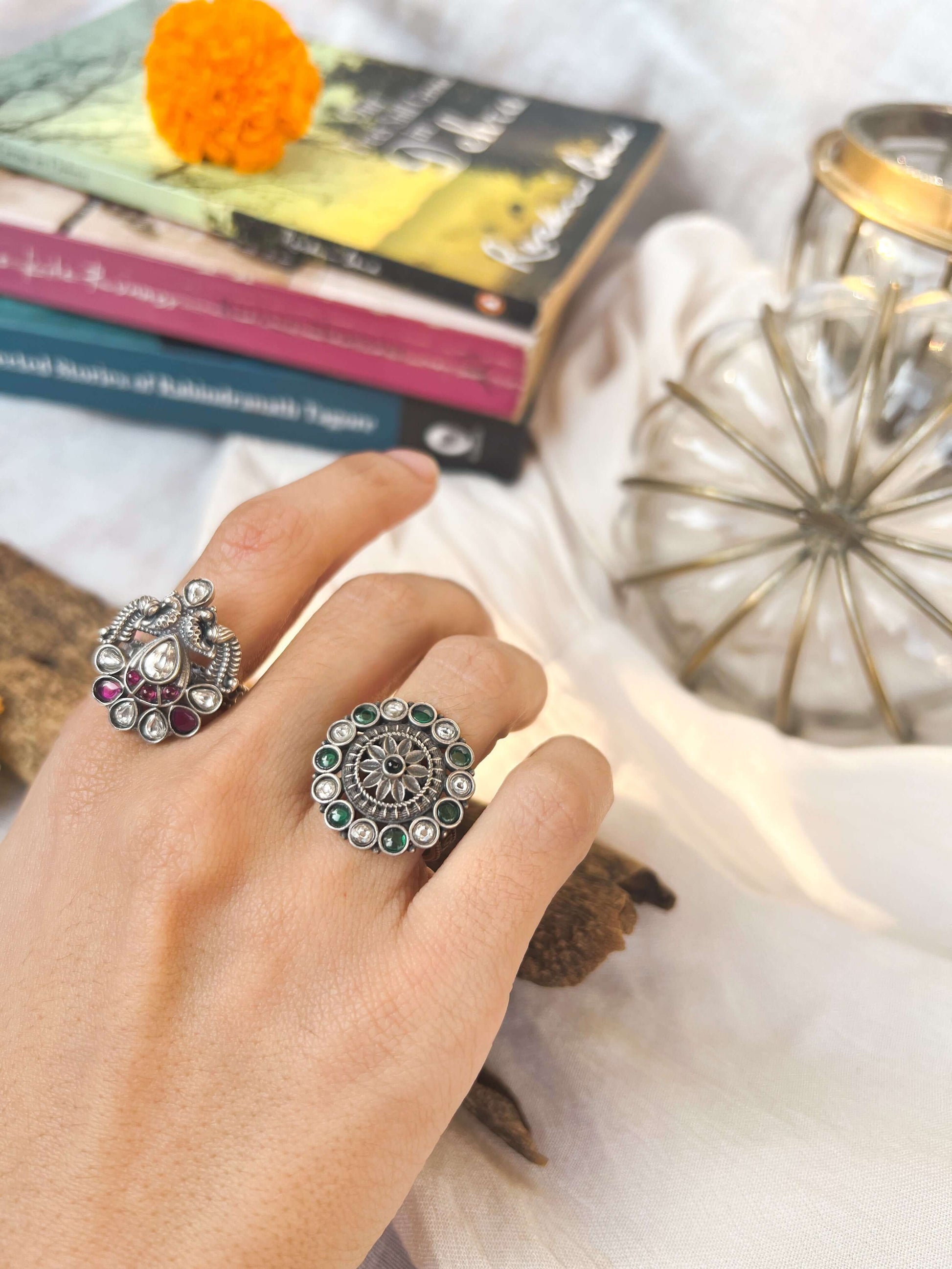 Mandala motif ring, is meticulously crafted with intricate details. The focal point of this stunning piece is a radiant emerald center, elegantly encircled by delicate silver accents. Enhancing its allure, the ring is adorned with emerald and kundan beads encircling the motif. It has a well detailed and adjustable band.