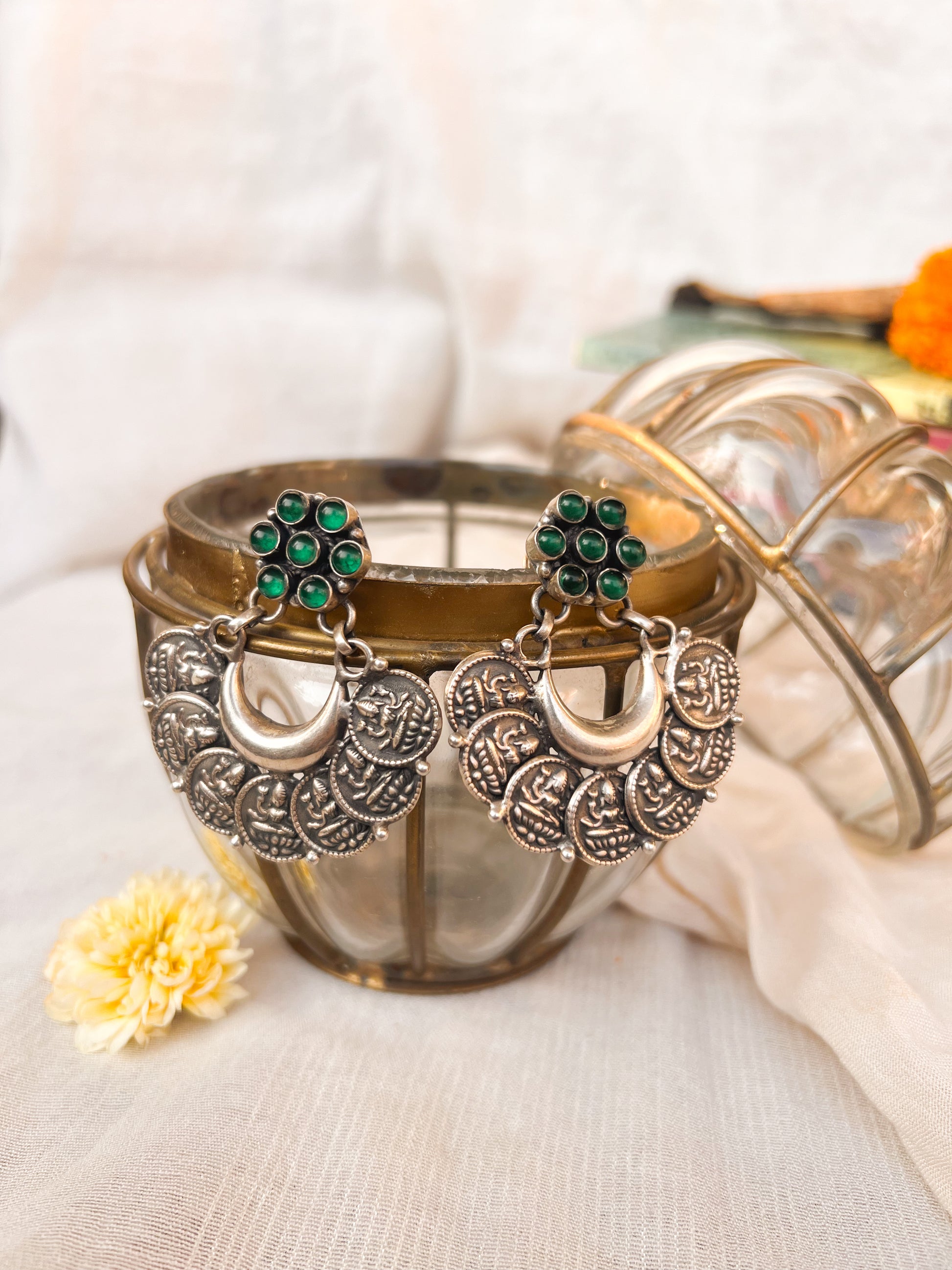 Exquisite earrings crafted in oxidized silver, featuring a captivating green onyx flower topper. These earrings are adorned with a stunning Lakshmi embossed coin, elegantly suspended in a fan shape. The combination of the oxidized silver finish and the vibrant green onyx creates a unique and eye-catching design.