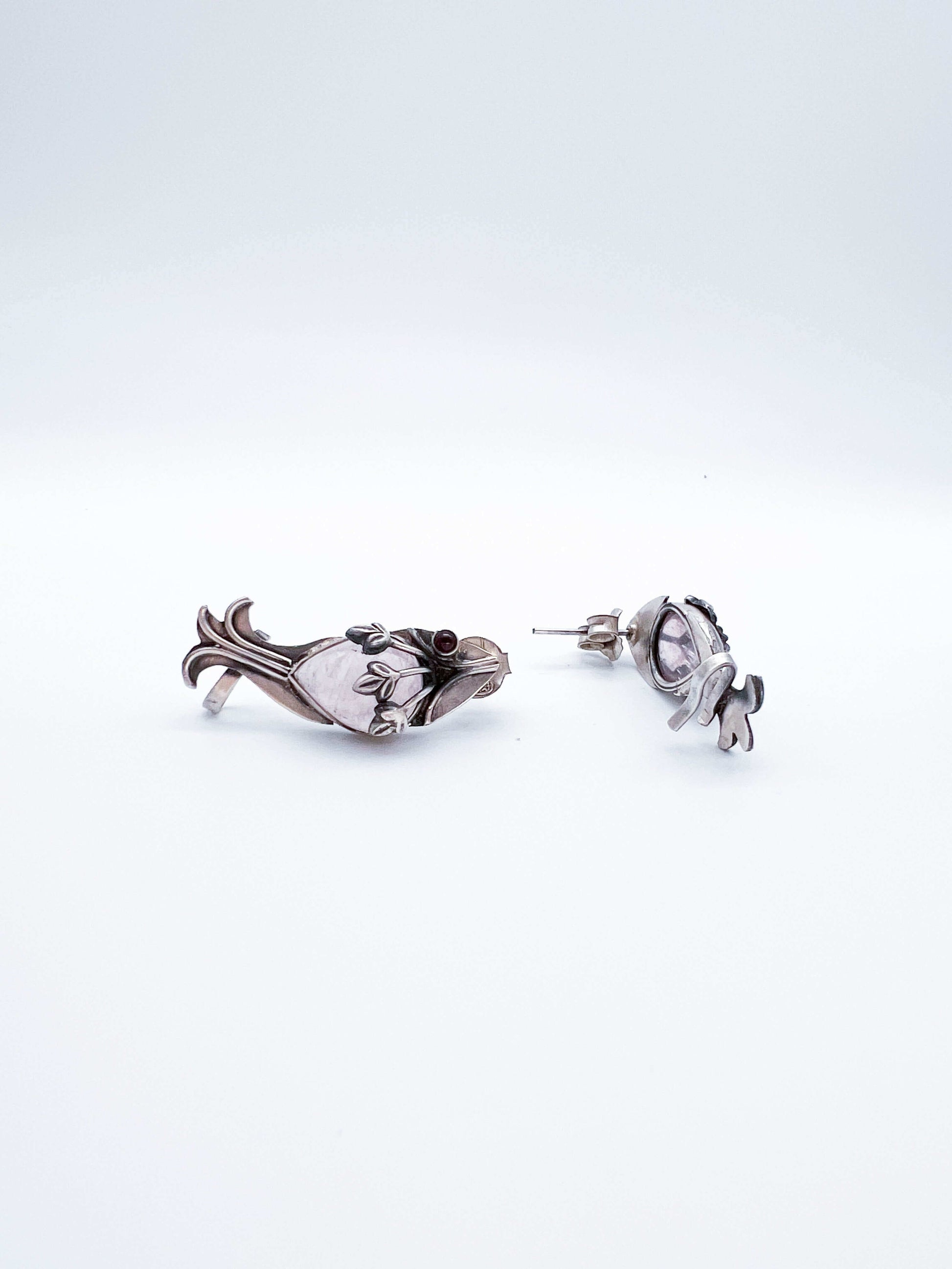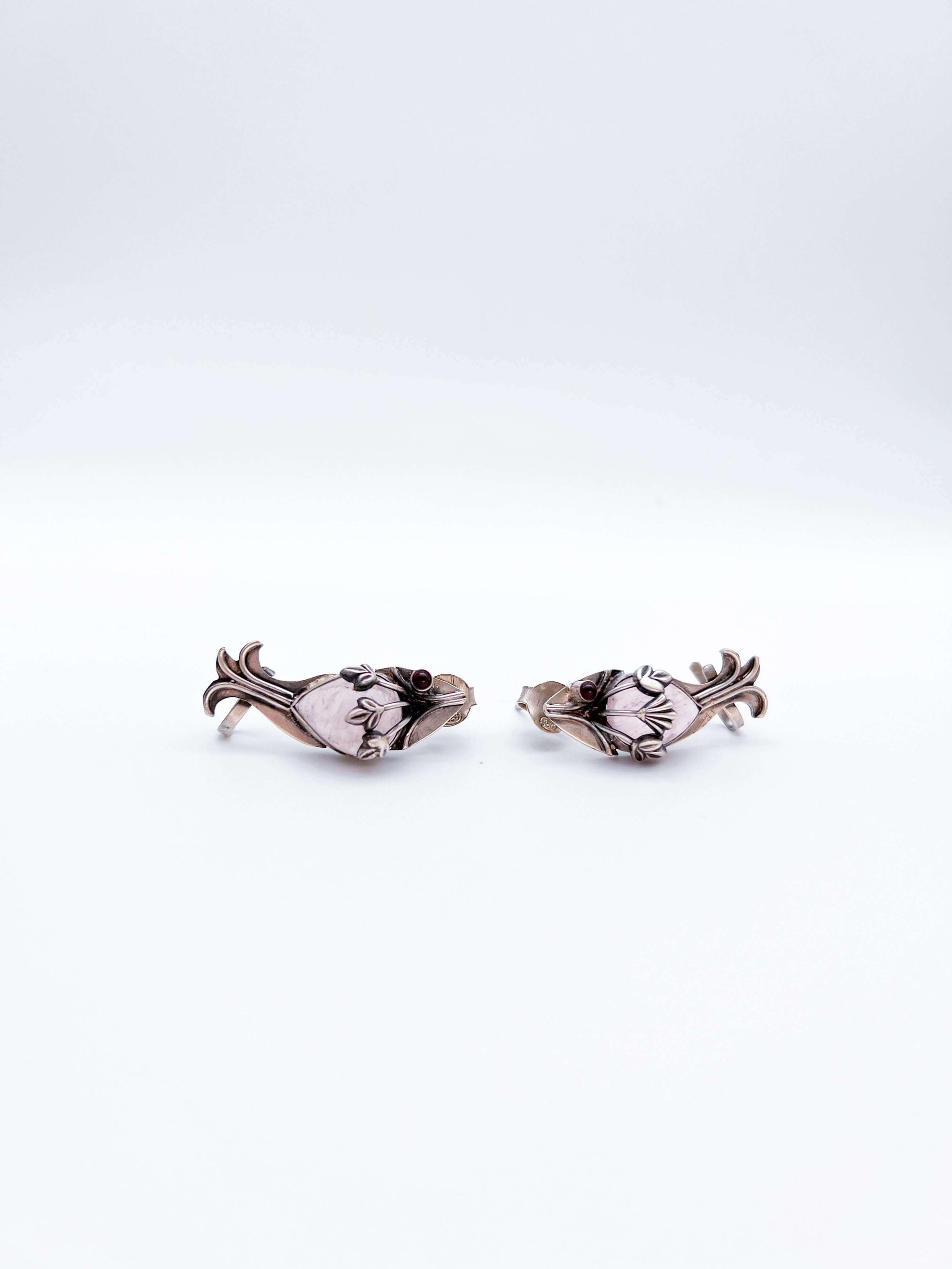 Charming fish-shaped ear studs with a convenient hook to fix securely on the earlobe. It has pink opal stones as the body and delicately carved planters around it with ruby stones as fish eye. We also have a matching pendant if you wish to style it with the earrings.