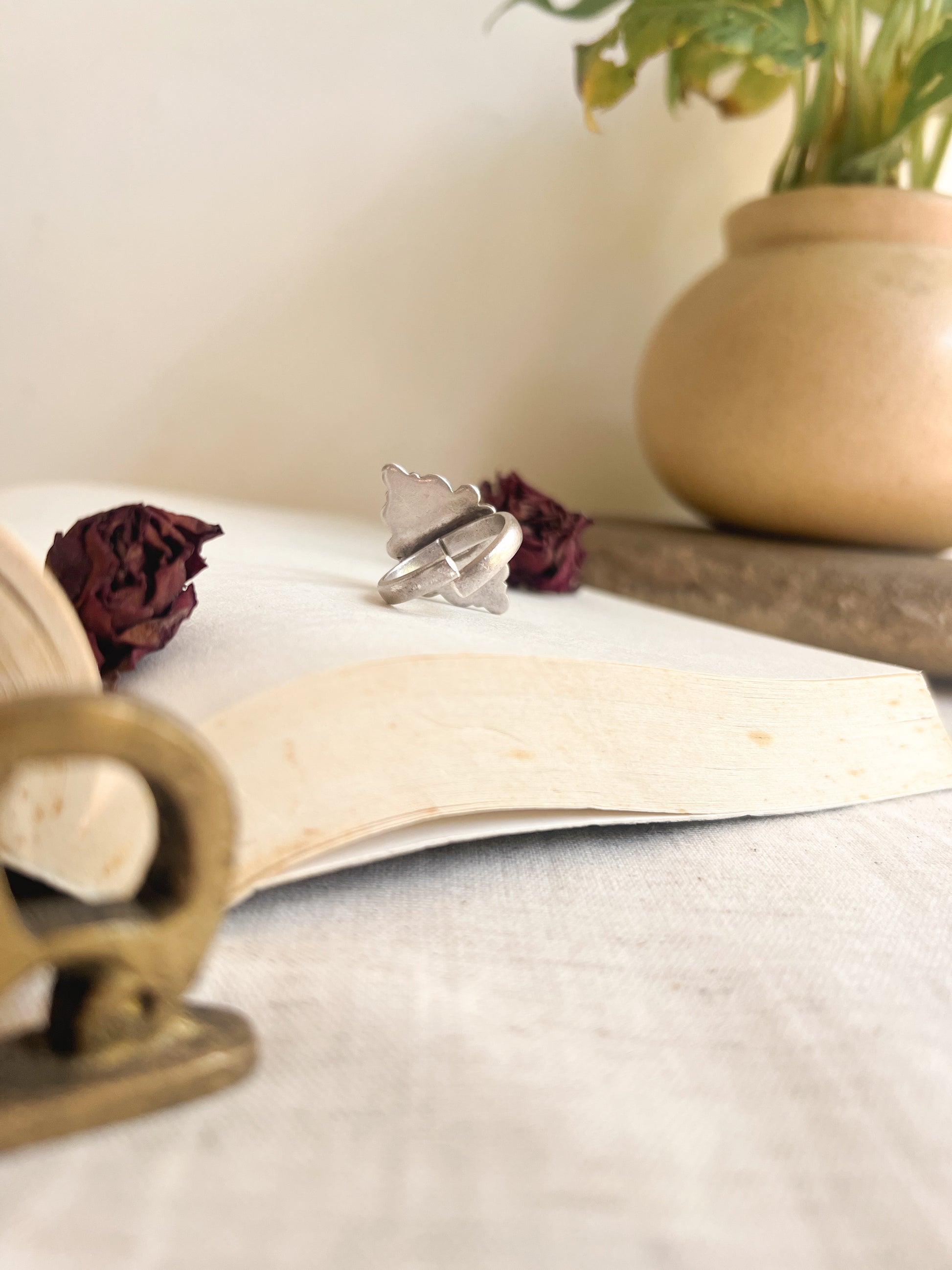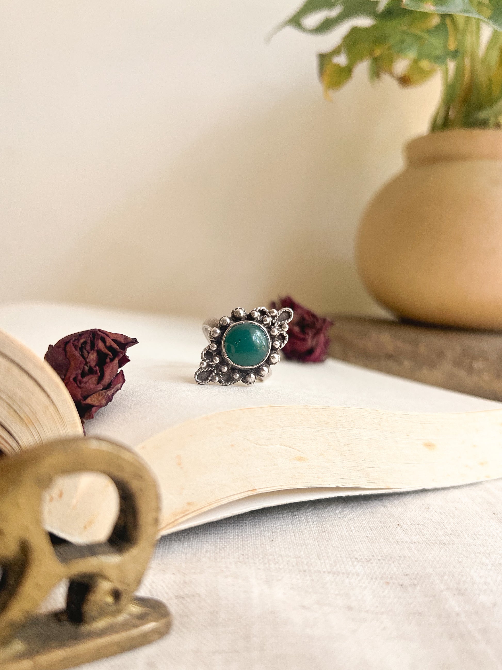 Beautiful vintage oxidized silver ring with green onyx stone surrounded by elaborate scallop detail and completed by adjustable band. A timeless accessory with an Indian touch ; perfect to add a hint of elegance and festive glamour to your look!