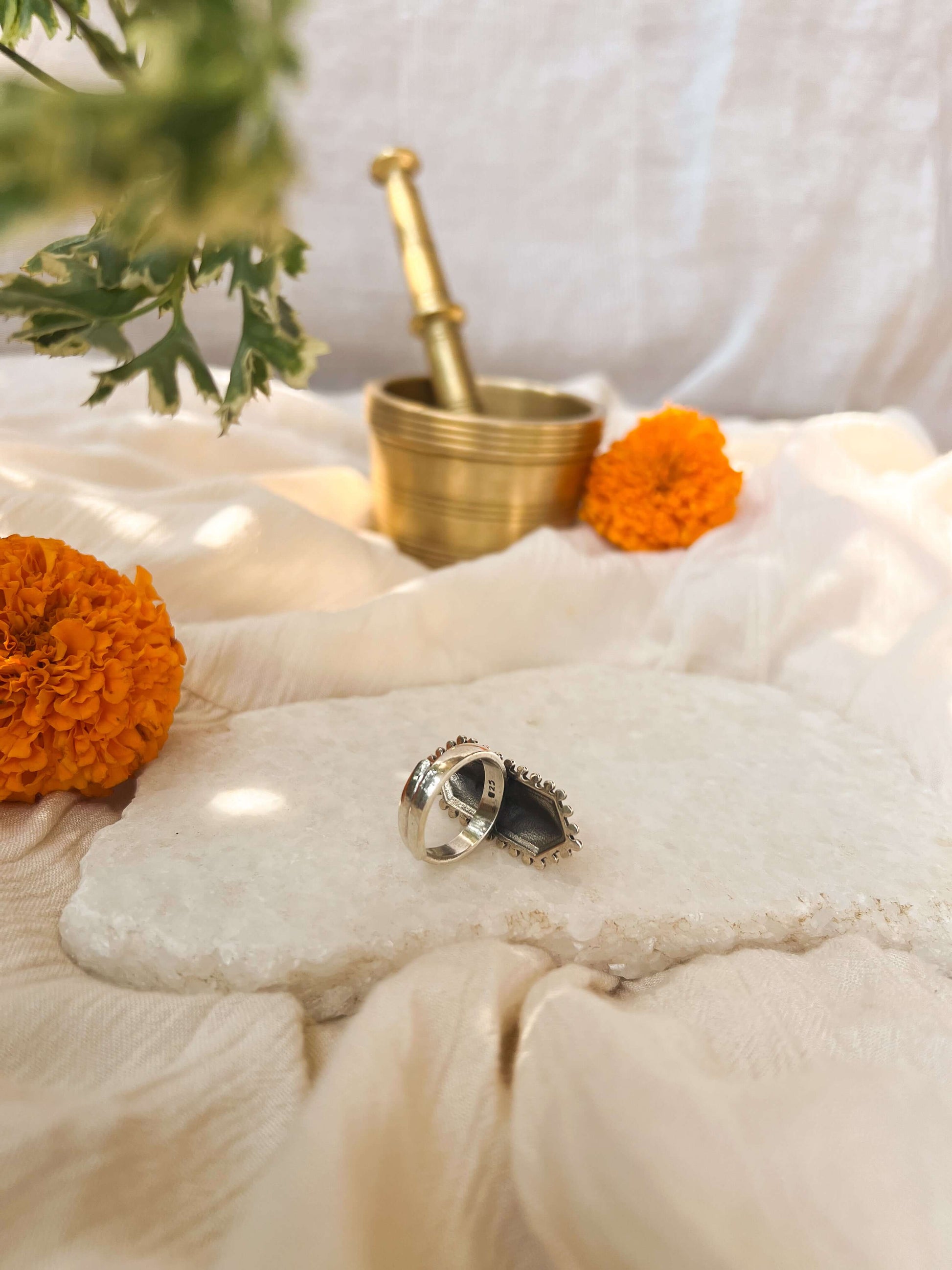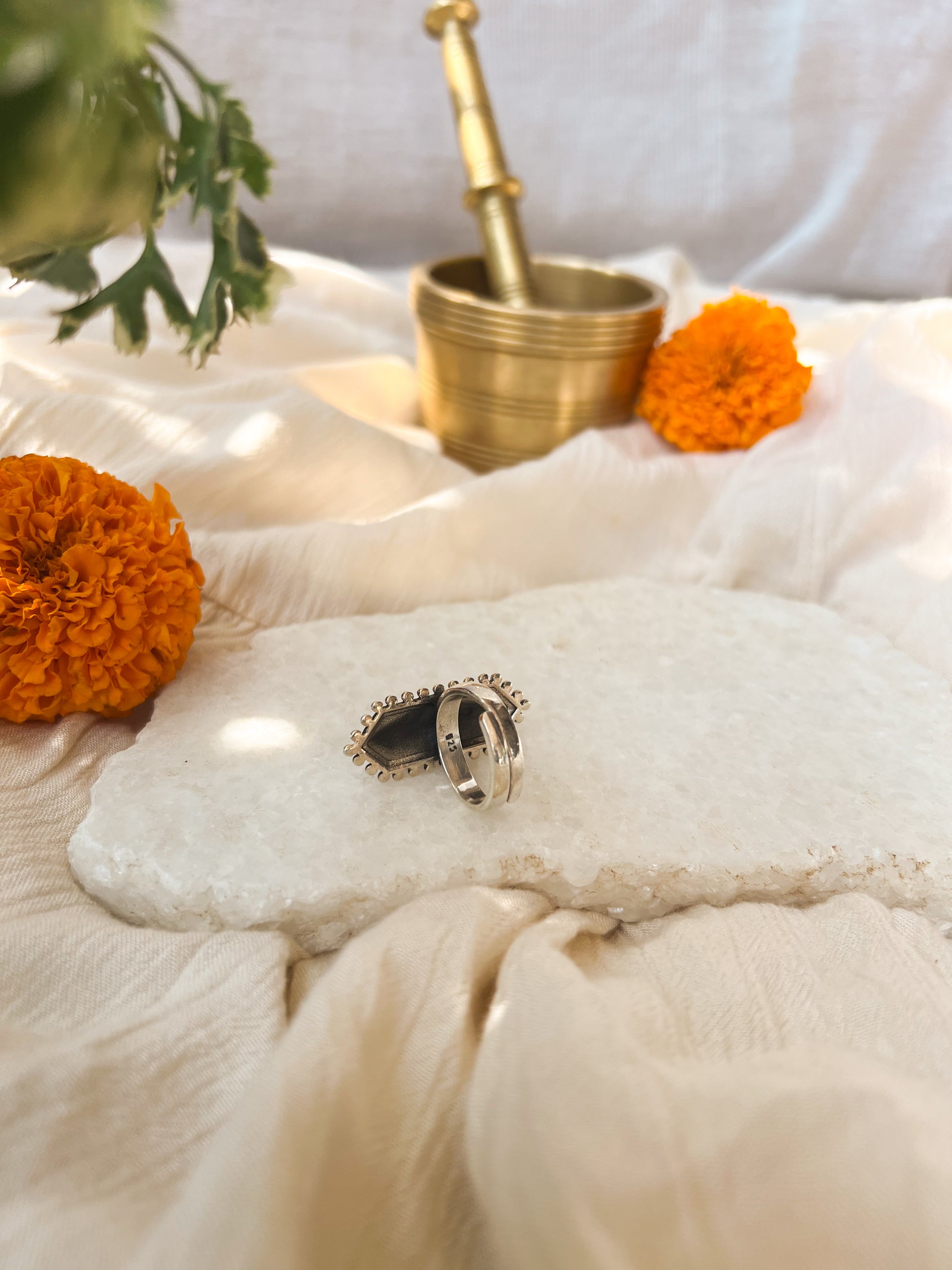 Whether you're dressing up for a special occasion or looking to add some edge to your everyday look, this Chunky Silver Ring is the perfect choice. So go ahead, let your fingers do the talking and make a bold statement with this eye-catching piece of jewelry! Ghunghroo detail makes it playful and adjustable for easy wearability.