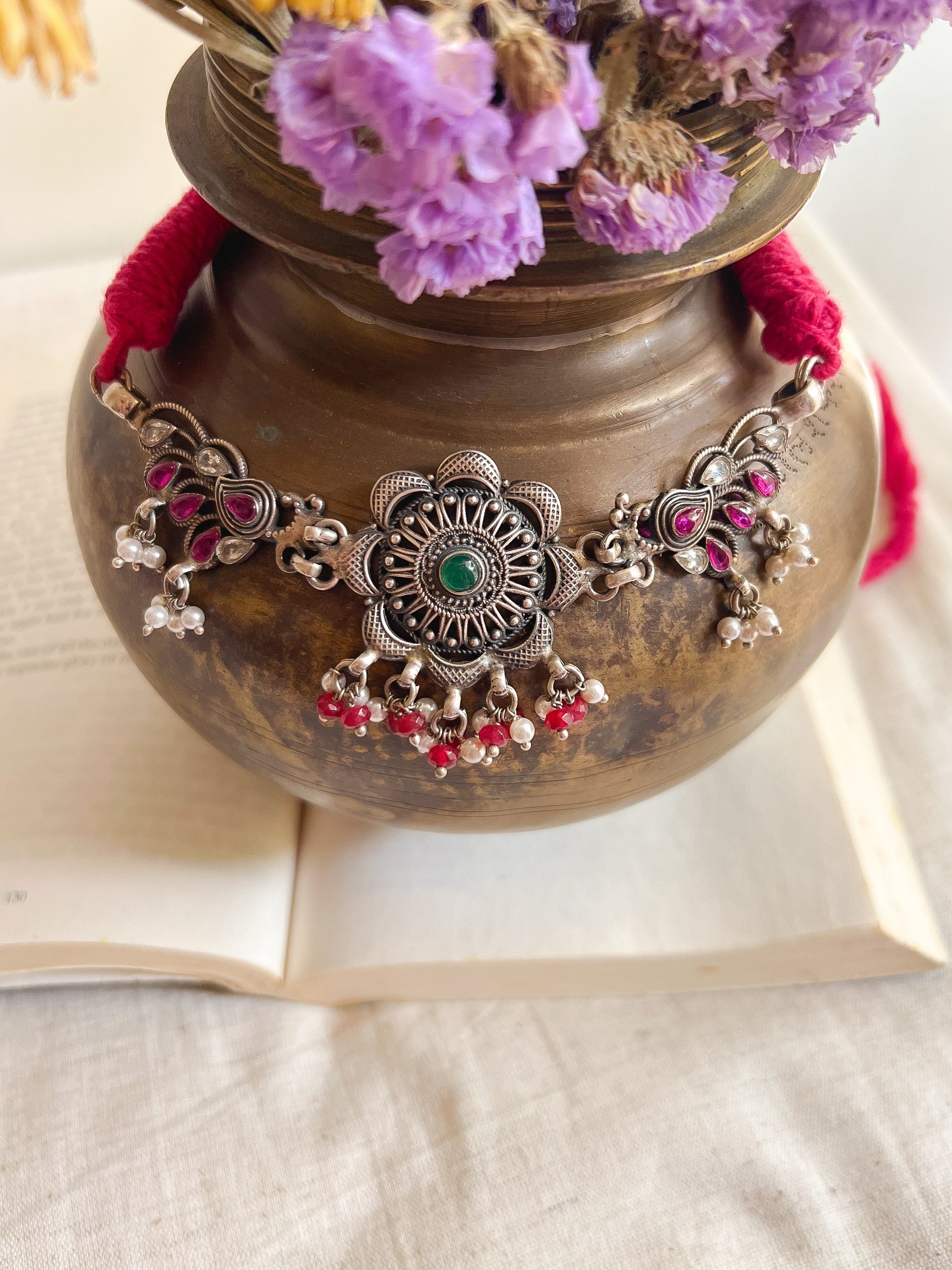 Mayur silver choker with ruby cluster pearls and jade stones