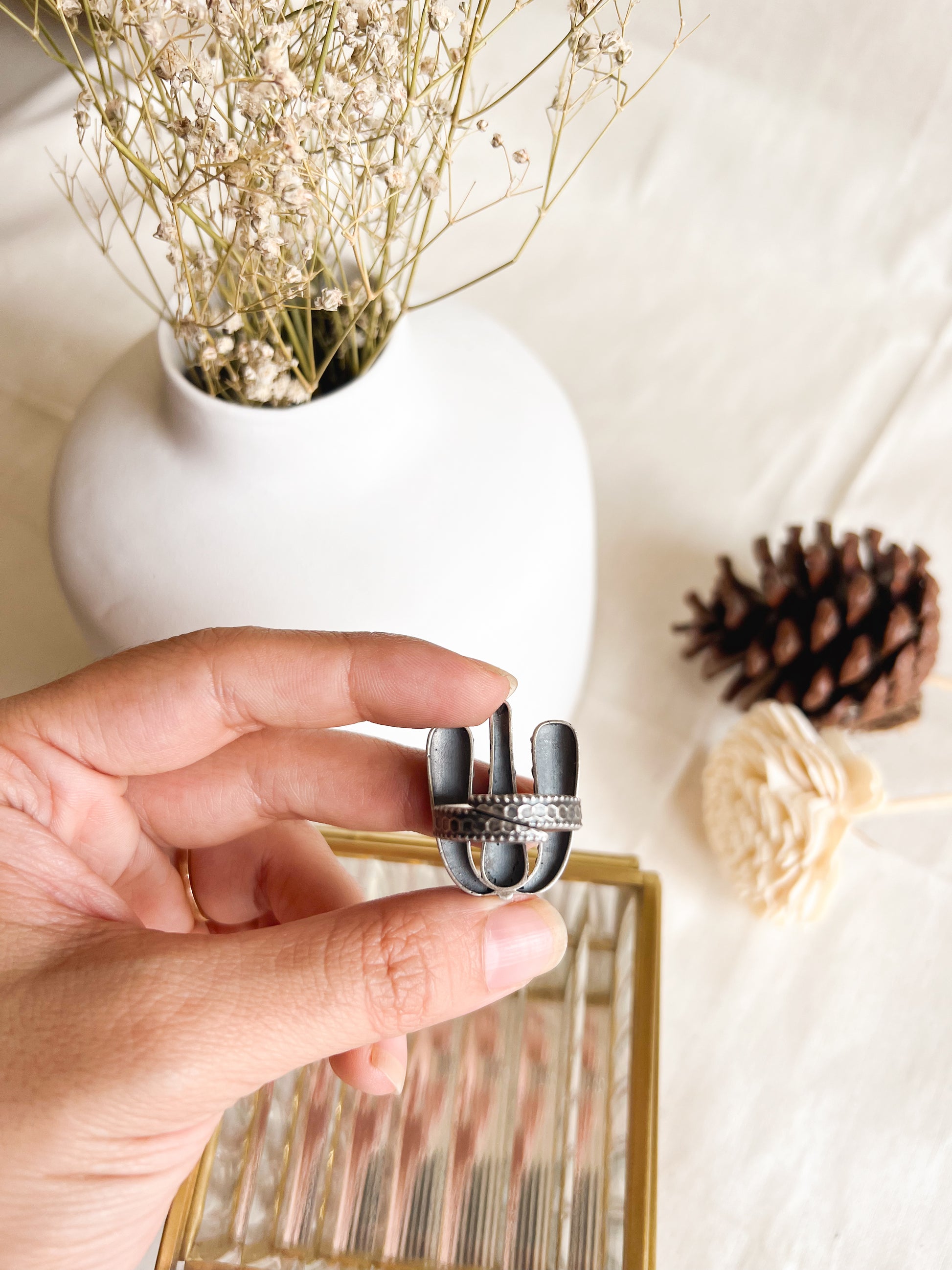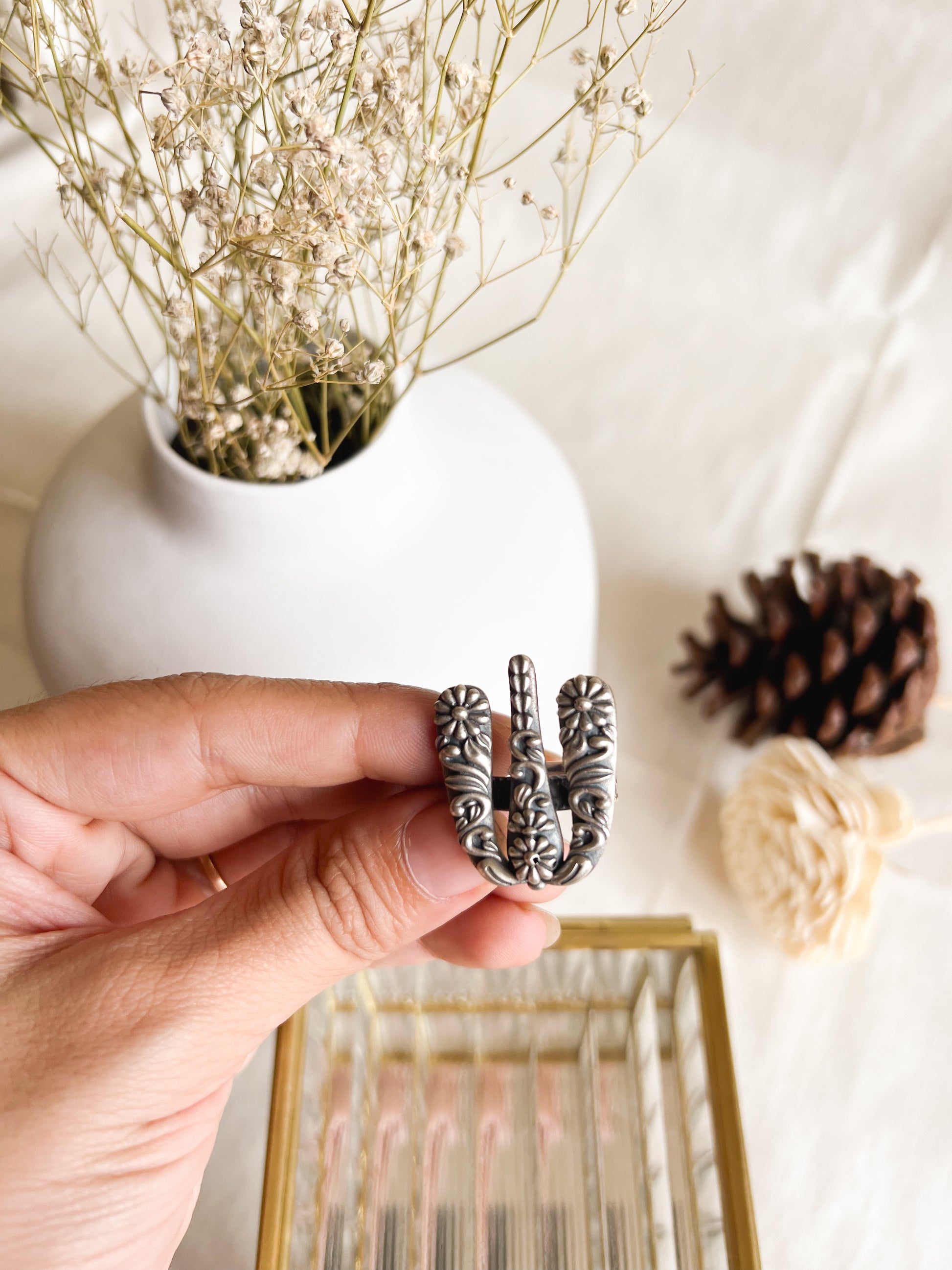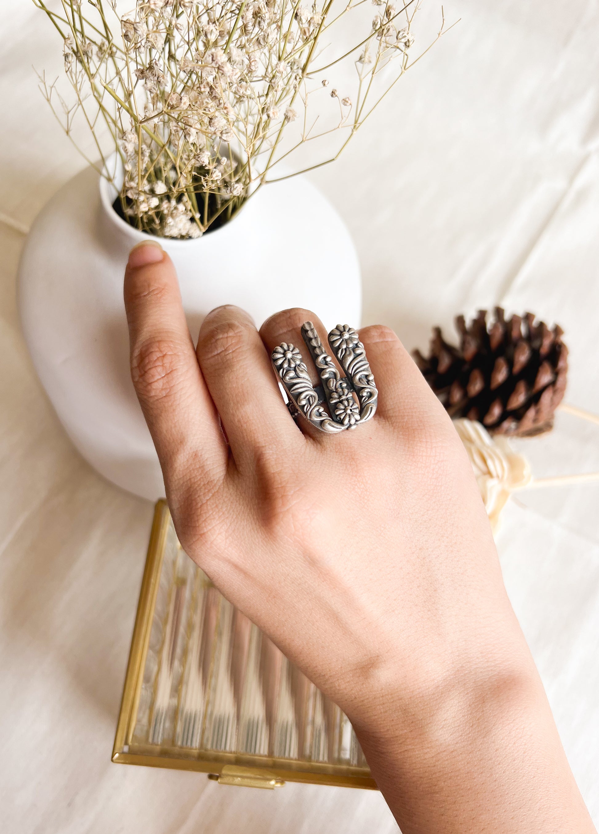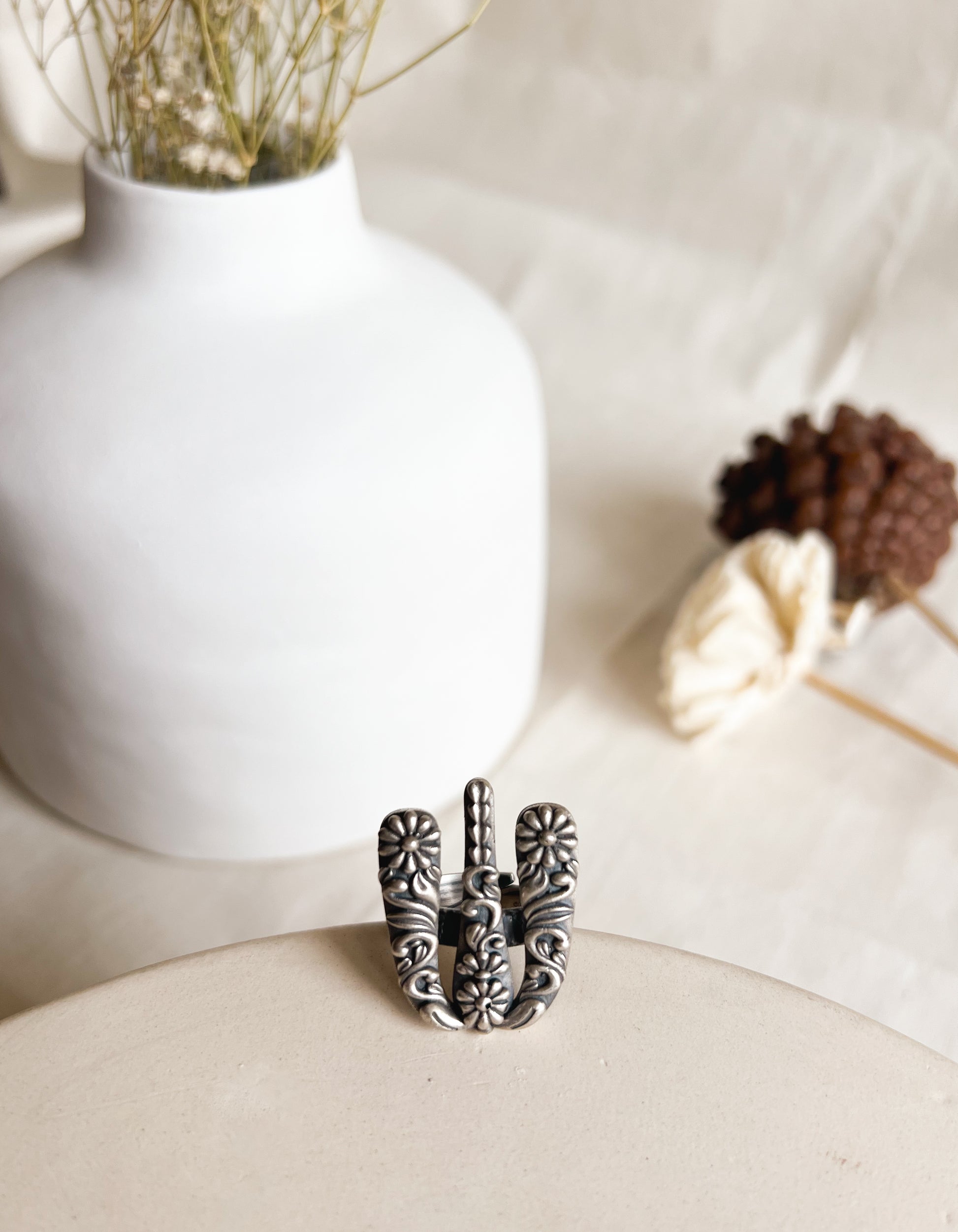 This oxidised silver ring features a shiva tri fork symbol with intricate floral details embossed on the surface. The adjustable design ensures a comfortable fit for any finger size, making it a versatile and stylish accessory for any occasion.