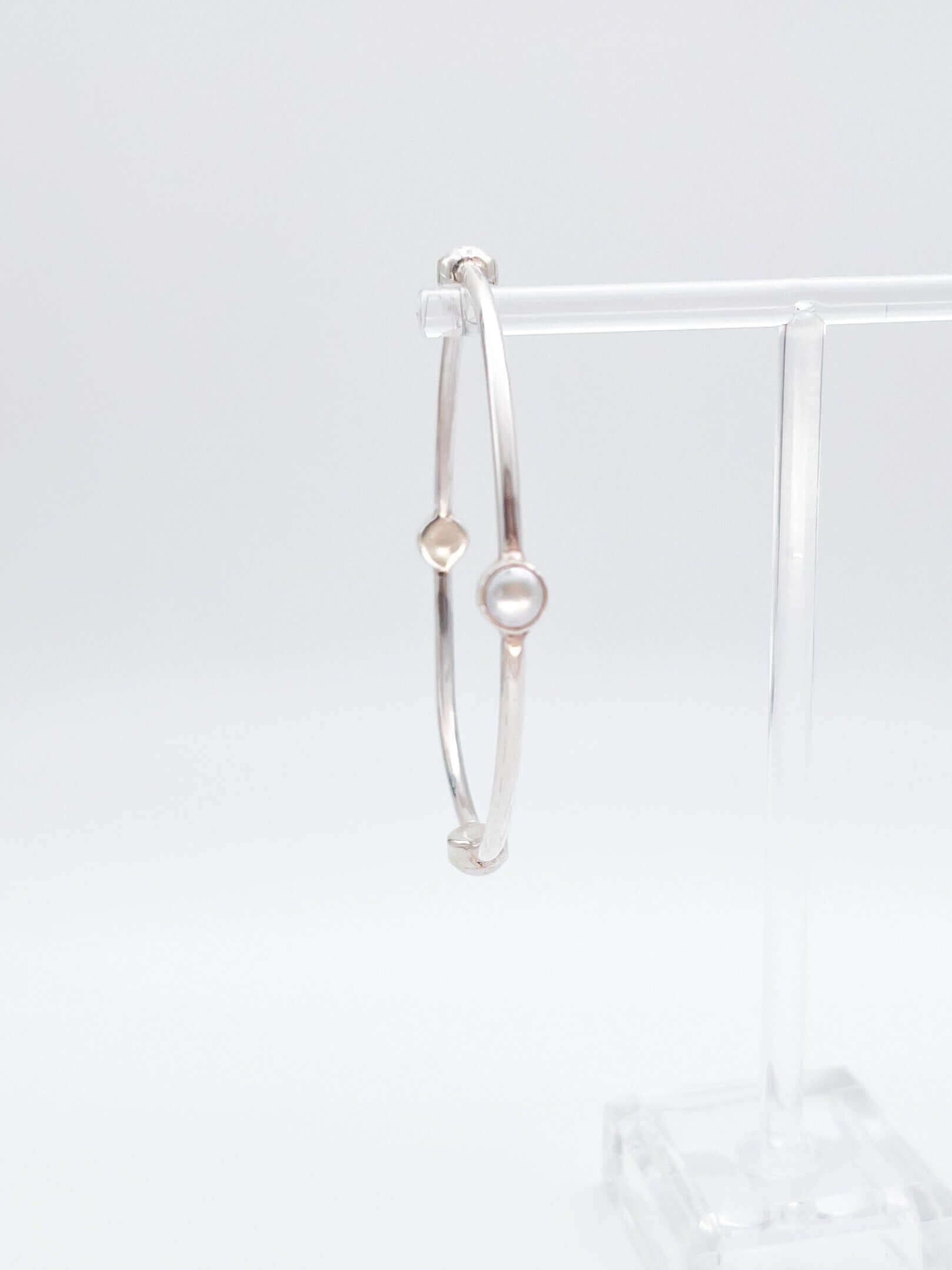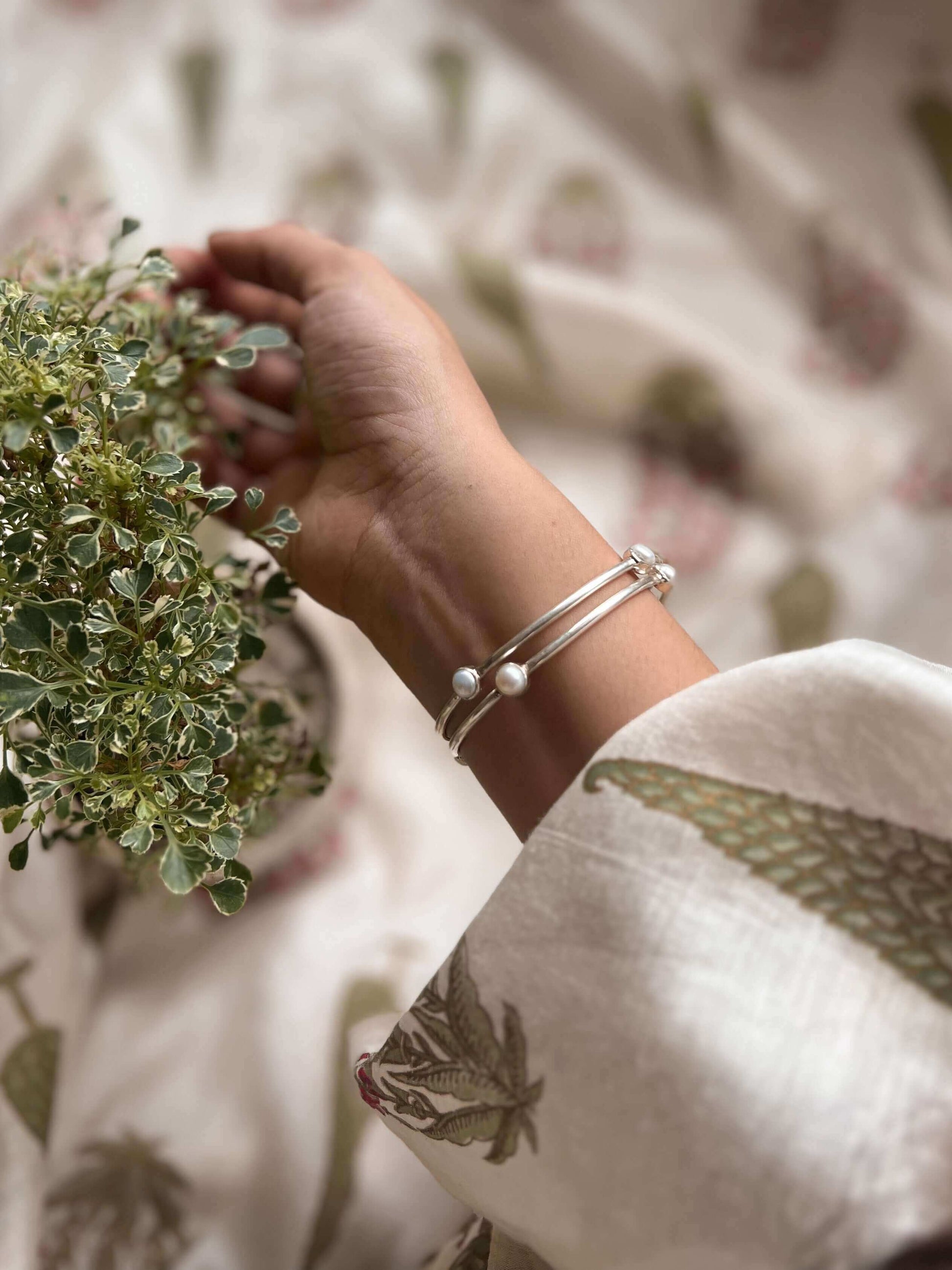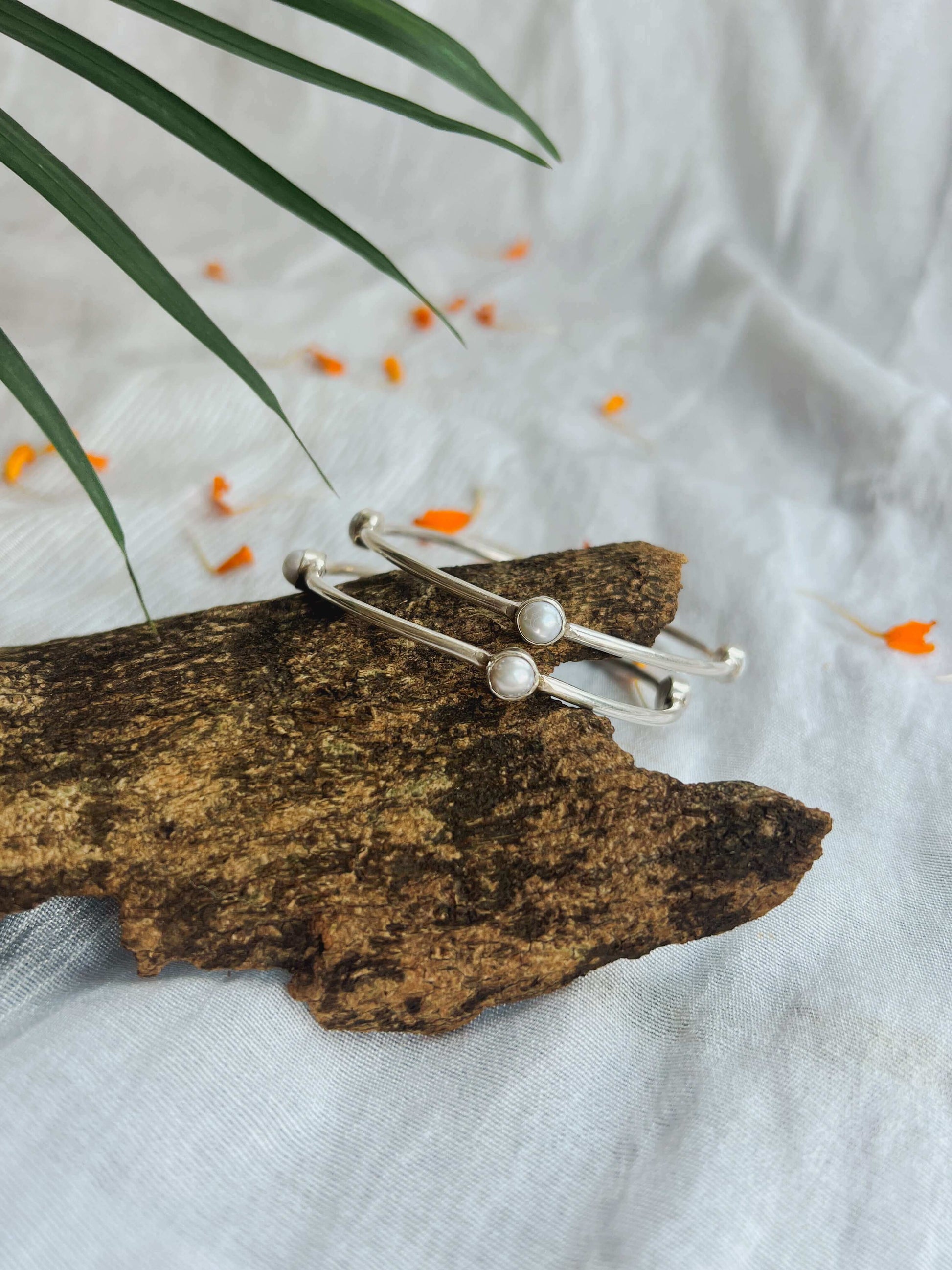The half pearls embedded on four sides of the bangle compliments the silver metal, giving a very elegant look. Simple and feminine , this can easily become your everyday bangles.