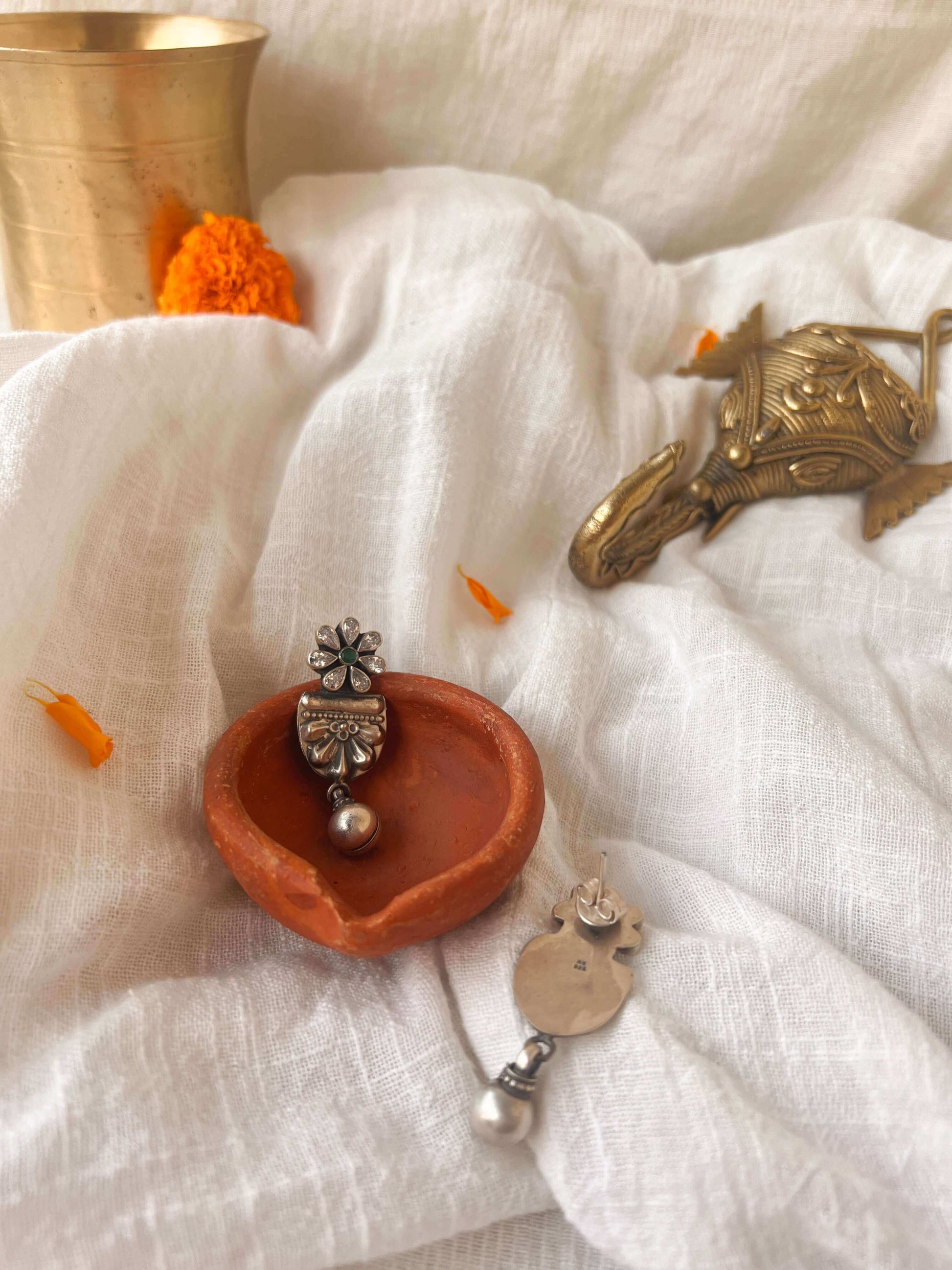 These delicate silver earrings are perfect for wearing on any light occasion and also makes for a great gift for your loved ones. The flower design on the top of the earring and the semi-circle embossed charm adds a distinctive touch. Silver bead hanging from the earring adds movement and sparkle.