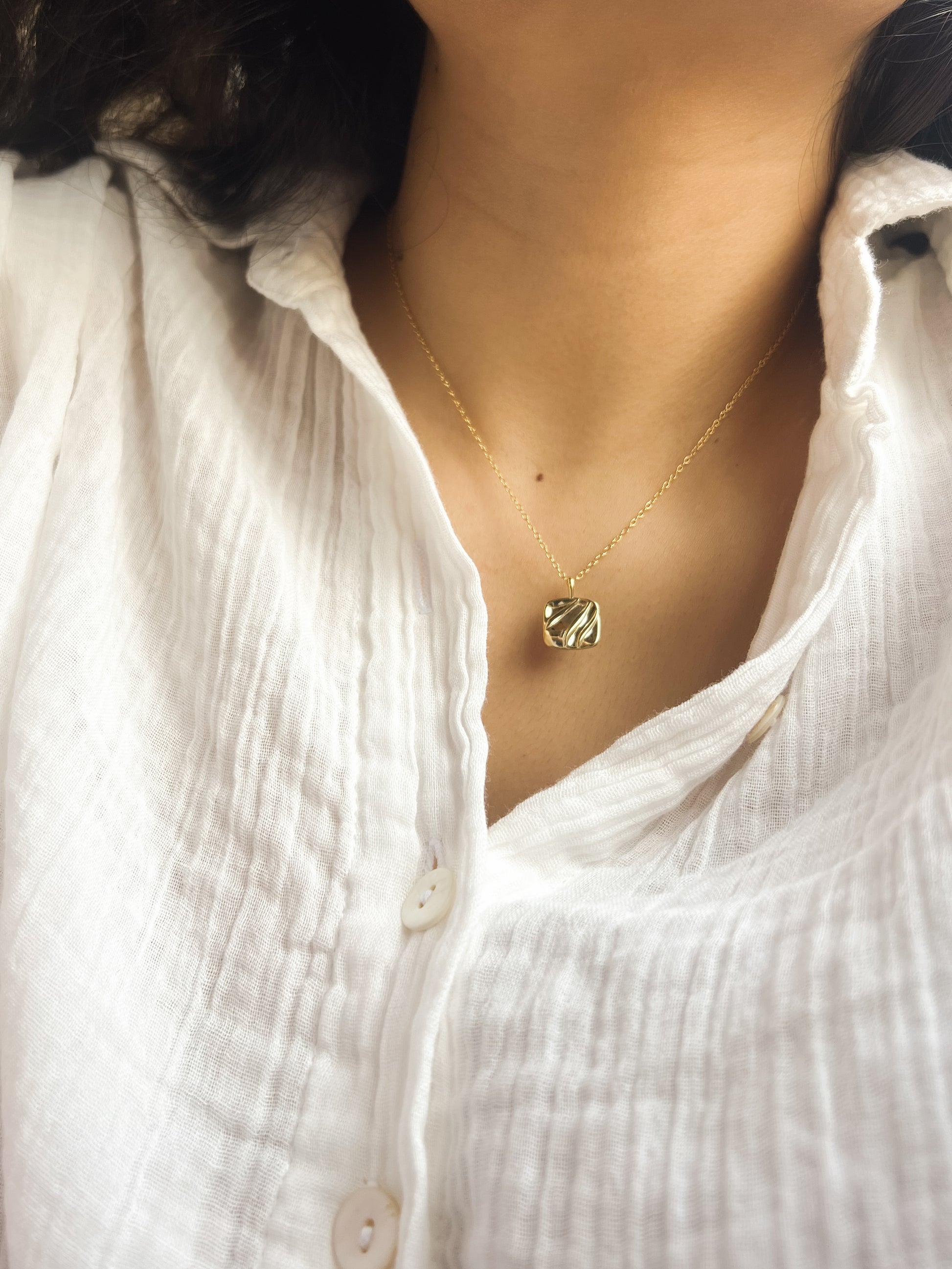 Elevate your jewelry collection with our exquisite gold plated silver chain! The adjustable closure ensures a comfortable and customizable fit, while the square charm showcases a stunning organic wave embossed design. Whether you're dressing up or keeping it casual, this piece is a must-have for any fashion lover.