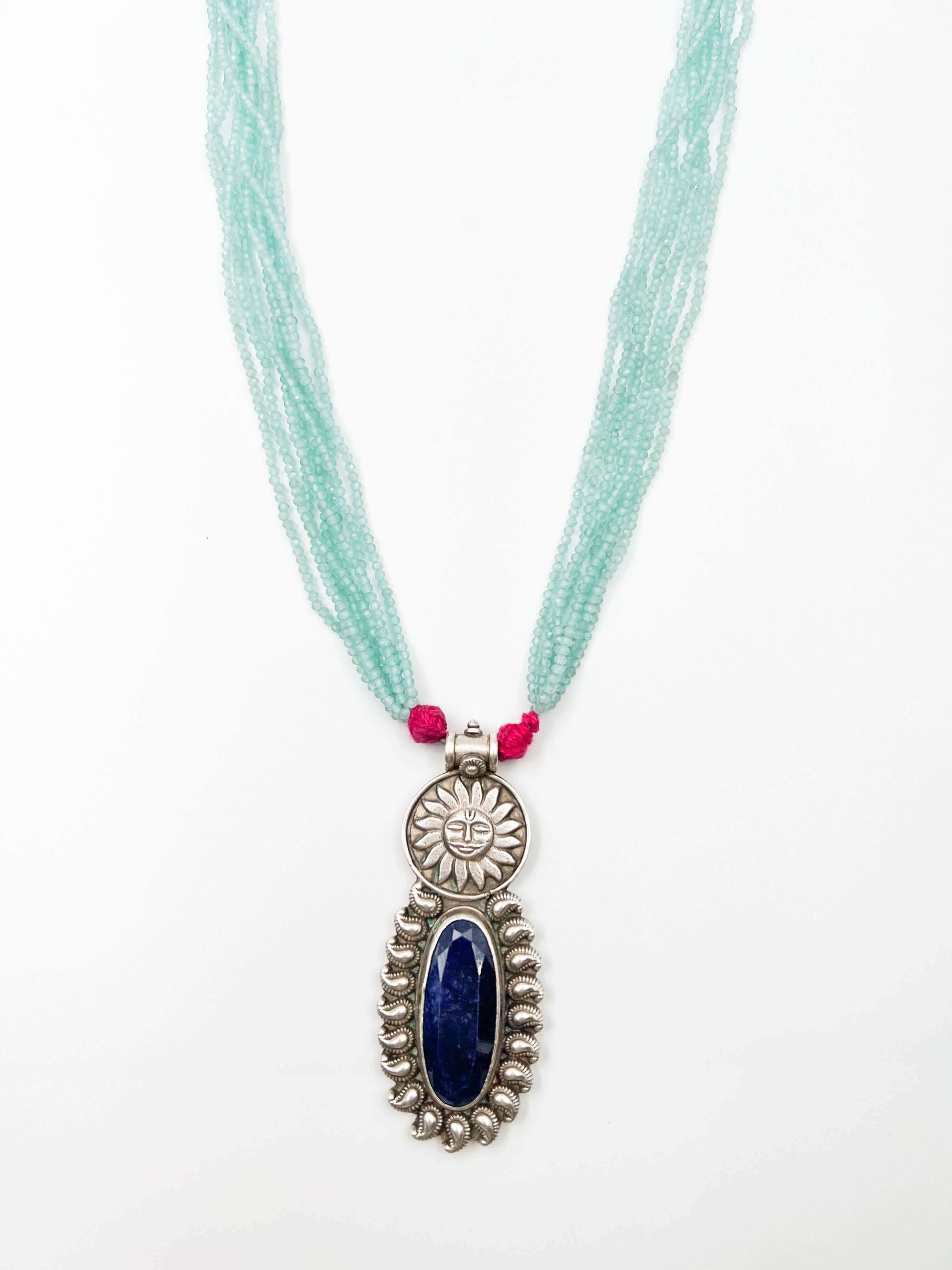 This stunning pendant with lapis lazuli stone as the centre and paisley motif around, will make you stand out of the crowd. It has a glorious sun medallion tukdi attached. The aquamarine bead strands , makes the piece outshine even more.