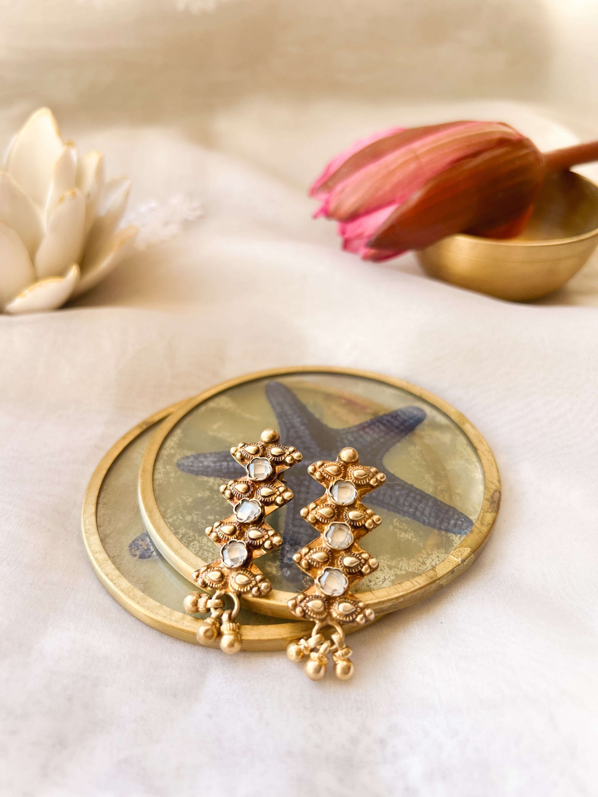 Featuring a unique chevron-like structure, these earrings are sure to catch everyone's attention. These earrings have intricate details engraved on the surface adorned with stunning kundan stones at the center, exuding a regal charm. To add a playful element, delicate ghunghroo hangings dangle at the bottom.