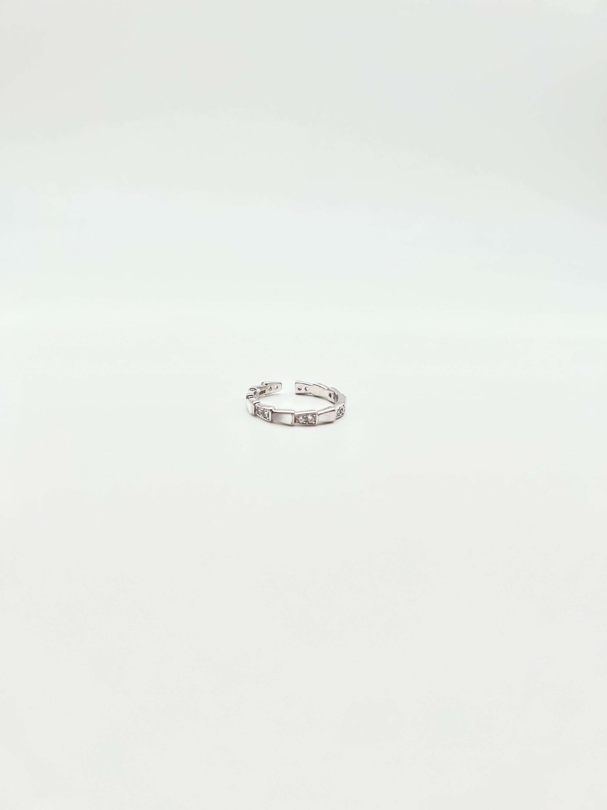 The silver ring features a unique and stylish bamboo-shaped band design. Along the band, zircon and shell stones are embedded in alternate pattern. The zircons add a sparkling brilliance, while the shell stones infuse a hint of iridescent, making it a very elegant piece of jewelry you would love to own.