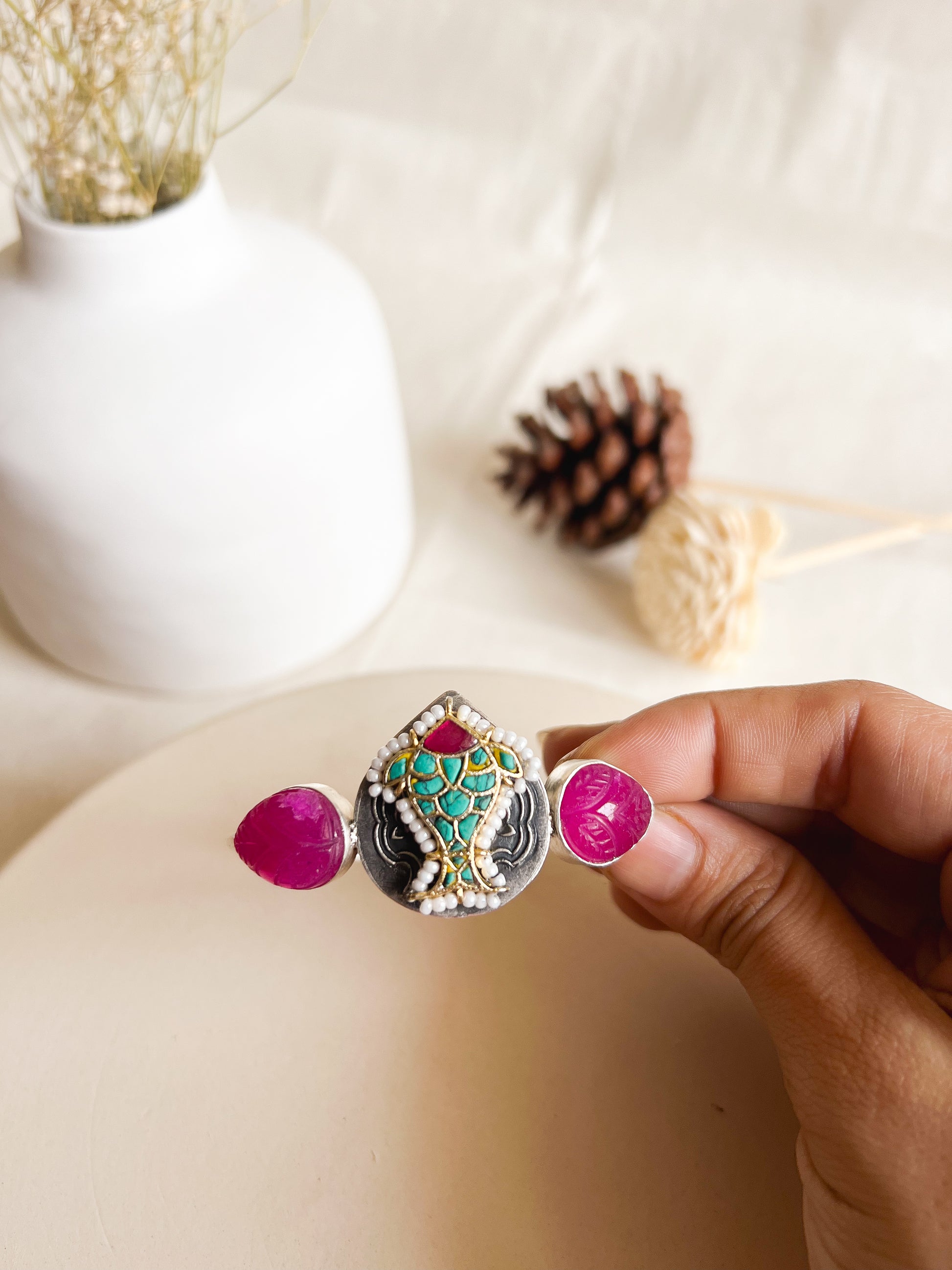 Adjustable kada, adorned with a captivating turq kundan fish at its center and complemented by delicate pink ruby stones on the sides. This stunning piece effortlessly combines traditional elegance with contemporary style. This kada is not only visually appealing but also adjustable to ensure a comfortable fit for all.
