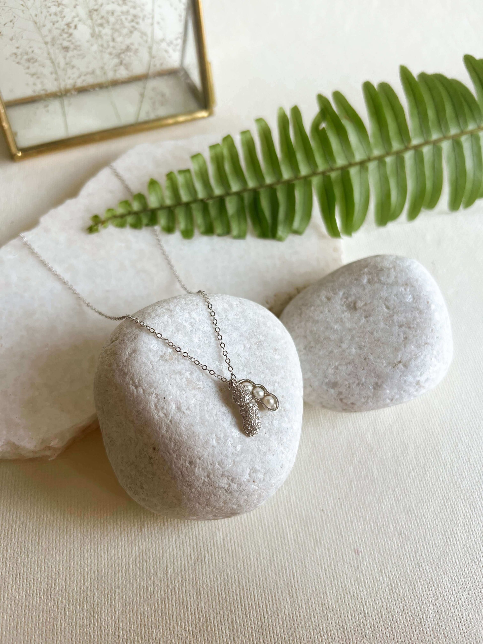 With its one-of-a-kind composition and stunning contrast between the zircon-studded side and the organic pearl seeds, this quirky tamarind pendant on a delicate silver chain is a truly special and cherished addition to any jewelry collection