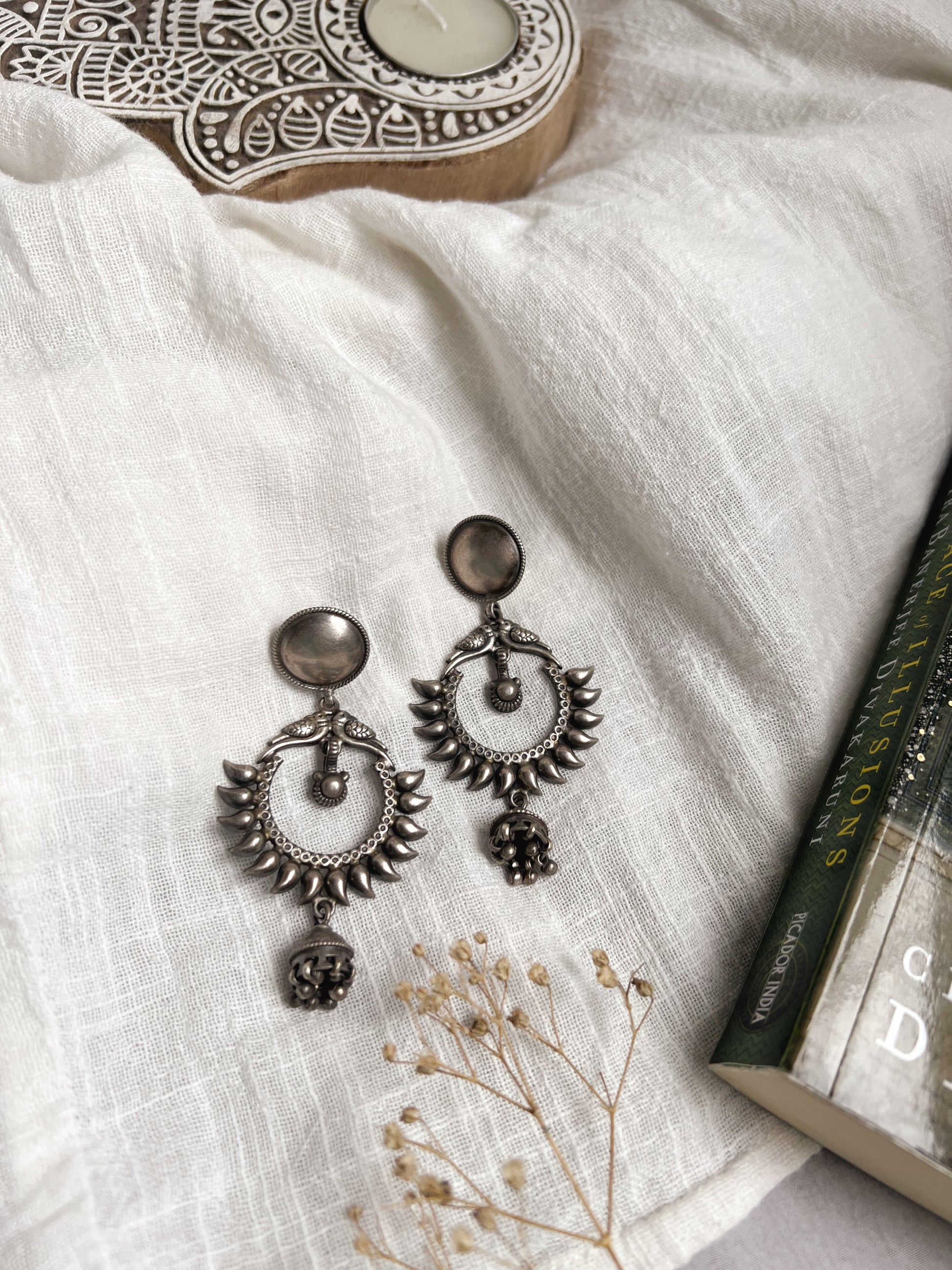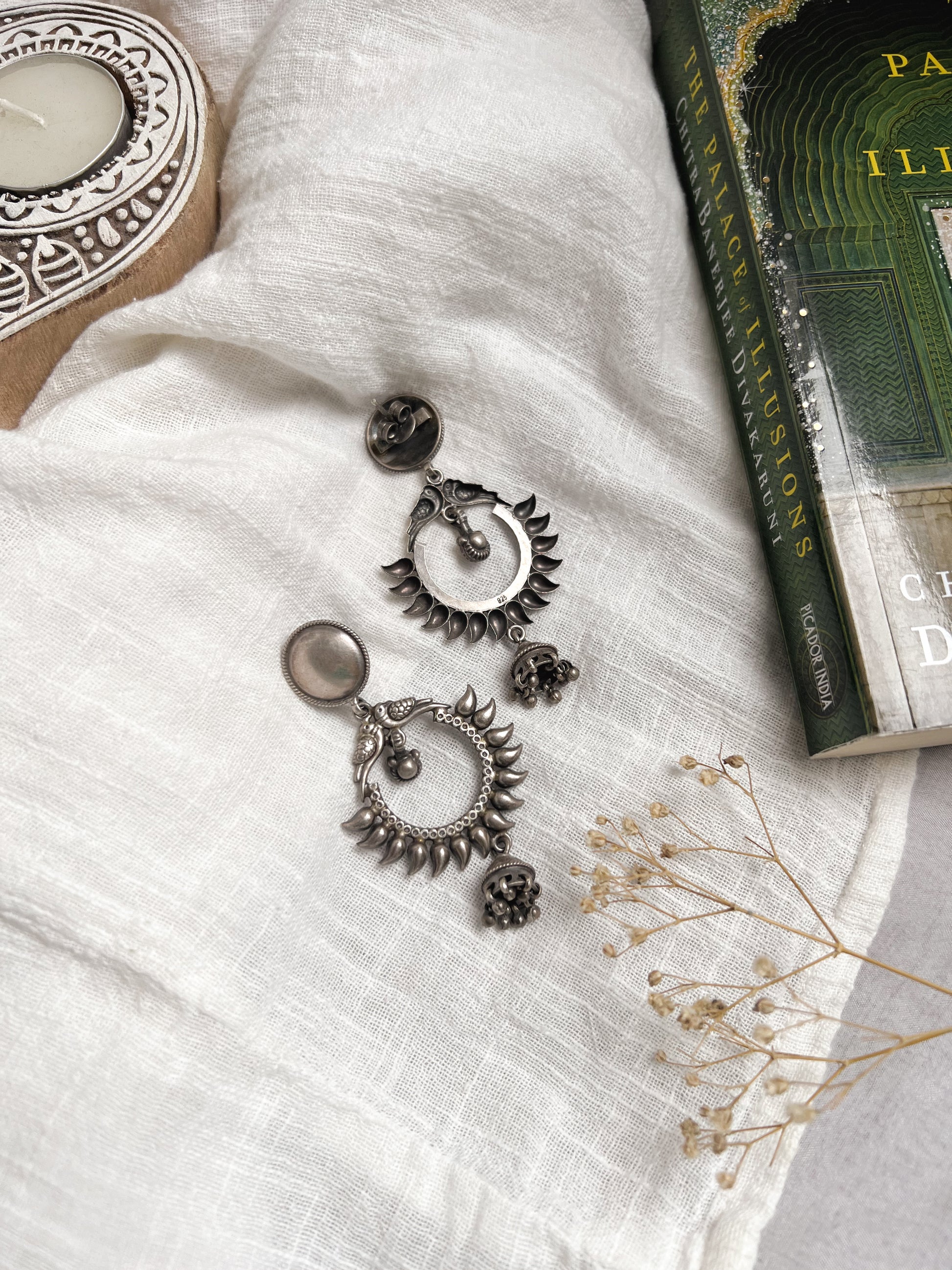 Beautifully crafted earring featuring 2 birds sitting on a circular hoop, with dangling ghungroo. Very lightweight and yet statement piece.